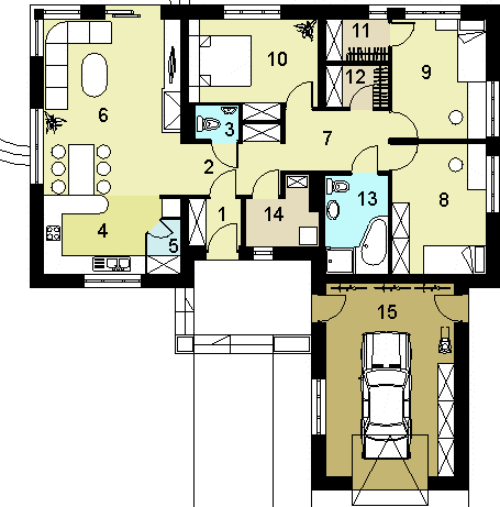 Graficzne opracowanie rzutów poglądowych widocznych na karcie projektu zostało wykonane przez Extradom.pl. Prezentowane przez Extradom.pl wizualizacje wykonane zostały przez autora projektu i należy poczytywać je jedynie za przykład i propozycję wykończenia, wizję architektoniczną autora projektu. Ostateczne wykończenie budynku może nastąpić na wiele sposobów. Szczegółowe rozwiązania zastosowane w oferowanej dokumentacji - w tym również ilość, lokalizacje i wygląd okien, drzwi, kominów - mogą w niewielkim stopniu różnić się od prezentowanej wizualizacji budynku.