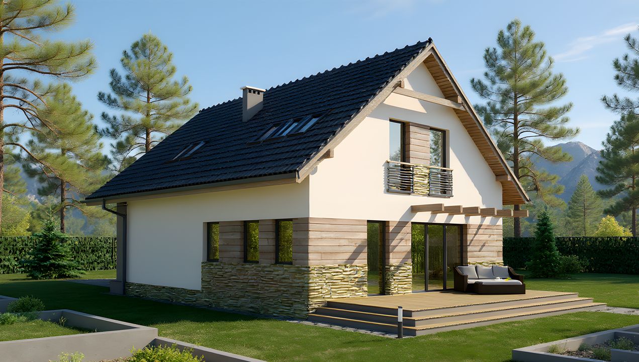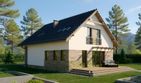 Graficzne opracowanie rzutów poglądowych widocznych na karcie projektu zostało wykonane przez Extradom.pl. Prezentowane przez Extradom.pl wizualizacje wykonane zostały przez autora projektu i należy poczytywać je jedynie za przykład i propozycję wykończenia, wizję architektoniczną autora projektu. Ostateczne wykończenie budynku może nastąpić na wiele sposobów. Szczegółowe rozwiązania zastosowane w oferowanej dokumentacji - w tym również ilość, lokalizacje i wygląd okien, drzwi, kominów - mogą w niewielkim stopniu różnić się od prezentowanej wizualizacji budynku.