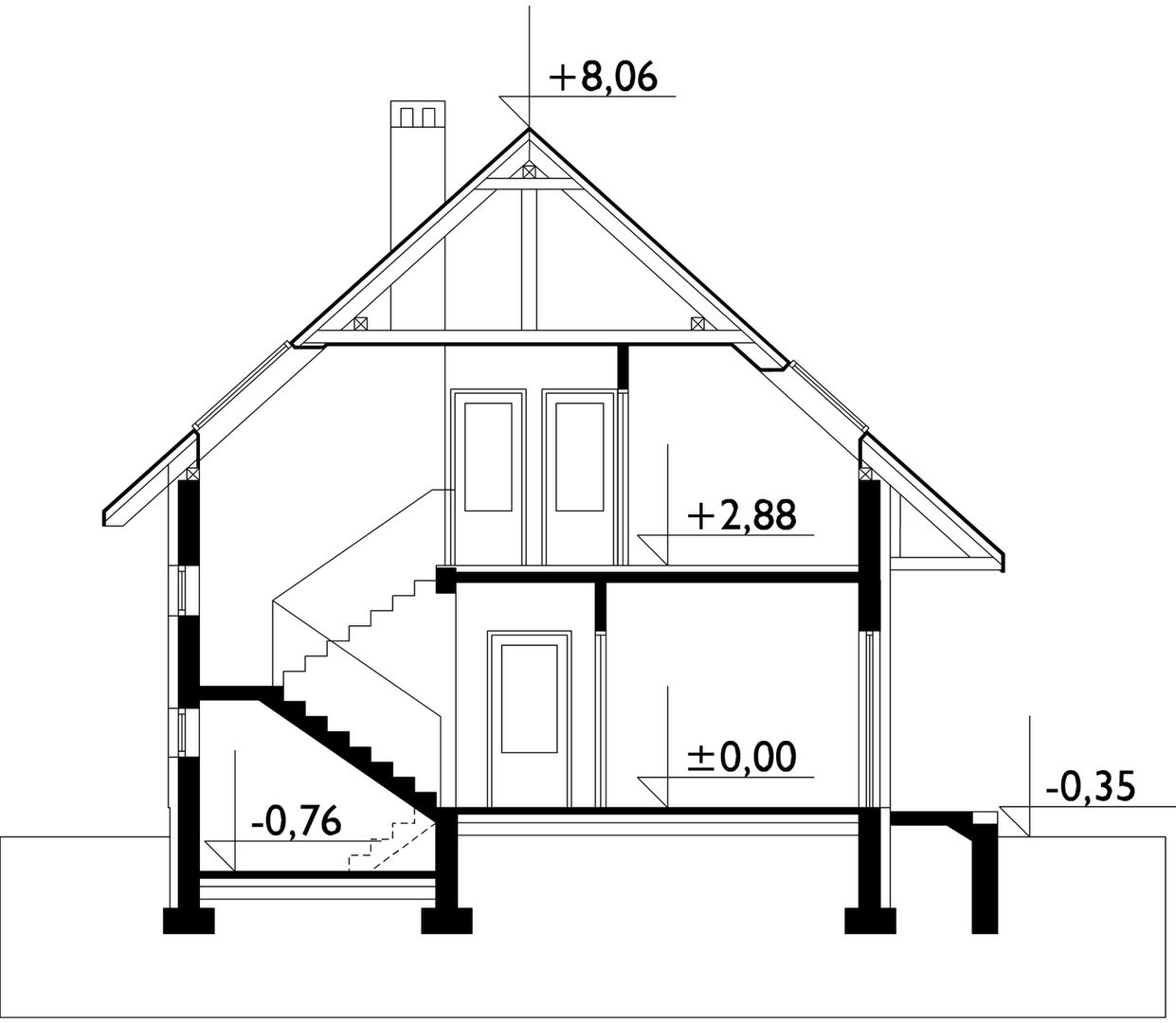 Wersja technologiczna: murowana - ceramika. Izolacja termiczna ścian zewnętrznych: Austrotherm. Strop: żelbetowy monolityczny. Typ schodów: płytowe żelbetowe. Konstrukcja dachu: drewniana krokwiowo-jętkowa. Typ ogrzewania: Kocioł na gaz. Dostępna wersja z pompą ciepła: Tak. Ściany zewnętrzne: 25 cm ceramika. Ściany wewnętrzne: 25 cm ceramika. Ściany wewnętrzne działowe: 11 cm ceramika.