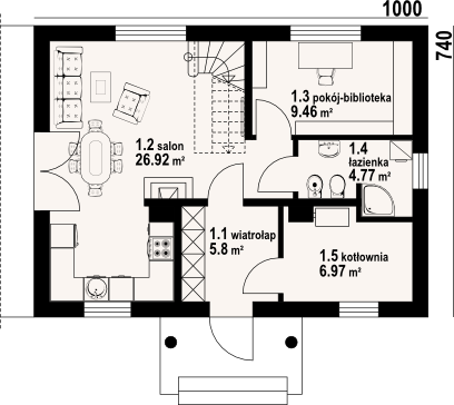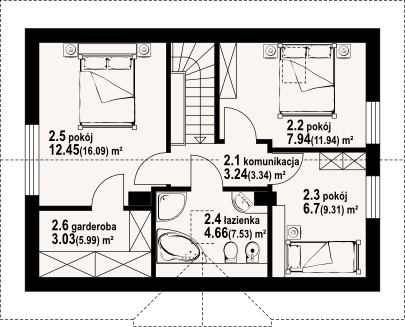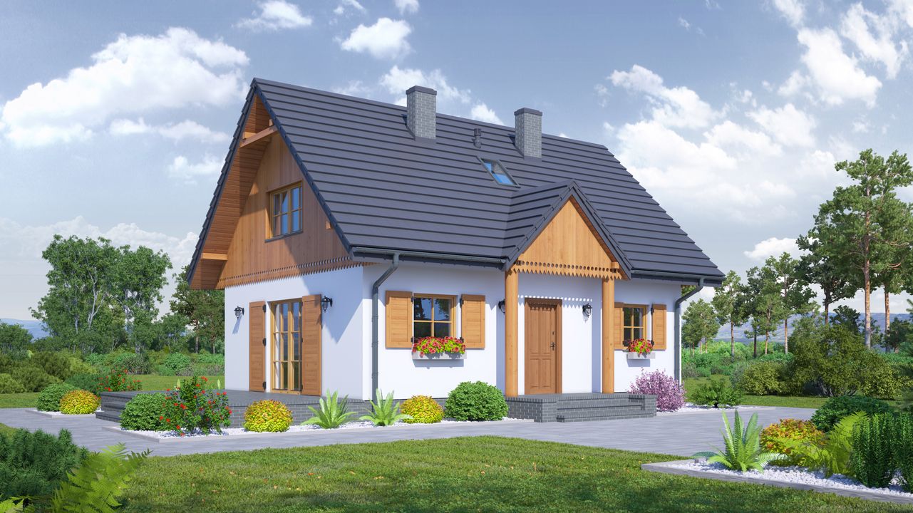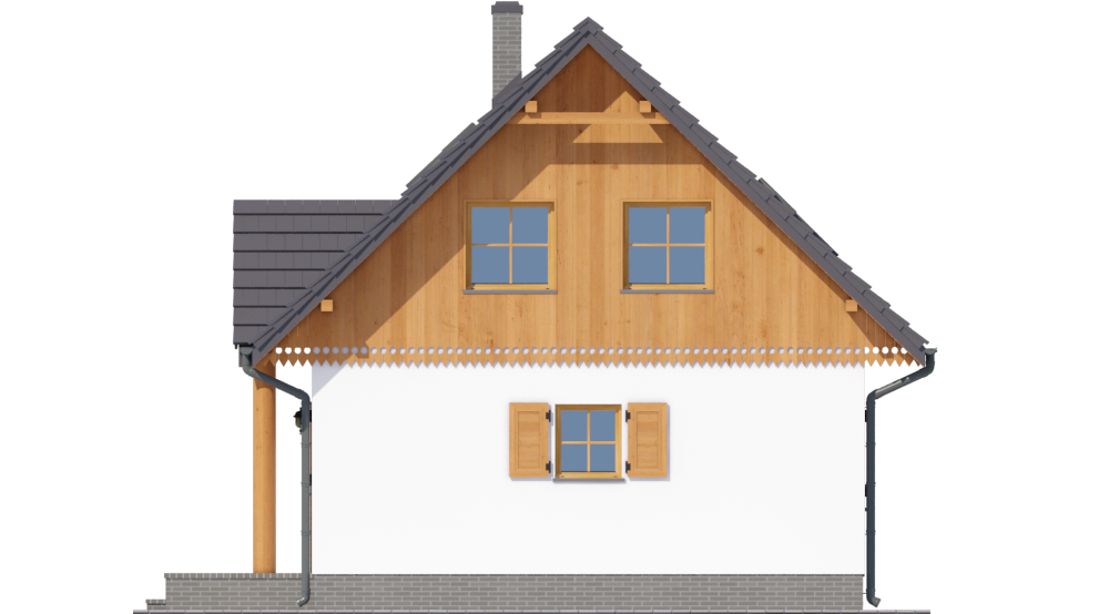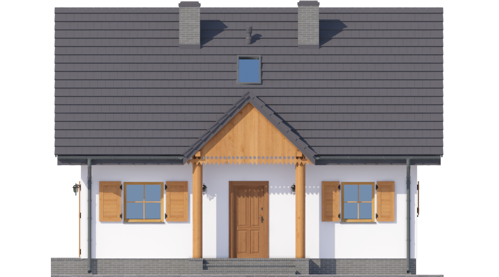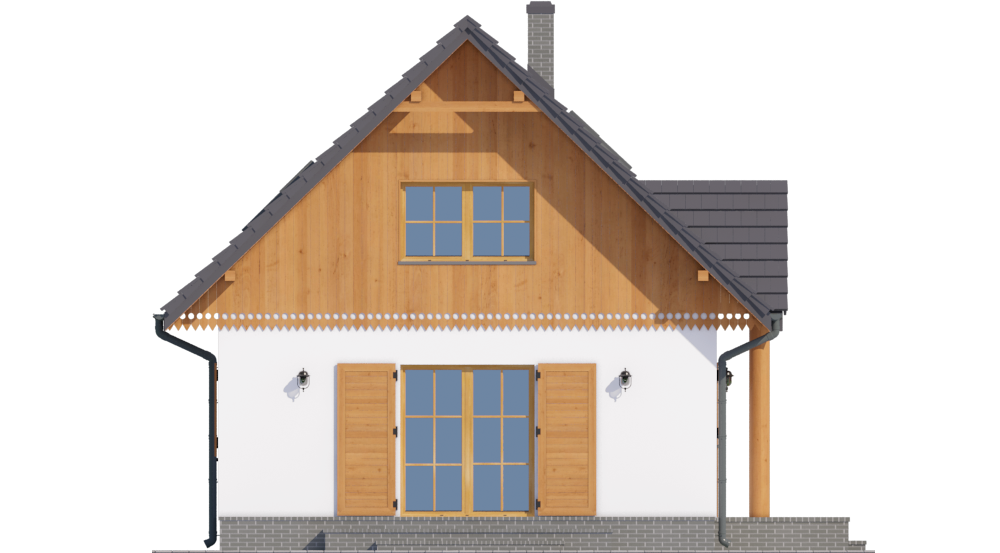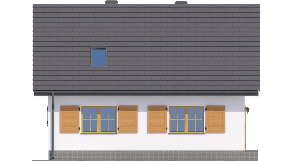 Graficzne opracowanie rzutów poglądowych widocznych na karcie projektu zostało wykonane przez Extradom.pl. Prezentowane przez Extradom.pl wizualizacje wykonane zostały przez autora projektu i należy poczytywać je jedynie za przykład i propozycję wykończenia, wizję architektoniczną autora projektu. Ostateczne wykończenie budynku może nastąpić na wiele sposobów. Szczegółowe rozwiązania zastosowane w oferowanej dokumentacji - w tym również ilość, lokalizacje i wygląd okien, drzwi, kominów - mogą w niewielkim stopniu różnić się od prezentowanej wizualizacji budynku.