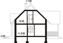 Wysokość ścianki kolankowej: 1.2 m. Strop: płyta żelbetowa. Pokrycie dachu: dachówka ceramiczna Koramic. Ściany zewnętrzne: pustaki ceramiczne Porotherm + styropian. Ściany wewnętrzne: pustaki ceramiczne Porotherm. Typ ogrzewania: pompa ciepła. Inne: okna dachowe Fakro Greenview.