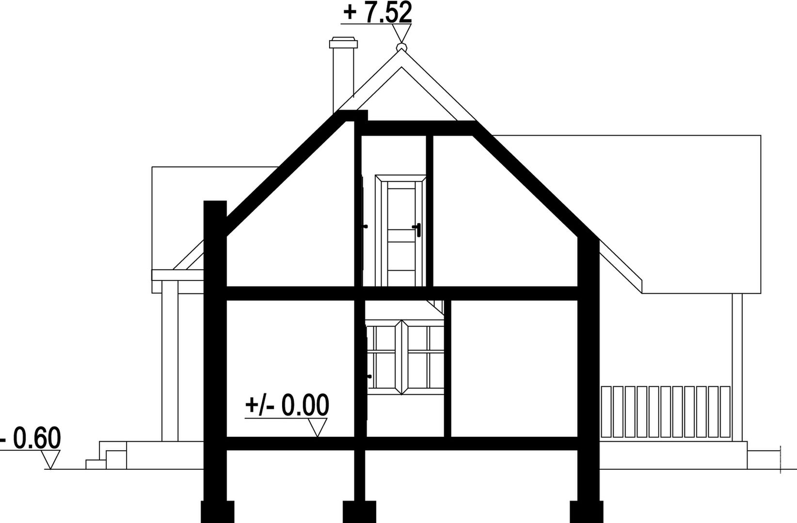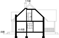 Wysokość ścianki kolankowej: 0.96 m. Strop: płyta żelbetowa. Pokrycie dachu: dachówka ceramiczna Koramic. Ściany zewnętrzne: pustaki ceramiczne Porotherm + styropian. Ściany wewnętrzne: pustaki ceramiczne Porotherm. Typ ogrzewania: kocioł gazowy lub kocioł na paliwo stałe.