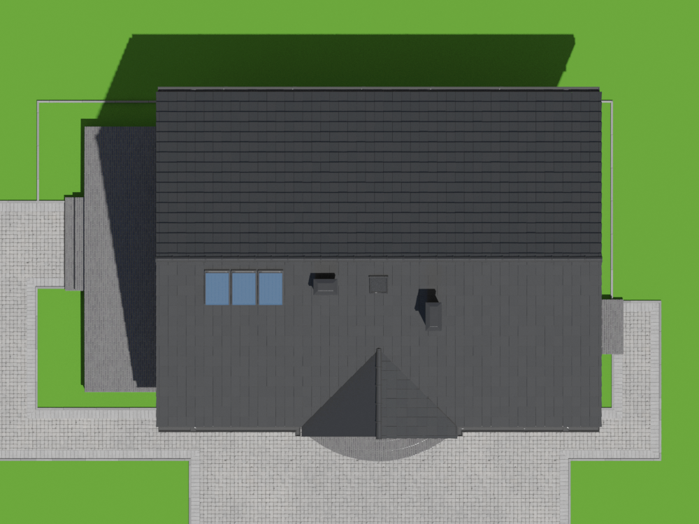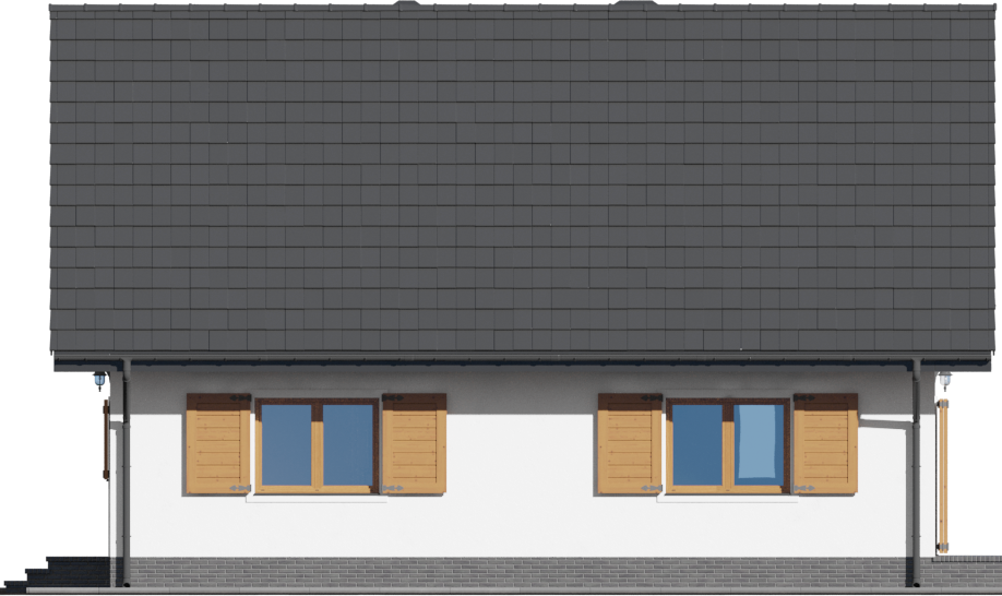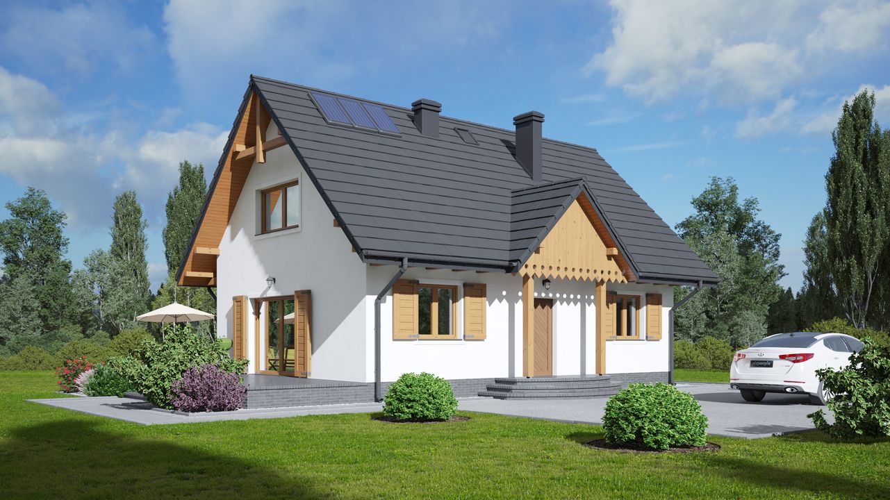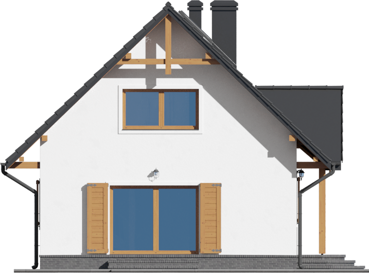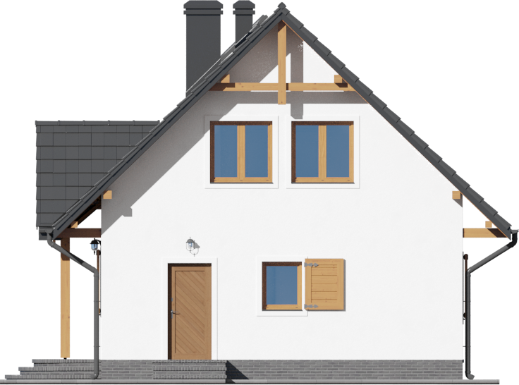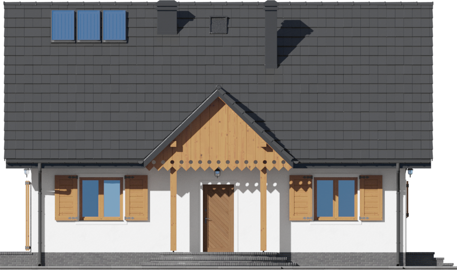 Graficzne opracowanie rzutów poglądowych widocznych na karcie projektu zostało wykonane przez Extradom.pl. Prezentowane przez Extradom.pl wizualizacje wykonane zostały przez autora projektu i należy poczytywać je jedynie za przykład i propozycję wykończenia, wizję architektoniczną autora projektu. Ostateczne wykończenie budynku może nastąpić na wiele sposobów. Szczegółowe rozwiązania zastosowane w oferowanej dokumentacji - w tym również ilość, lokalizacje i wygląd okien, drzwi, kominów - mogą w niewielkim stopniu różnić się od prezentowanej wizualizacji budynku.