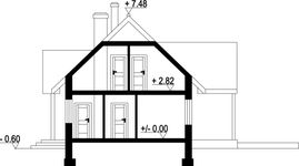 Wysokość ścianki kolankowej: 0.91 m. Strop: płyta żelbetowa. Pokrycie dachu: dachówka ceramiczna Koramic. Ściany zewnętrzne: pustaki ceramiczne Porotherm + styropian. Ściany wewnętrzne: pustaki ceramiczne Porotherm. Typ ogrzewania: kocioł gazowy lub kocioł na paliwo stałe. Inne: okna połaciowe Fakro.