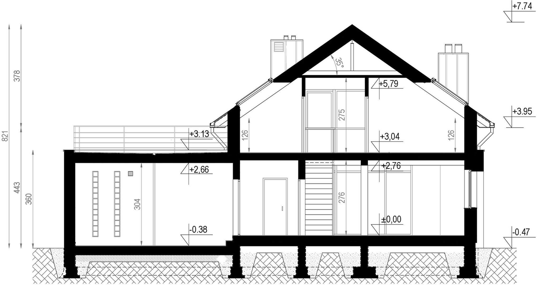 Fundamenty: tradycyjne - na ławach fundamentowych. Strop: żelbetowy wylewany. Ściany: dwuwarstwowe - pustak ceramiczny 25 cm + styropian Termo Organika 20 cm/wełna mineralna 17 cm. Dach: tradycyjna więźba dachowa pokryta blachą tytanowo-cynkową, okna dachowe FAKRO. Elewacja: płyty elewacyjne HPL połączone z tynkiem i deskami elewacyjnymi - modrzew syberyjski. Ogrzewanie: gazowe - piec kondensacyjny. Grzejniki kanałowe przy dużych przeszkleniach na parterze oraz tradycyjne grzejniki w pozostałych pomieszczeniach. Wentylacja: mechaniczna z rekuperacją.