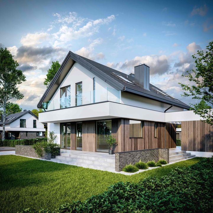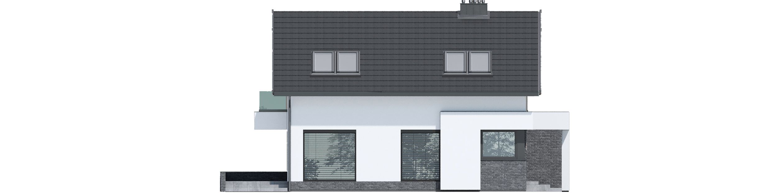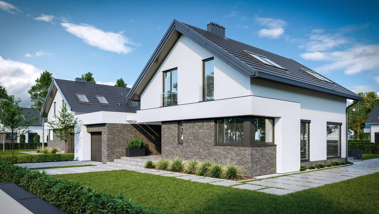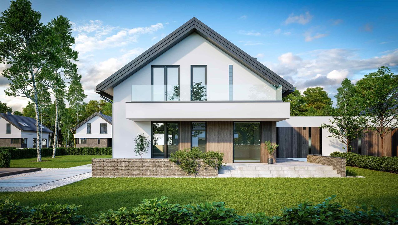 Graficzne opracowanie rzutów poglądowych widocznych na karcie projektu zostało wykonane przez Extradom.pl. Prezentowane przez Extradom.pl wizualizacje wykonane zostały przez autora projektu i należy poczytywać je jedynie za przykład i propozycję wykończenia, wizję architektoniczną autora projektu. Ostateczne wykończenie budynku może nastąpić na wiele sposobów. Szczegółowe rozwiązania zastosowane w oferowanej dokumentacji - w tym również ilość, lokalizacje i wygląd okien, drzwi, kominów - mogą w niewielkim stopniu różnić się od prezentowanej wizualizacji budynku.
