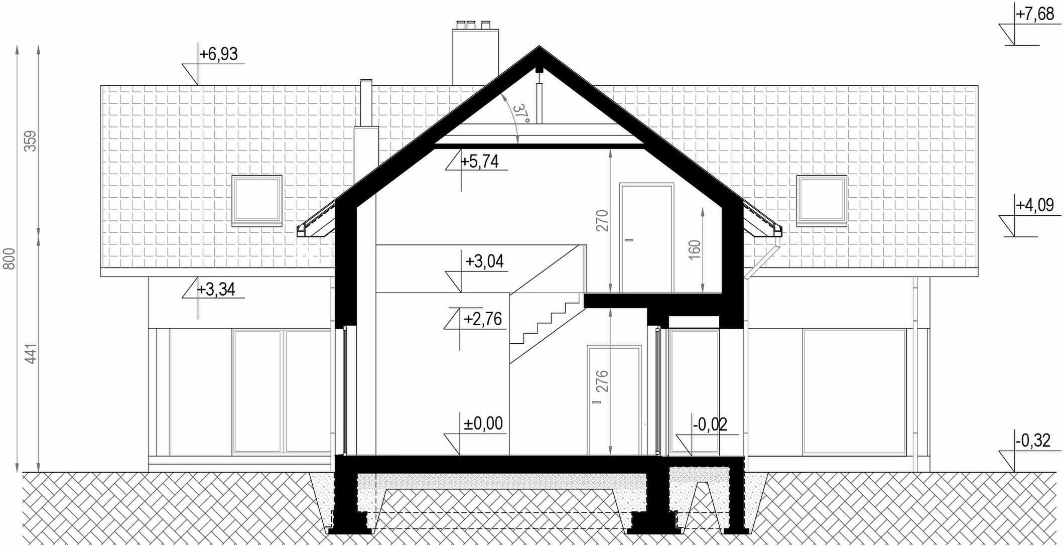Fundamenty: tradycyjne - na ławach fundamentowych. Ściany: dwuwartstwowe - pustak ceramiczny 25 cm + styropian 15 cm/wełna mineralna 12 cm. Stropy: żelbetowe wylewane schody dwubiegowe żelbetowe dach tradycyjna więźba dachowa pokryta dachówką ceramiczną lub cementową. Elewacja: drewno elewacyjne thermory thermo sosna skandynawska firmy komplex market połączone z tynkiem. Ogrzewanie: gazowe - piec kondensacyjny. grzejniki kanałowe przy dużych przeszkleniach na parterze oraz tradycyjne grzejniki w pozostałych pomieszczeniac. Wentylacja grawitacyjna.