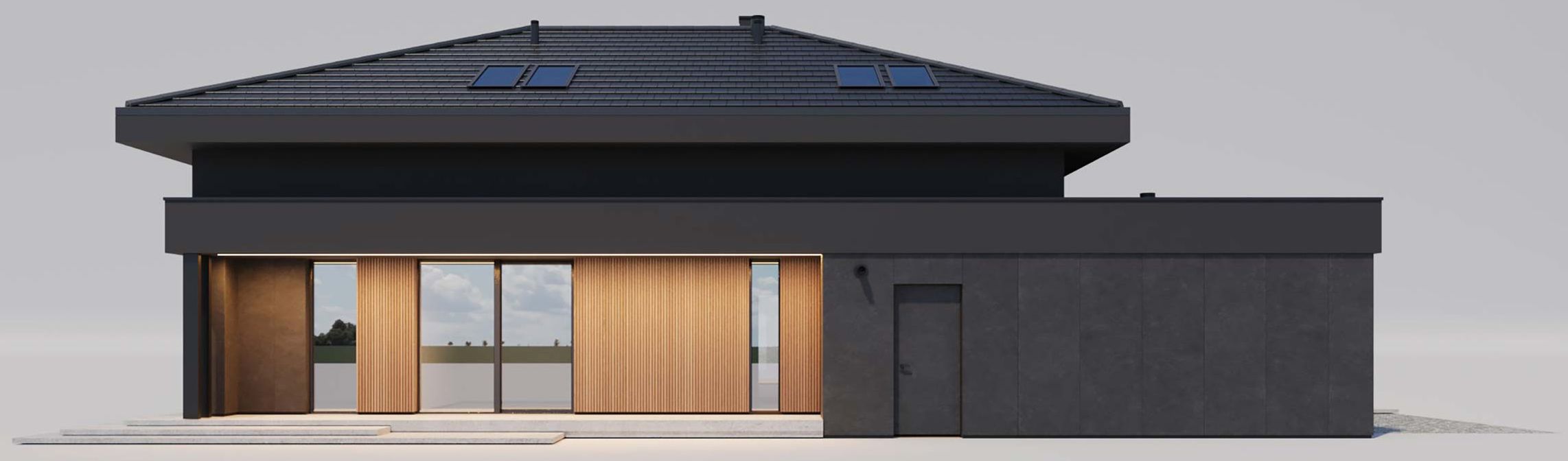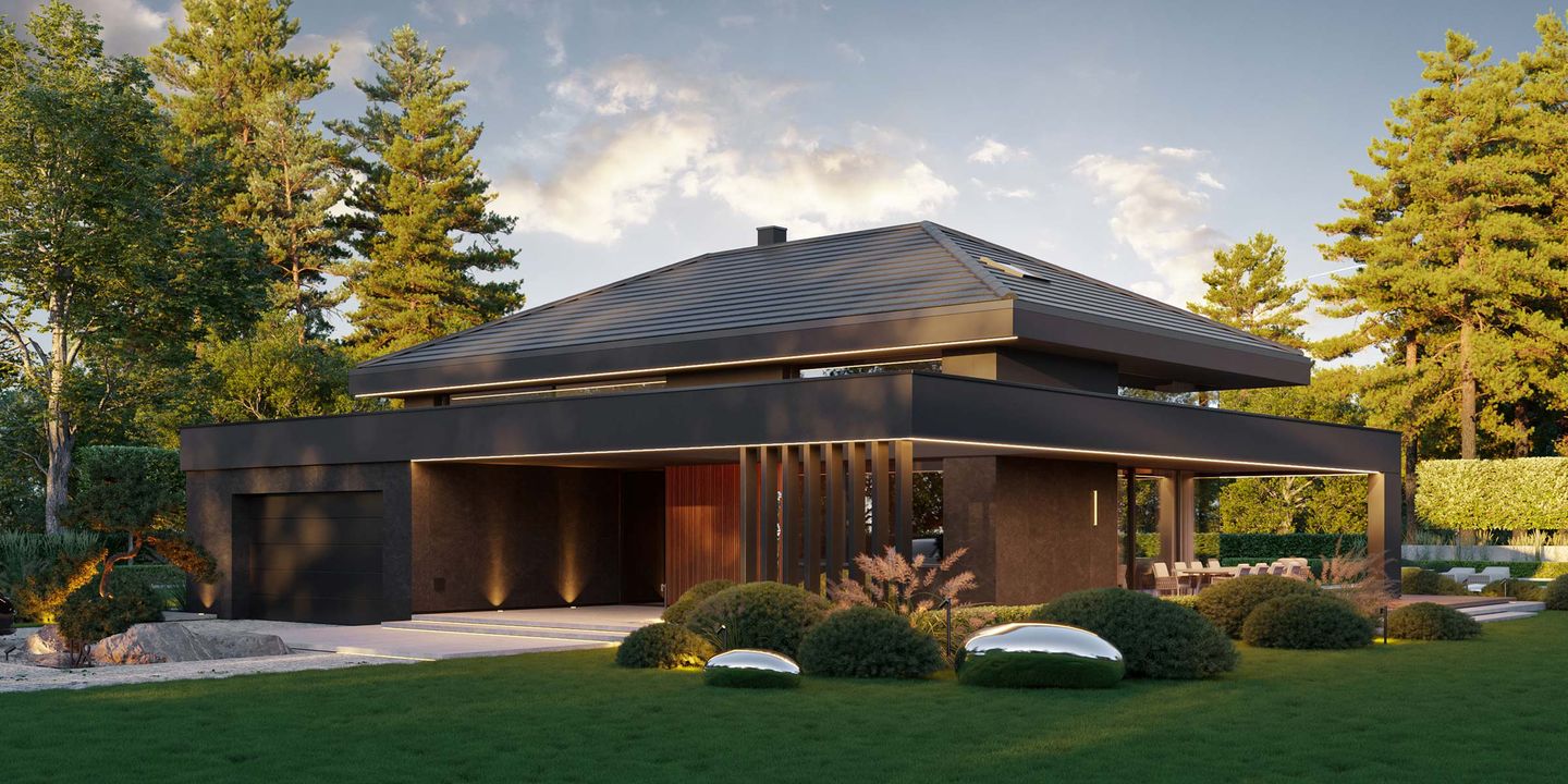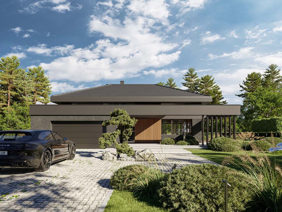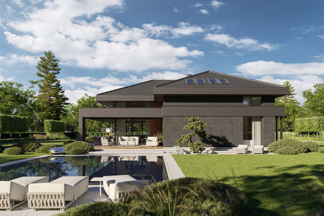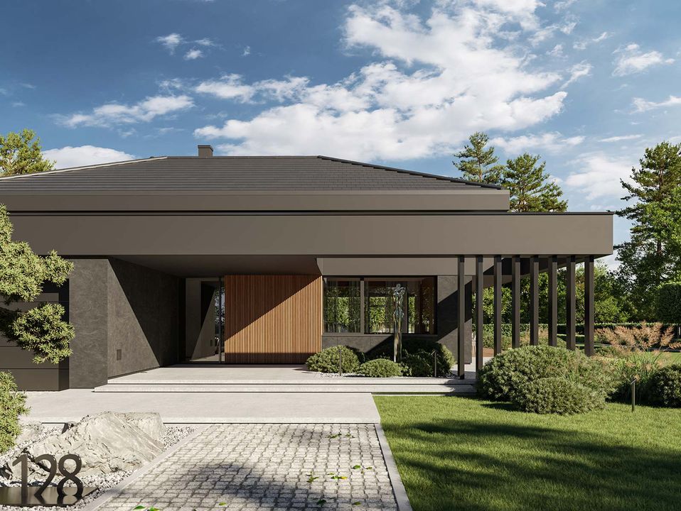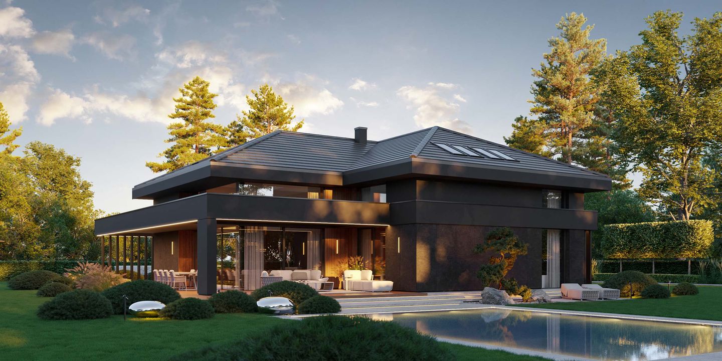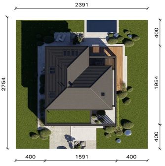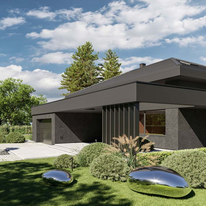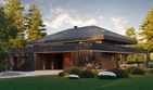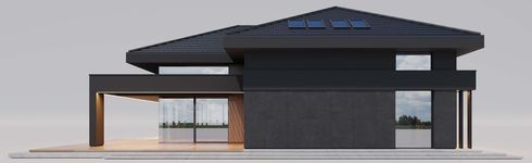 Graficzne opracowanie rzutów poglądowych widocznych na karcie projektu zostało wykonane przez Extradom.pl. Prezentowane przez Extradom.pl wizualizacje wykonane zostały przez autora projektu i należy poczytywać je jedynie za przykład i propozycję wykończenia, wizję architektoniczną autora projektu. Ostateczne wykończenie budynku może nastąpić na wiele sposobów. Szczegółowe rozwiązania zastosowane w oferowanej dokumentacji - w tym również ilość, lokalizacje i wygląd okien, drzwi, kominów - mogą w niewielkim stopniu różnić się od prezentowanej wizualizacji budynku.