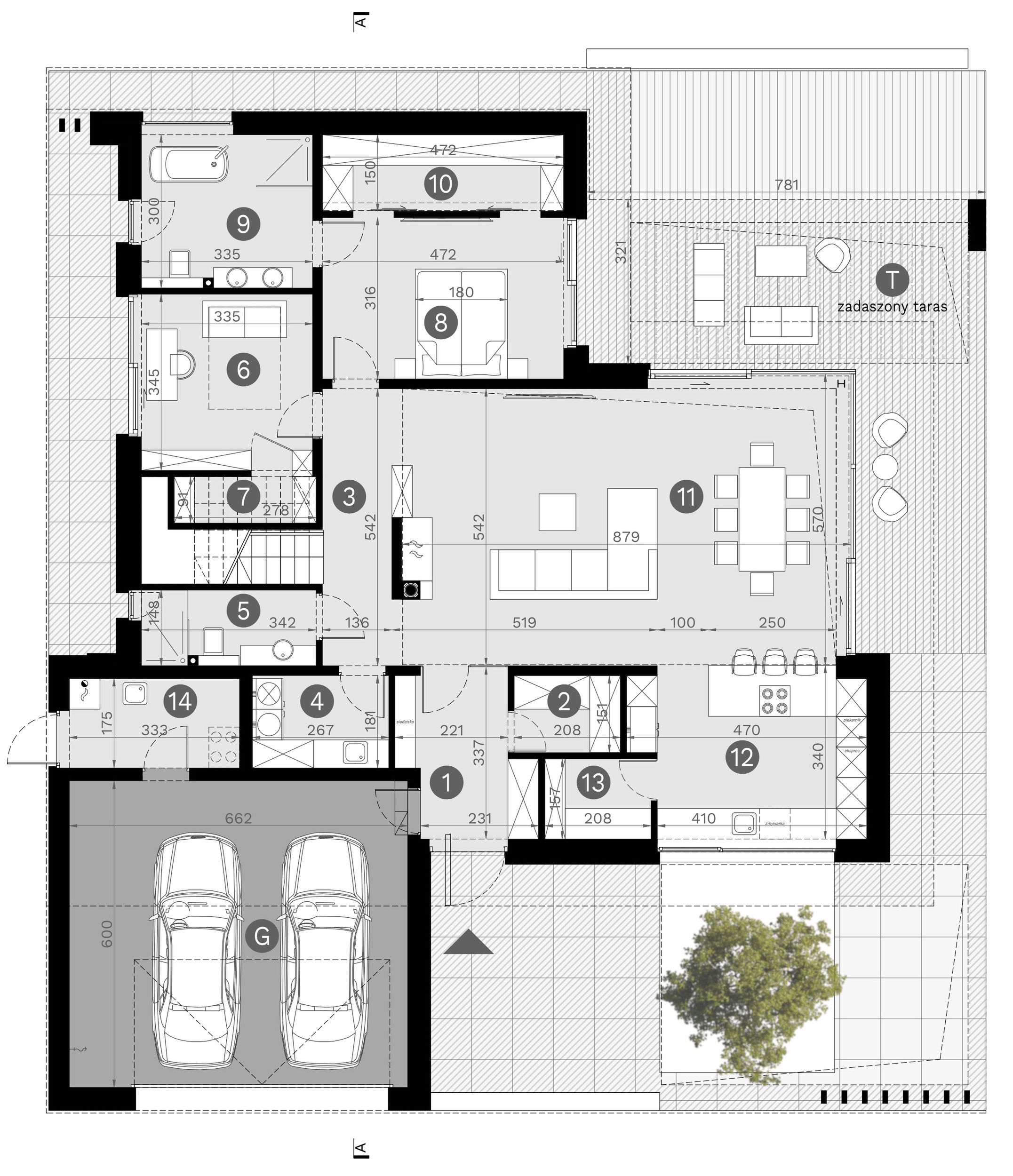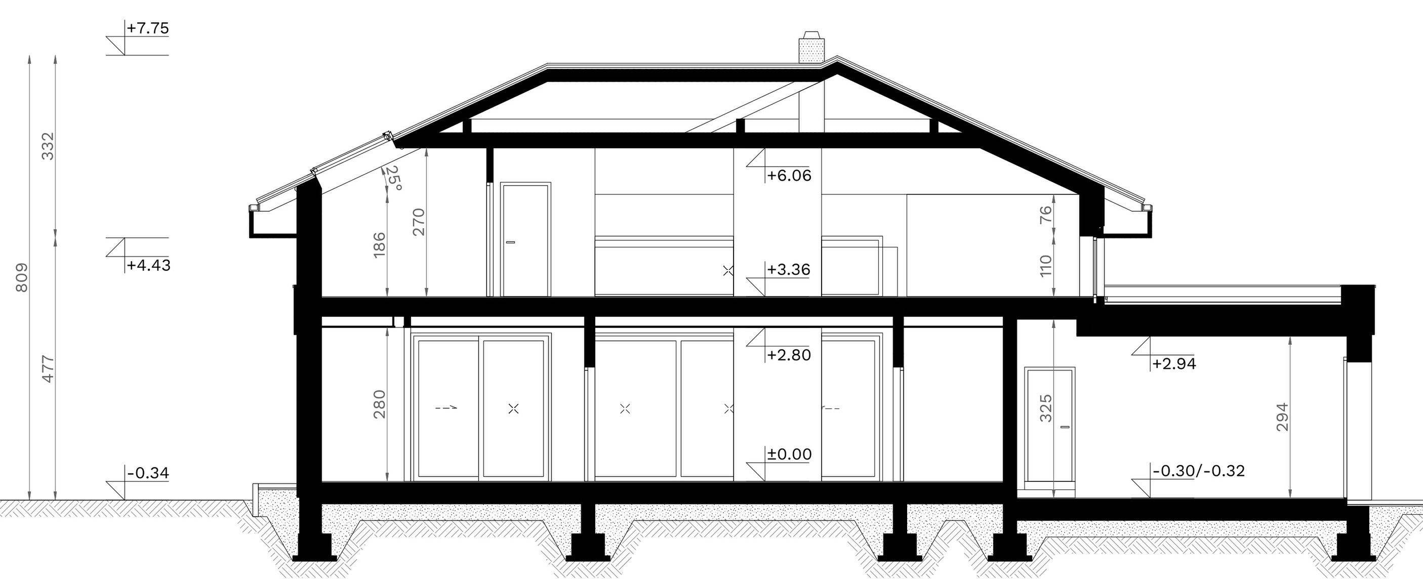 Fundamenty: tradycyjne - na ławach fundamentowych. Strop: żelbetowy wylewany. Ściany: dwuwarstwowe - pustak ceramiczny 25 cm + styropian Termo Organika 20 cm/wełna mineralna 18 cm. Dach: czterospadowy kryty dachówką ceramiczną lub cementową swissporTON, stropodach pełny kryty membraną EPDM. Elewacja: tynk silikonowy połączony z deskami elewacyjnymi lamelowymi oraz spiekiem kwarcowym. Ogrzewanie: gazowe - piec kondensacyjny oraz ogrzewanie podłogowe w całym domu, dodatkowo w łazienkach tradycyjne grzejniki typu ręcznikowiec. Wentylacja: mechaniczna z rekuperacją. Rolety podtynkowe: żaluzje fasadowe.