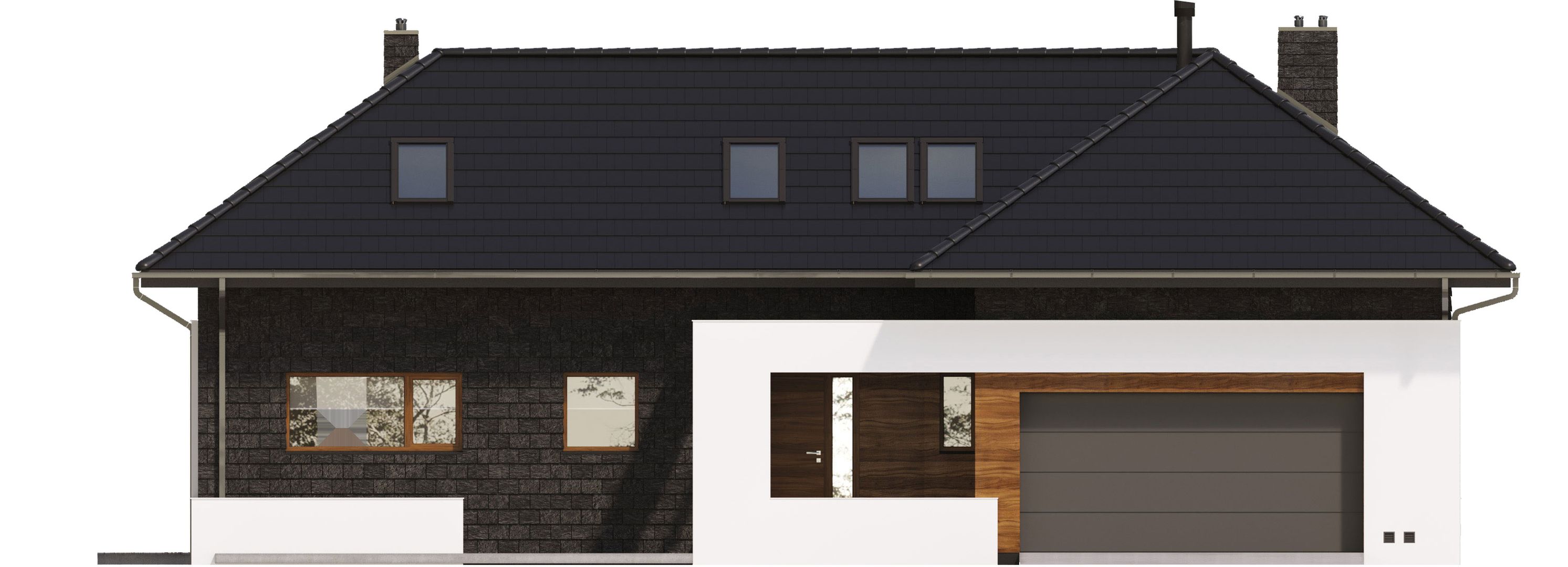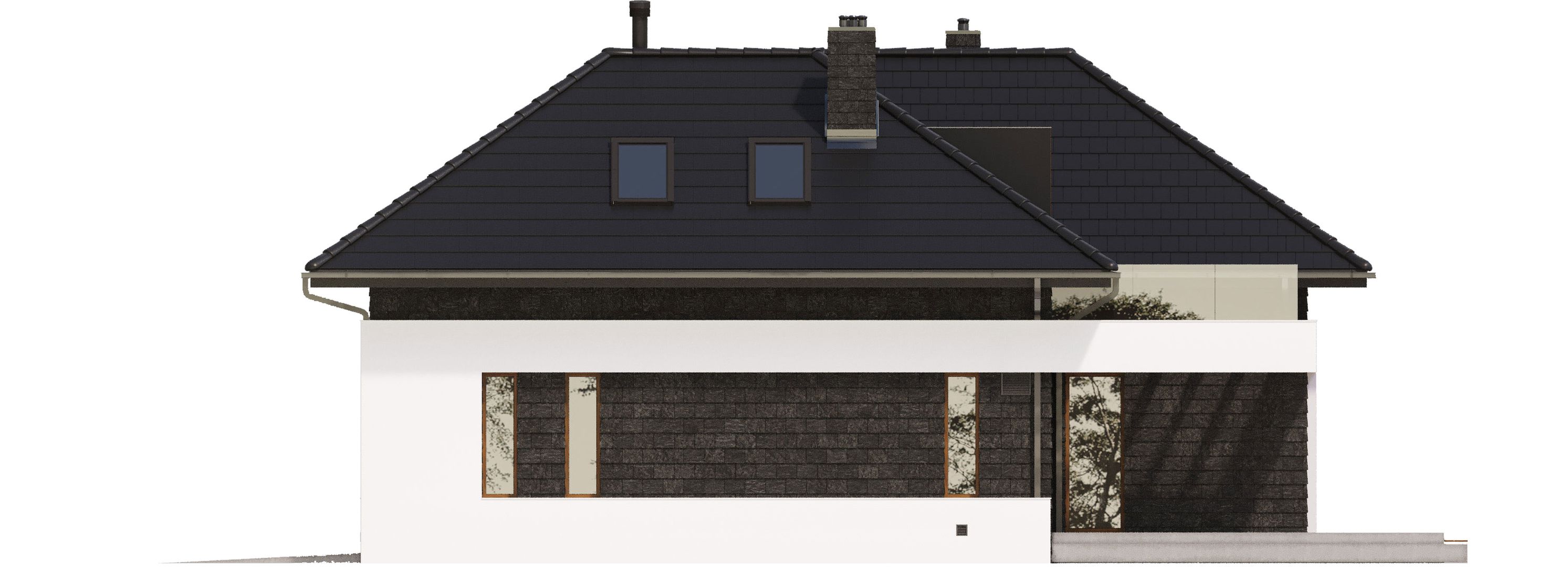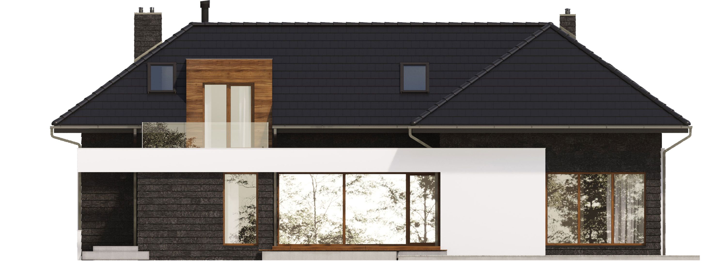 Graficzne opracowanie rzutów poglądowych widocznych na karcie projektu zostało wykonane przez Extradom.pl. Prezentowane przez Extradom.pl wizualizacje wykonane zostały przez autora projektu i należy poczytywać je jedynie za przykład i propozycję wykończenia, wizję architektoniczną autora projektu. Ostateczne wykończenie budynku może nastąpić na wiele sposobów. Szczegółowe rozwiązania zastosowane w oferowanej dokumentacji - w tym również ilość, lokalizacje i wygląd okien, drzwi, kominów - mogą w niewielkim stopniu różnić się od prezentowanej wizualizacji budynku.