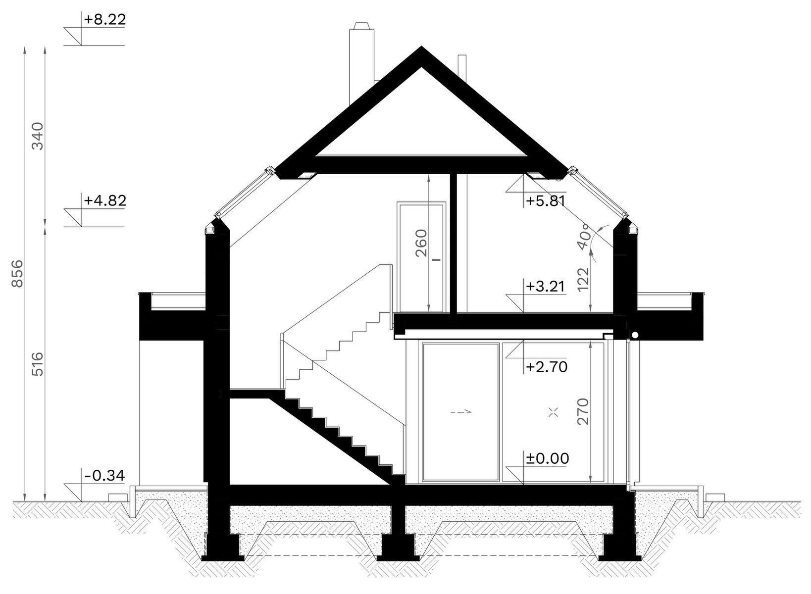 Fundamenty: tradycyjne - na ławach fundamentowych. Strop: żelbetowy wylewany. Ściany: dwuwarstwowe - pustak ceramiczny 25 cm + styropian Termo Organika 20 cm/wełna mineralna 18 cm. Dach: dwuspadowy kryty dachówką ceramiczną lub cementową swissporTON wraz z systemem fotowoltaicznym CREATON VARIO, okna dachowe FAKRO. Elewacja: tynk silikonowy połączony z deską elewacyjną lamelową. Ogrzewanie: gazowe - piec kondensacyjny oraz ogrzewanie podłogowe w całym domu, dodatkowo w łazienkach tradycyjne grzejniki typu ręcznikowiec. Wentylacja: mechaniczna z rekuperacją. Rolety podtynkowe: tak – rozwiązania firmy ALUPROF.