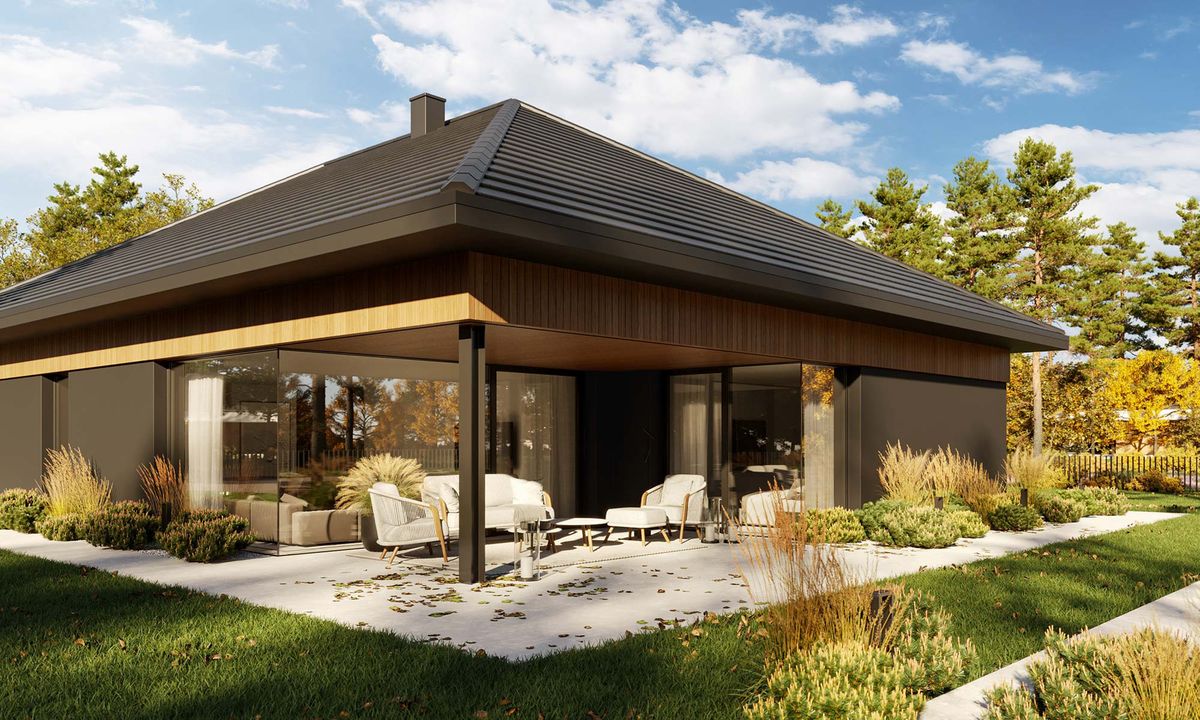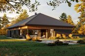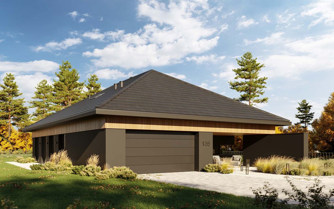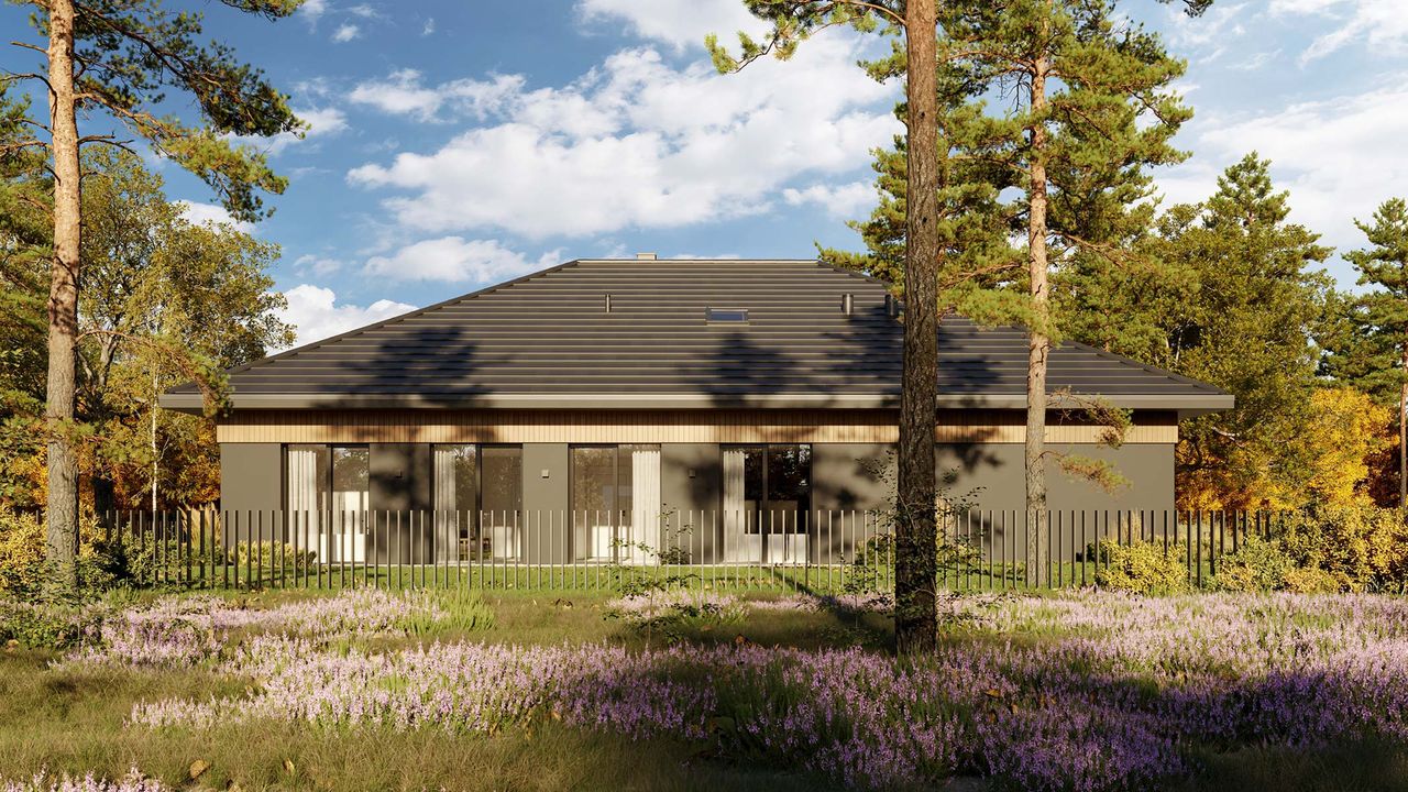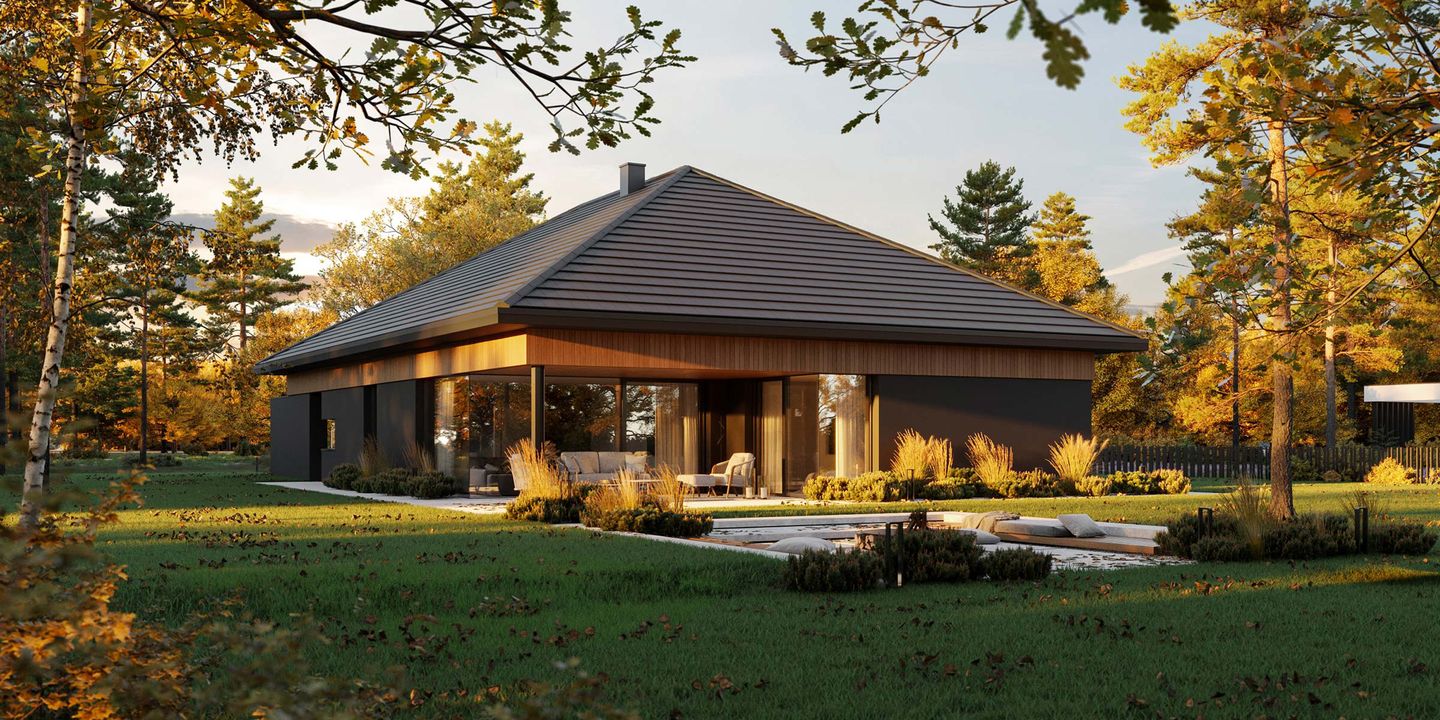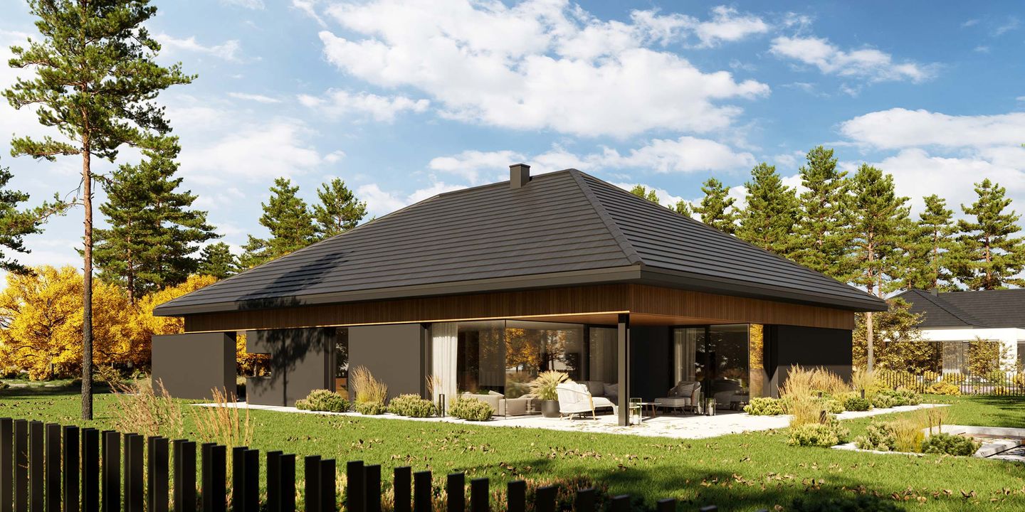 Graficzne opracowanie rzutów poglądowych widocznych na karcie projektu zostało wykonane przez Extradom.pl. Prezentowane przez Extradom.pl wizualizacje wykonane zostały przez autora projektu i należy poczytywać je jedynie za przykład i propozycję wykończenia, wizję architektoniczną autora projektu. Ostateczne wykończenie budynku może nastąpić na wiele sposobów. Szczegółowe rozwiązania zastosowane w oferowanej dokumentacji - w tym również ilość, lokalizacje i wygląd okien, drzwi, kominów - mogą w niewielkim stopniu różnić się od prezentowanej wizualizacji budynku.