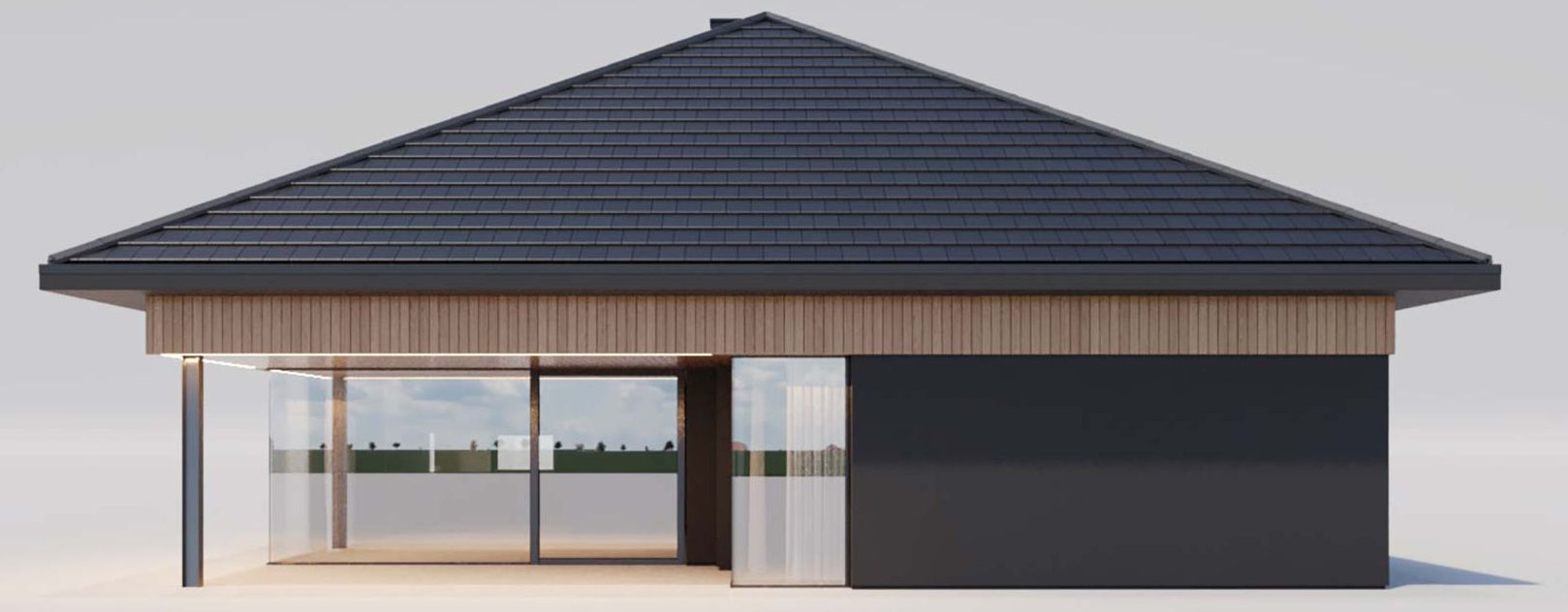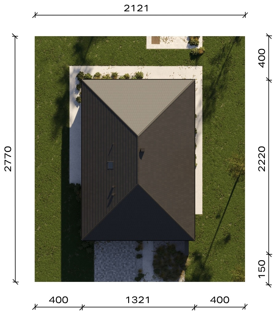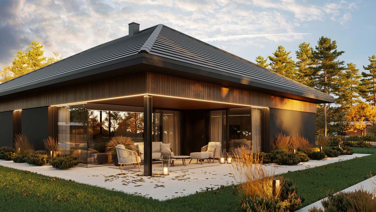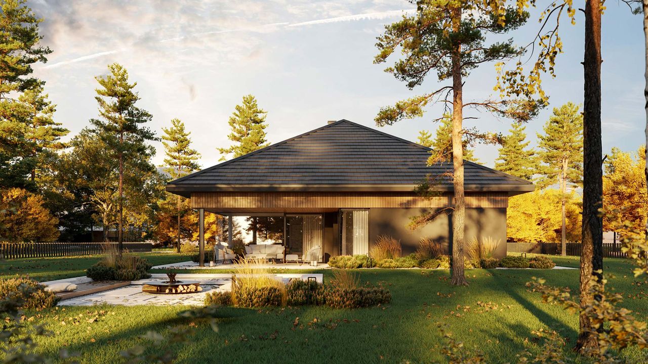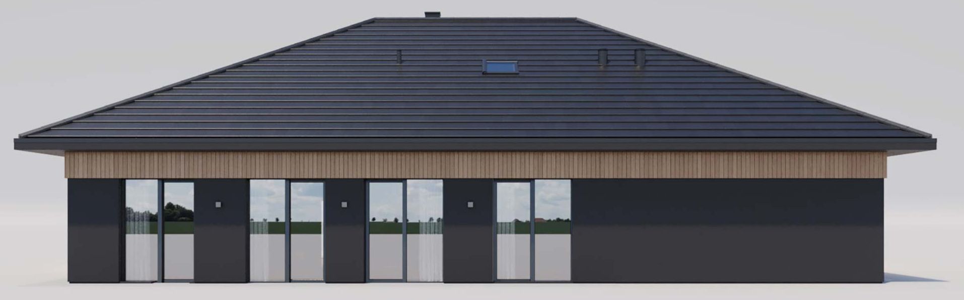 Graficzne opracowanie rzutów poglądowych widocznych na karcie projektu zostało wykonane przez Extradom.pl. Prezentowane przez Extradom.pl wizualizacje wykonane zostały przez autora projektu i należy poczytywać je jedynie za przykład i propozycję wykończenia, wizję architektoniczną autora projektu. Ostateczne wykończenie budynku może nastąpić na wiele sposobów. Szczegółowe rozwiązania zastosowane w oferowanej dokumentacji - w tym również ilość, lokalizacje i wygląd okien, drzwi, kominów - mogą w niewielkim stopniu różnić się od prezentowanej wizualizacji budynku.