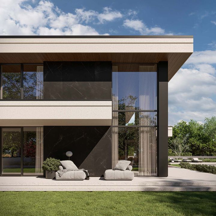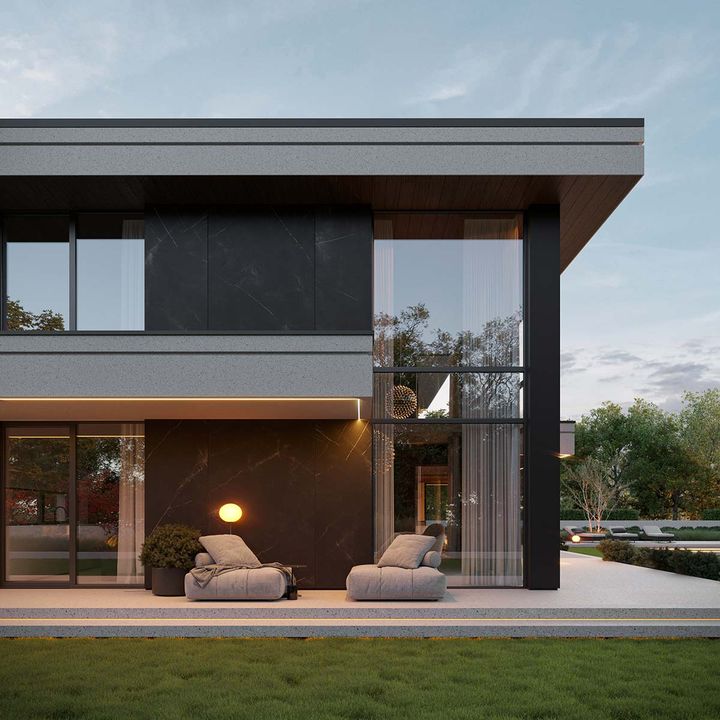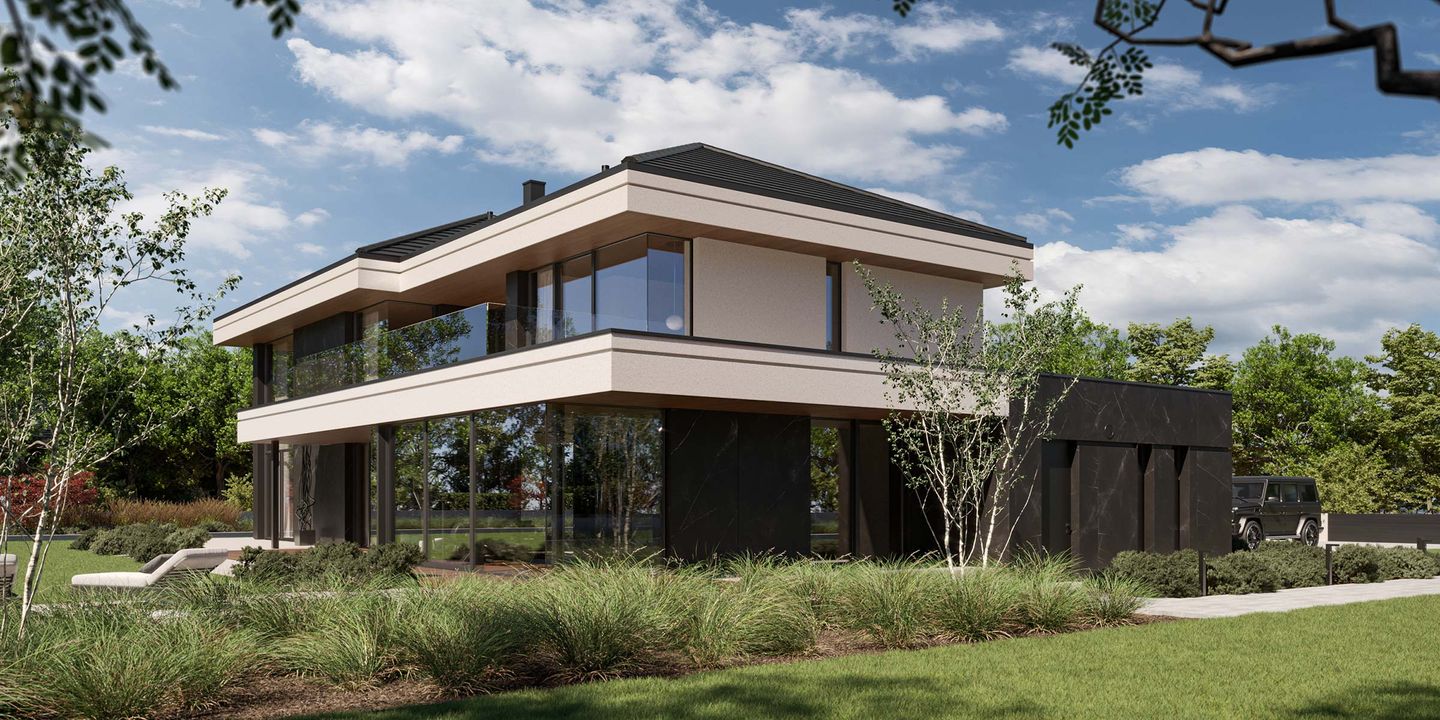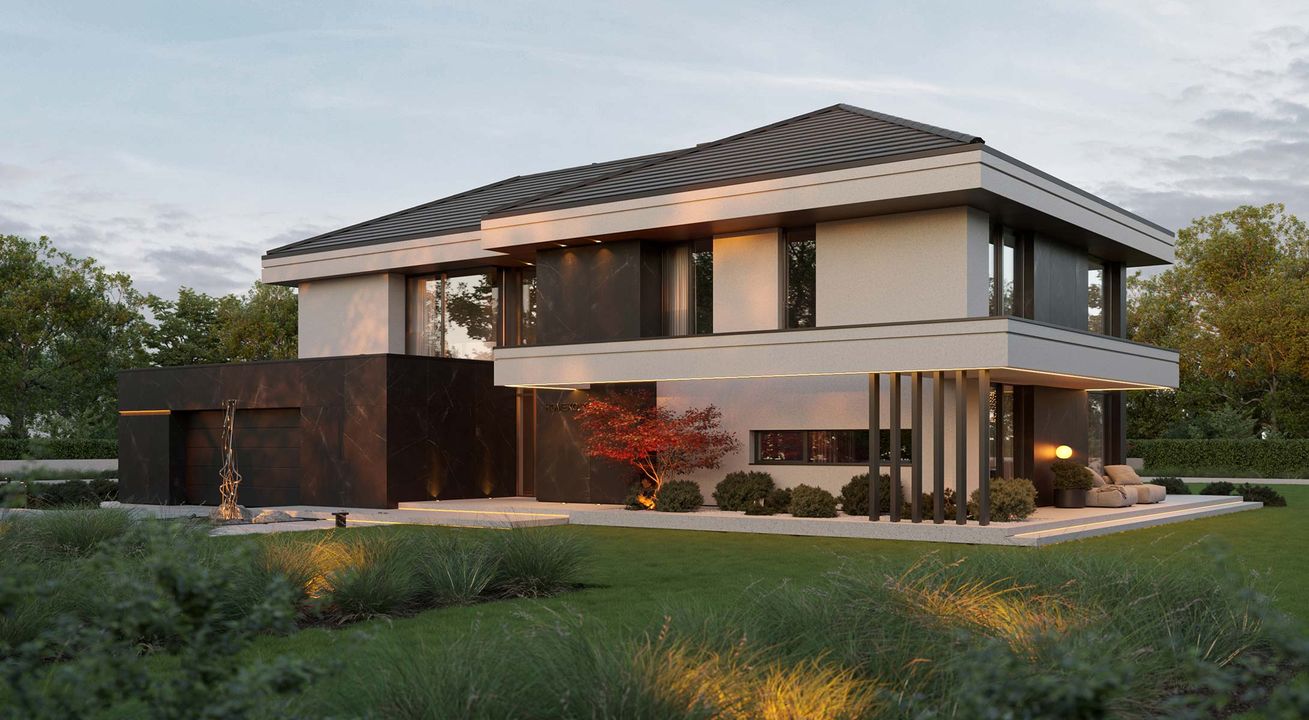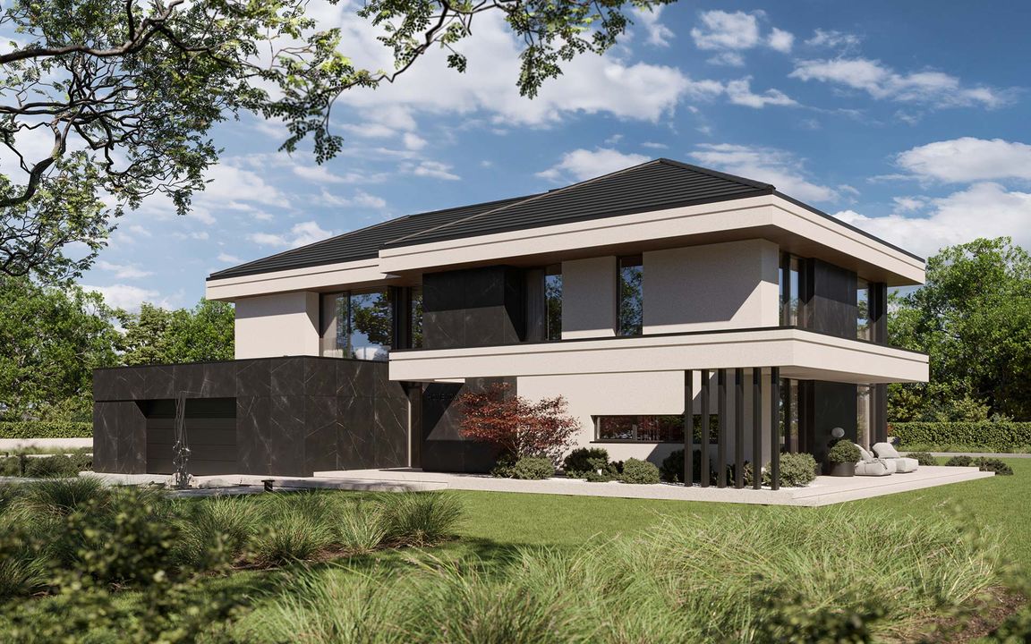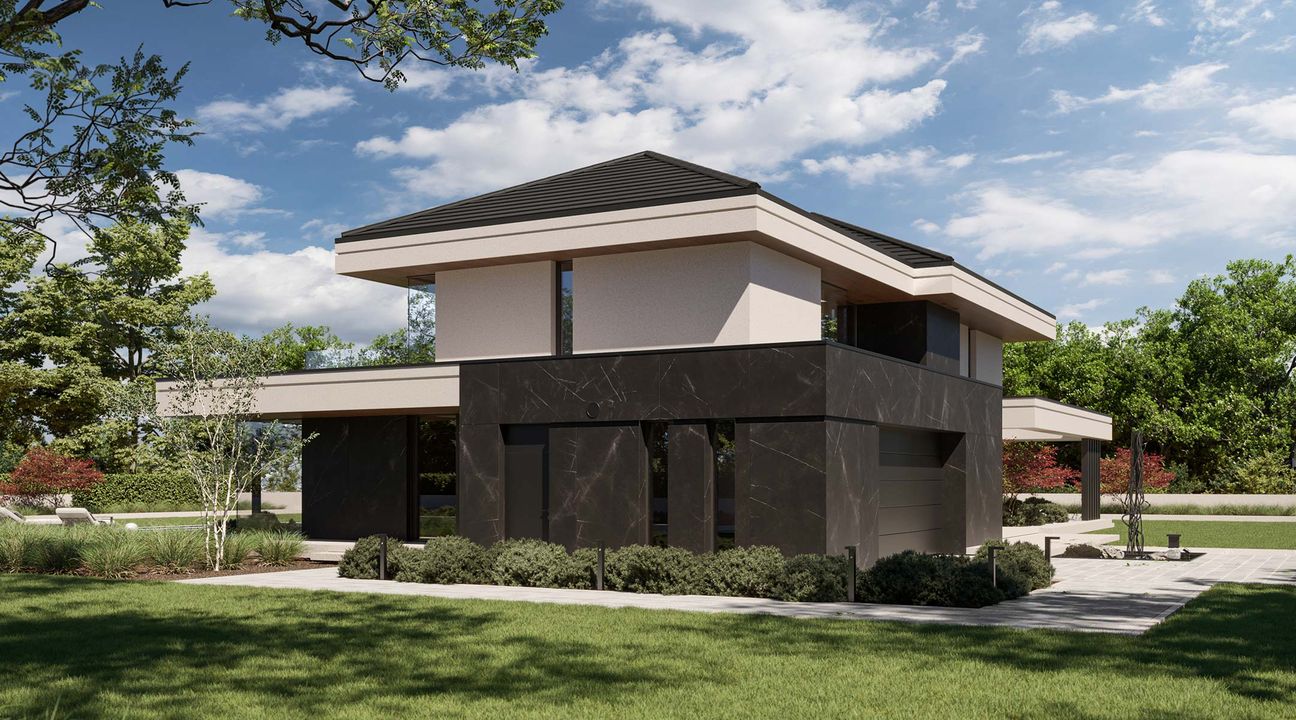 Fundamenty: tradycyjne - na ławach fundamentowych. Strop: żelbetowy wylewany . Ściany: dwuwarstwowe - pustak ceramiczny 25 cm + styropian Termo Organika 20 cm. Dach: wielospadowy kryty dachówką ceramiczną lub cementową swissporTON, stropodach pełny kryty membraną EPDM. Elewacja: tynk silikonowy połączony z deskami elewacyjnymi oraz spiekiem kwarcowym. Ogrzewanie: gazowe - piec kondensacyjny oraz ogrzewanie podłogowe w całym domu, dodatkowo w łazienkach tradycyjne grzejniki typu ręcznikowiec. Wentylacja: mechaniczna z rekuperacją. Rolety podtynkowe: żaluzje fasadowe.