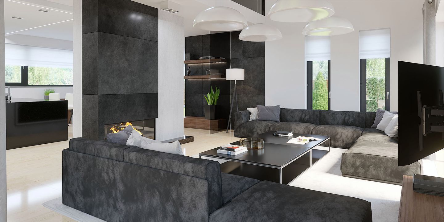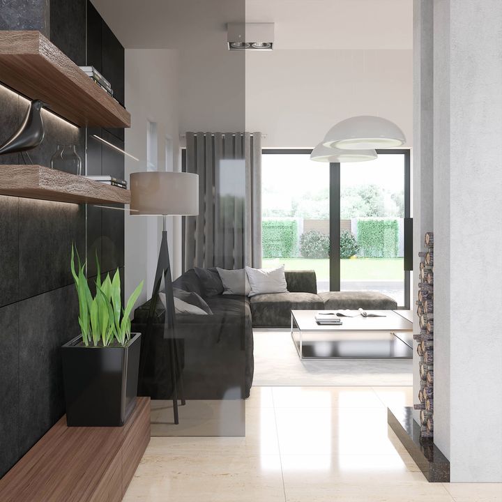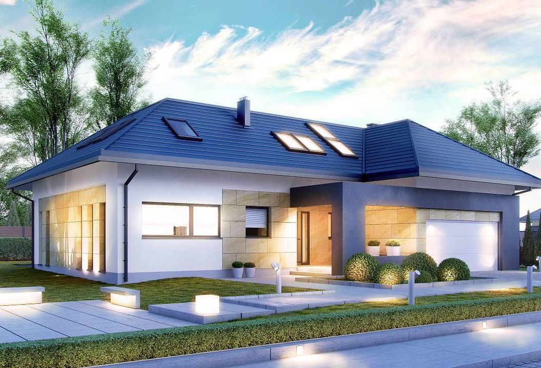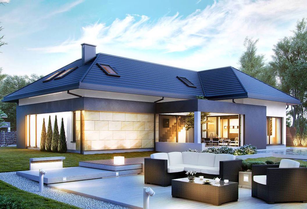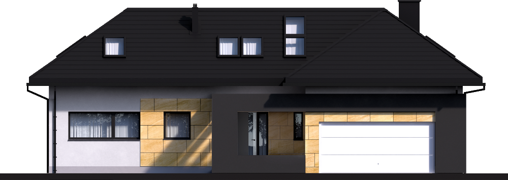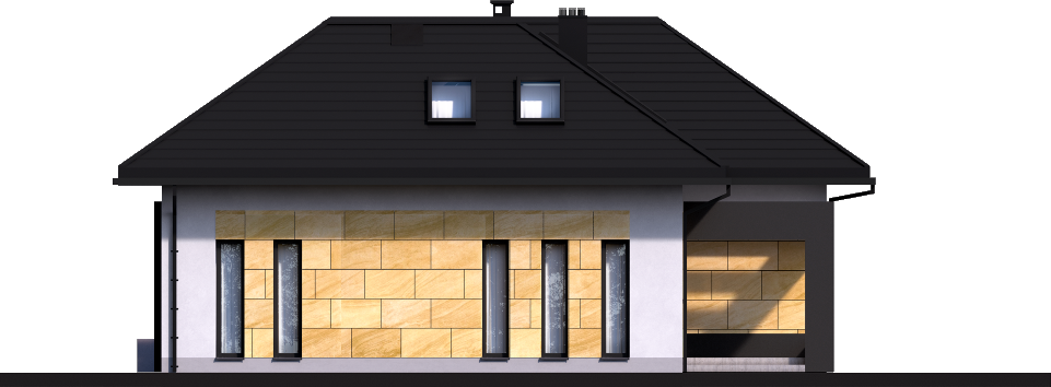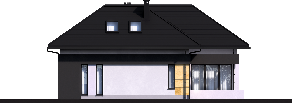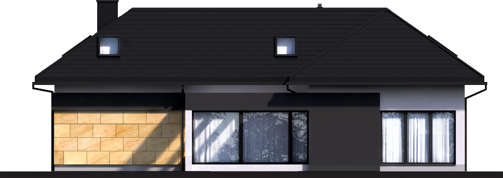 Graficzne opracowanie rzutów poglądowych widocznych na karcie projektu zostało wykonane przez Extradom.pl. Prezentowane przez Extradom.pl wizualizacje wykonane zostały przez autora projektu i należy poczytywać je jedynie za przykład i propozycję wykończenia, wizję architektoniczną autora projektu. Ostateczne wykończenie budynku może nastąpić na wiele sposobów. Szczegółowe rozwiązania zastosowane w oferowanej dokumentacji - w tym również ilość, lokalizacje i wygląd okien, drzwi, kominów - mogą w niewielkim stopniu różnić się od prezentowanej wizualizacji budynku.