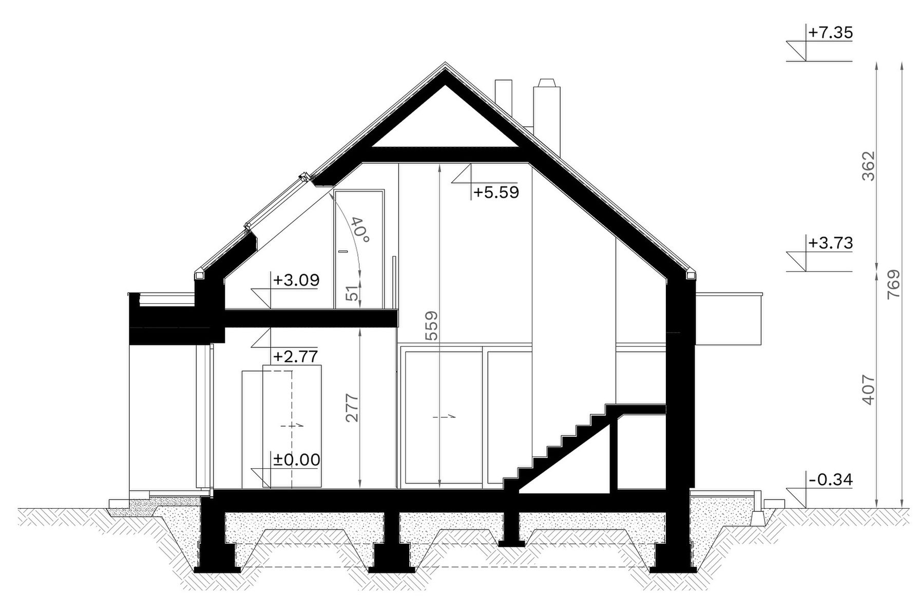 Fundamenty: tradycyjne - na ławach fundamentowych. Strop: żelbetowy wylewany. Ściany: dwuwarstwowe - pustak ceramiczny 25 cm + styropian Termo Organika 26 cm/wełna mineralna 18 cm. Dach: dwuspadowy kryty dachówką ceramiczną lub cementową swissporTON, stropodach pełny kryty membraną EPDM, okna dachowe FAKRO. Elewacja: tynk silikonowy połączony z deską elewacyjną lamelową. Ogrzewanie: gazowe - piec kondensacyjny oraz ogrzewanie podłogowe w całym domu, dodatkowo w łazienkach tradycyjne grzejniki typu ręcznikowiec. Wentylacja: mechaniczna z rekuperacją. Rolety podtynkowe: tak – rozwiązania firmy ALUPROF.