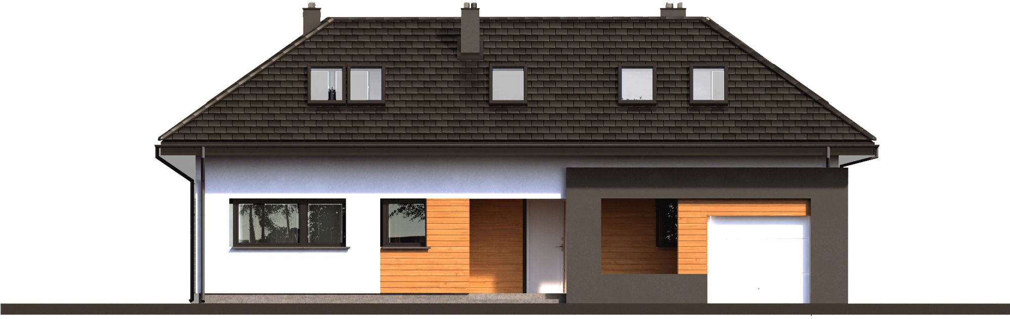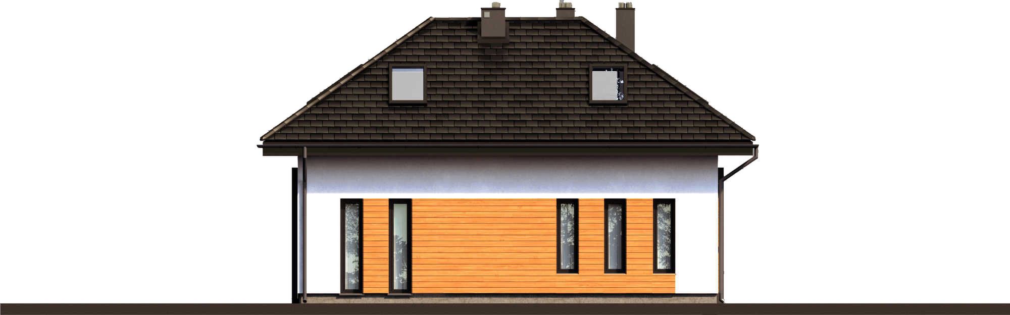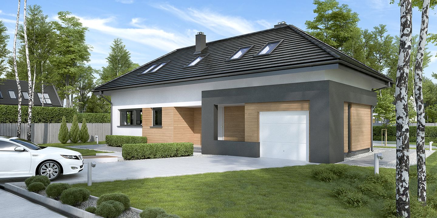 Graficzne opracowanie rzutów poglądowych widocznych na karcie projektu zostało wykonane przez Extradom.pl. Prezentowane przez Extradom.pl wizualizacje wykonane zostały przez autora projektu i należy poczytywać je jedynie za przykład i propozycję wykończenia, wizję architektoniczną autora projektu. Ostateczne wykończenie budynku może nastąpić na wiele sposobów. Szczegółowe rozwiązania zastosowane w oferowanej dokumentacji - w tym również ilość, lokalizacje i wygląd okien, drzwi, kominów - mogą w niewielkim stopniu różnić się od prezentowanej wizualizacji budynku.