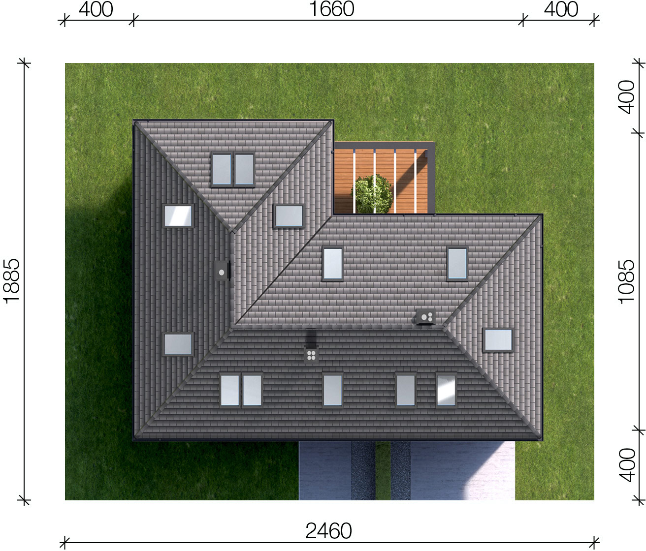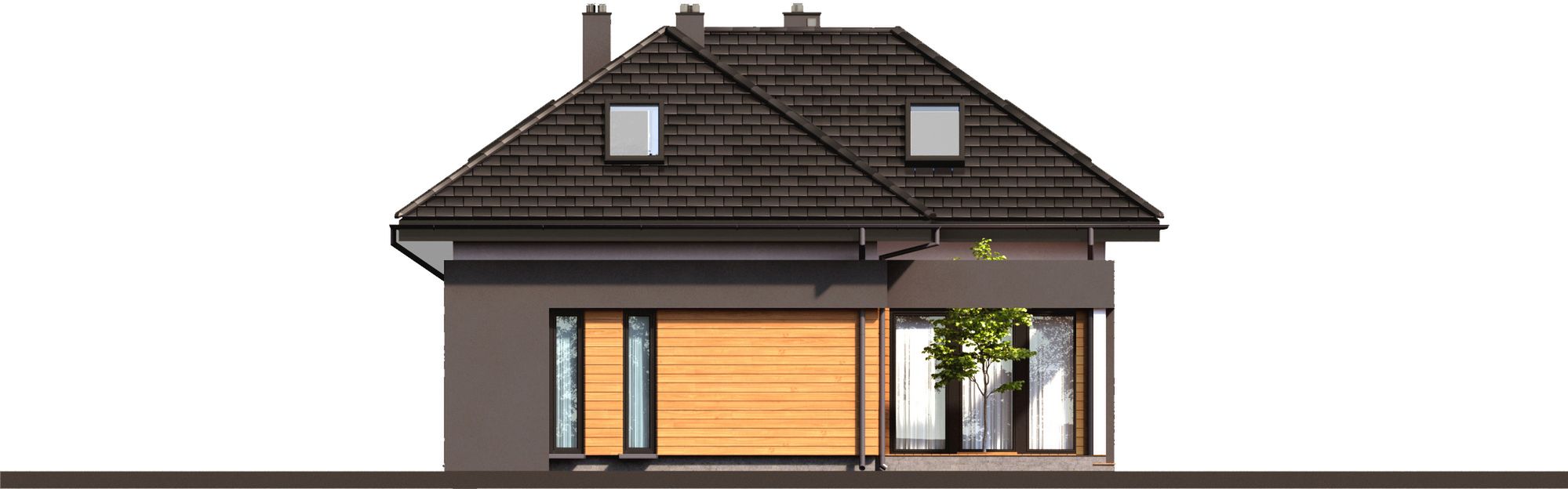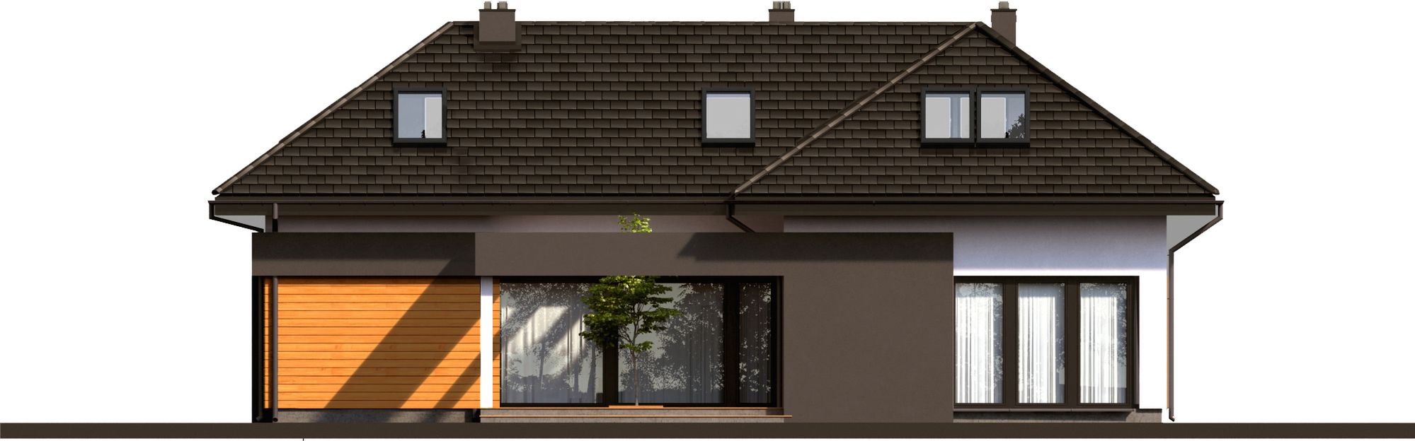 Graficzne opracowanie rzutów poglądowych widocznych na karcie projektu zostało wykonane przez Extradom.pl. Prezentowane przez Extradom.pl wizualizacje wykonane zostały przez autora projektu i należy poczytywać je jedynie za przykład i propozycję wykończenia, wizję architektoniczną autora projektu. Ostateczne wykończenie budynku może nastąpić na wiele sposobów. Szczegółowe rozwiązania zastosowane w oferowanej dokumentacji - w tym również ilość, lokalizacje i wygląd okien, drzwi, kominów - mogą w niewielkim stopniu różnić się od prezentowanej wizualizacji budynku.