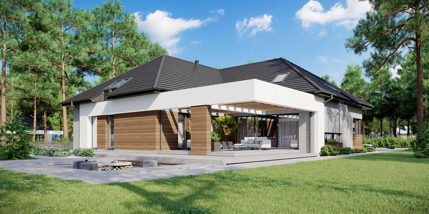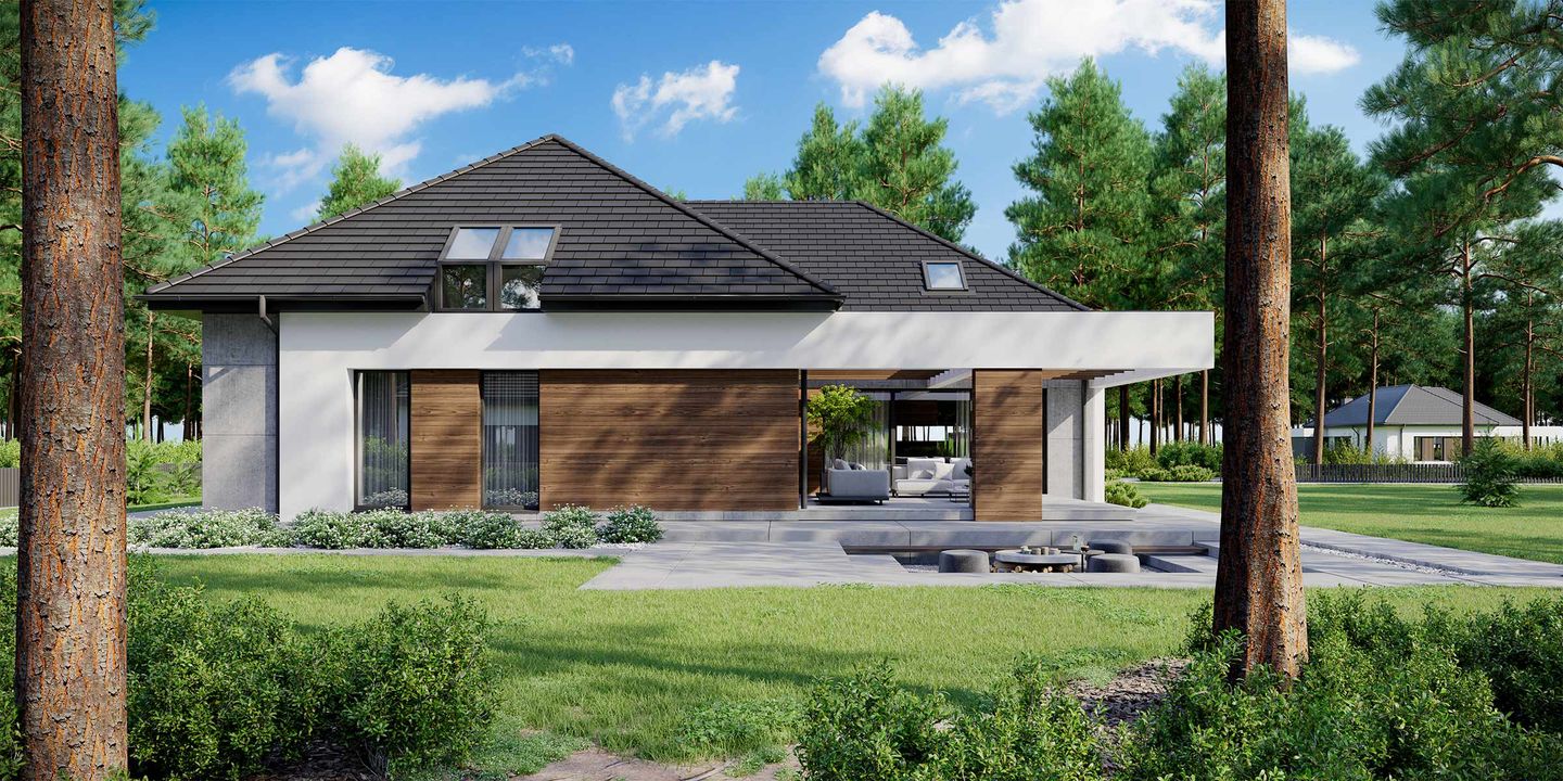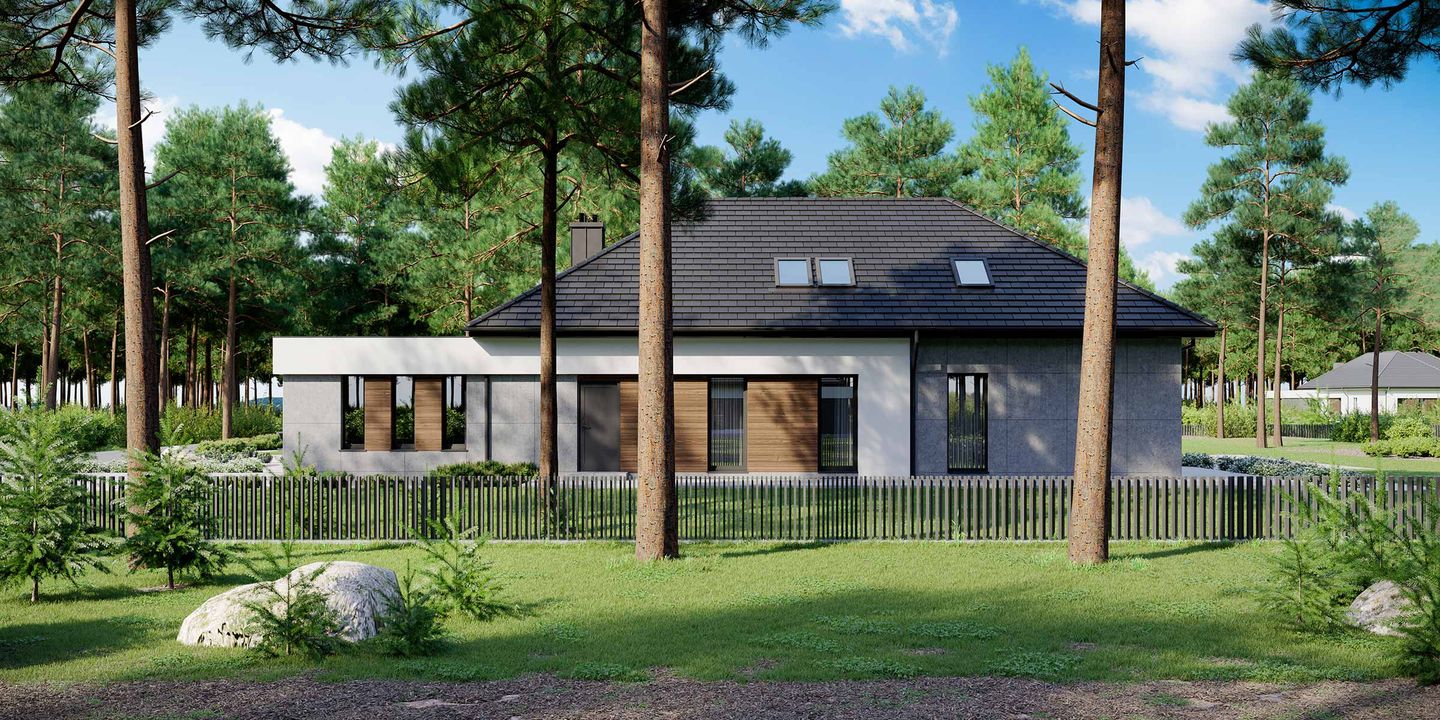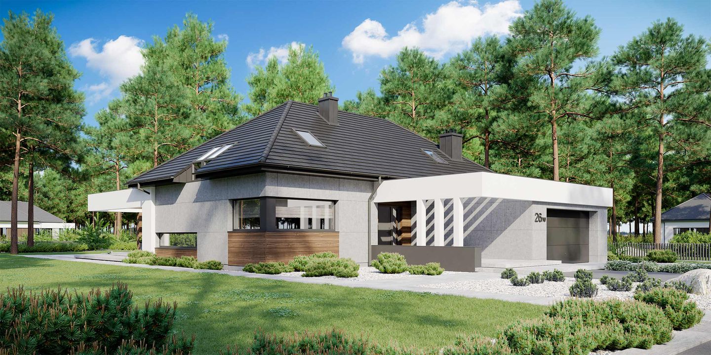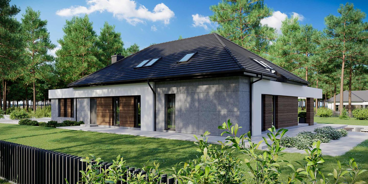 Graficzne opracowanie rzutów poglądowych widocznych na karcie projektu zostało wykonane przez Extradom.pl. Prezentowane przez Extradom.pl wizualizacje wykonane zostały przez autora projektu i należy poczytywać je jedynie za przykład i propozycję wykończenia, wizję architektoniczną autora projektu. Ostateczne wykończenie budynku może nastąpić na wiele sposobów. Szczegółowe rozwiązania zastosowane w oferowanej dokumentacji - w tym również ilość, lokalizacje i wygląd okien, drzwi, kominów - mogą w niewielkim stopniu różnić się od prezentowanej wizualizacji budynku.