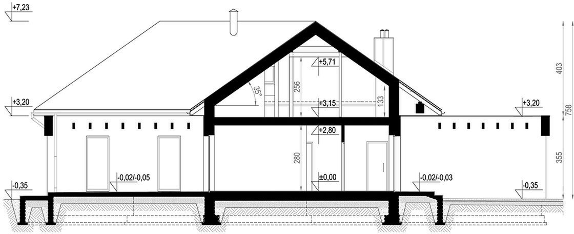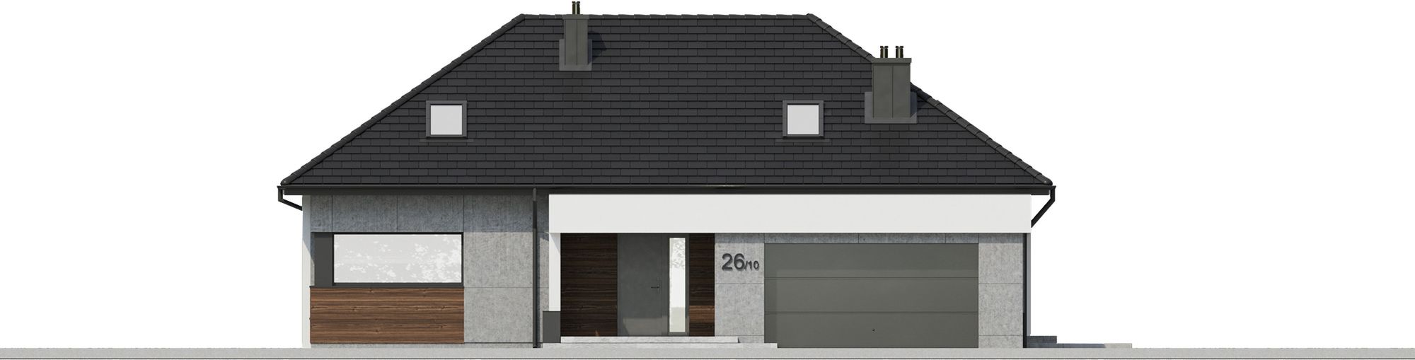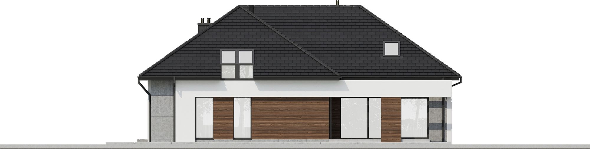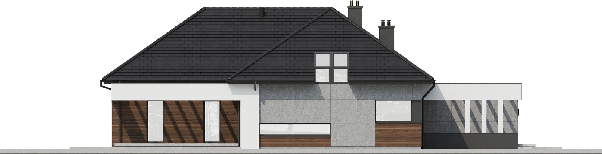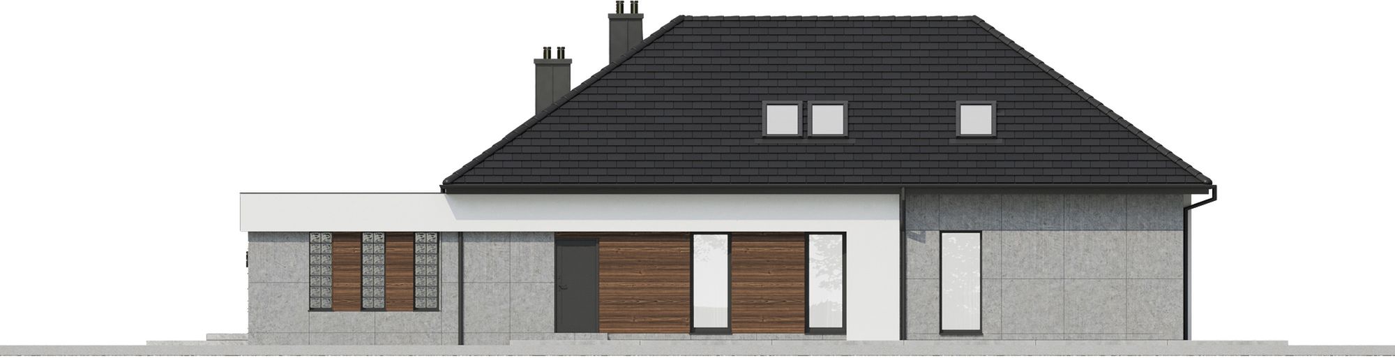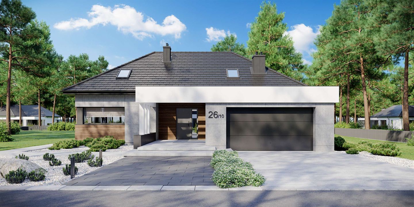 Graficzne opracowanie rzutów poglądowych widocznych na karcie projektu zostało wykonane przez Extradom.pl. Prezentowane przez Extradom.pl wizualizacje wykonane zostały przez autora projektu i należy poczytywać je jedynie za przykład i propozycję wykończenia, wizję architektoniczną autora projektu. Ostateczne wykończenie budynku może nastąpić na wiele sposobów. Szczegółowe rozwiązania zastosowane w oferowanej dokumentacji - w tym również ilość, lokalizacje i wygląd okien, drzwi, kominów - mogą w niewielkim stopniu różnić się od prezentowanej wizualizacji budynku.