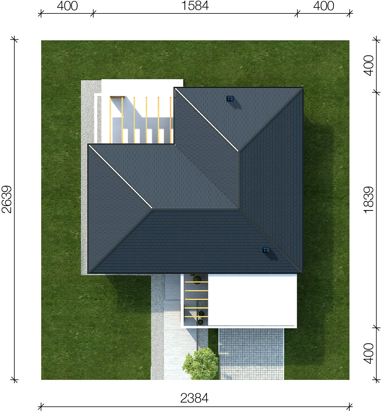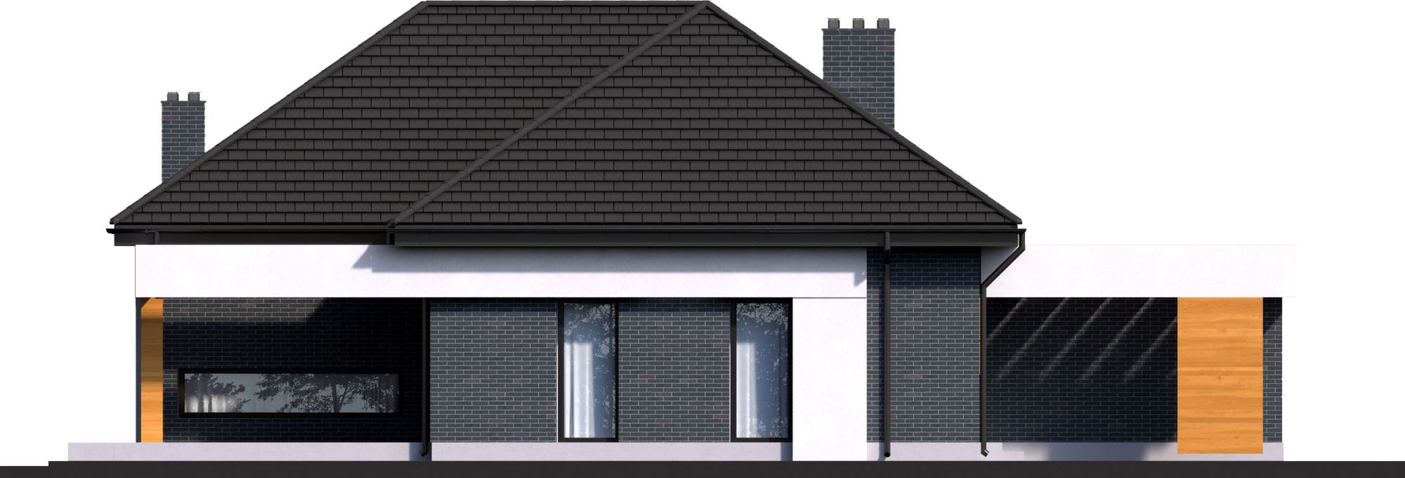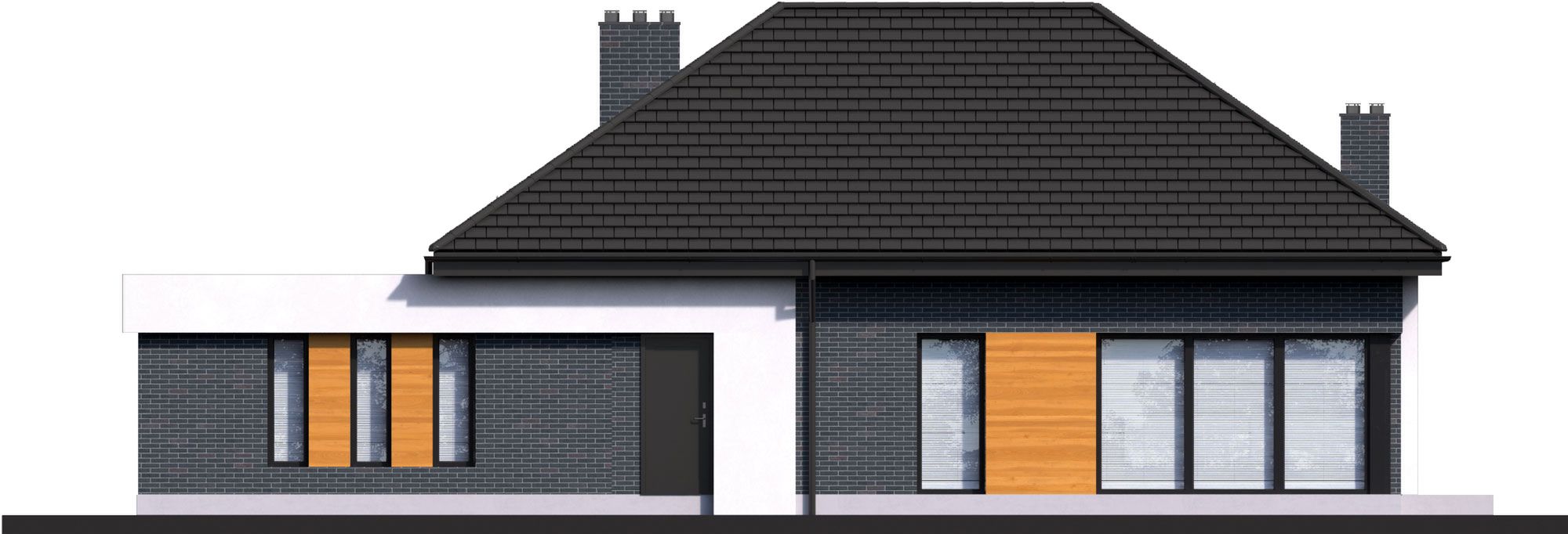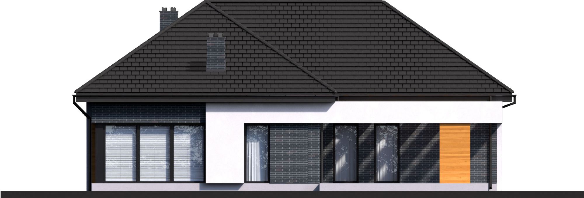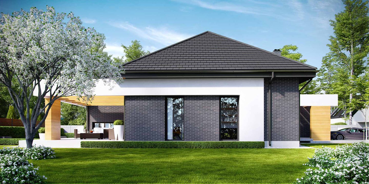 Graficzne opracowanie rzutów poglądowych widocznych na karcie projektu zostało wykonane przez Extradom.pl. Prezentowane przez Extradom.pl wizualizacje wykonane zostały przez autora projektu i należy poczytywać je jedynie za przykład i propozycję wykończenia, wizję architektoniczną autora projektu. Ostateczne wykończenie budynku może nastąpić na wiele sposobów. Szczegółowe rozwiązania zastosowane w oferowanej dokumentacji - w tym również ilość, lokalizacje i wygląd okien, drzwi, kominów - mogą w niewielkim stopniu różnić się od prezentowanej wizualizacji budynku.