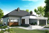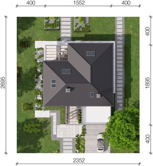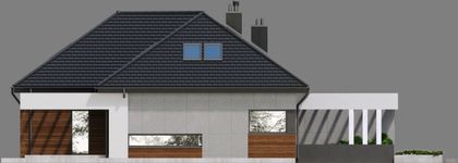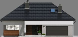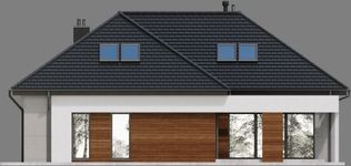 Graficzne opracowanie rzutów poglądowych widocznych na karcie projektu zostało wykonane przez Extradom.pl. Prezentowane przez Extradom.pl wizualizacje wykonane zostały przez autora projektu i należy poczytywać je jedynie za przykład i propozycję wykończenia, wizję architektoniczną autora projektu. Ostateczne wykończenie budynku może nastąpić na wiele sposobów. Szczegółowe rozwiązania zastosowane w oferowanej dokumentacji - w tym również ilość, lokalizacje i wygląd okien, drzwi, kominów - mogą w niewielkim stopniu różnić się od prezentowanej wizualizacji budynku.