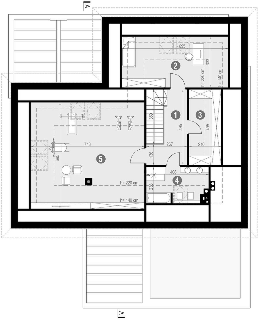 Wariant 1: dom z antresolą, podniesioną ścianą kolankową i zmienioną lokalizacją kominka.
