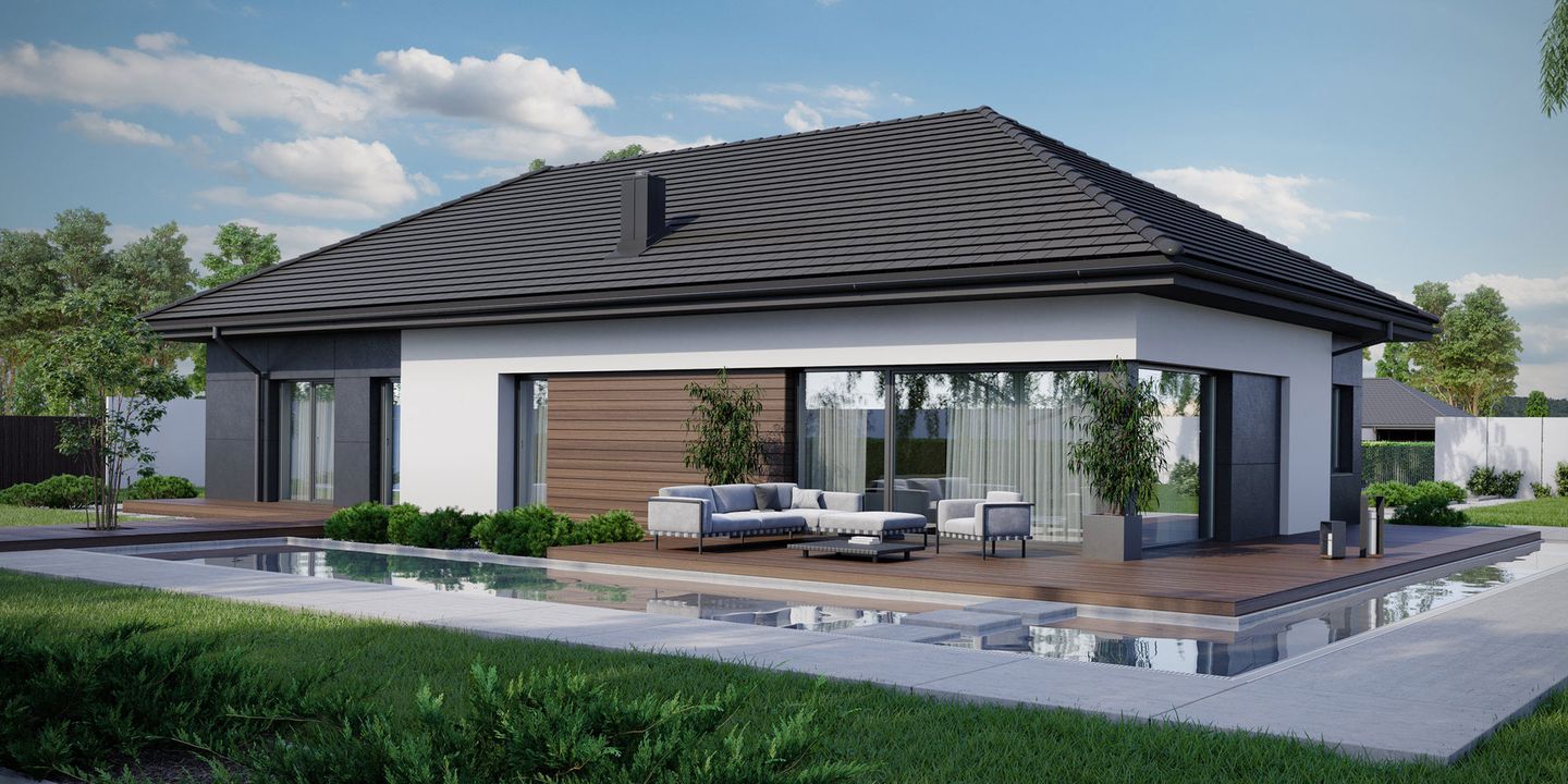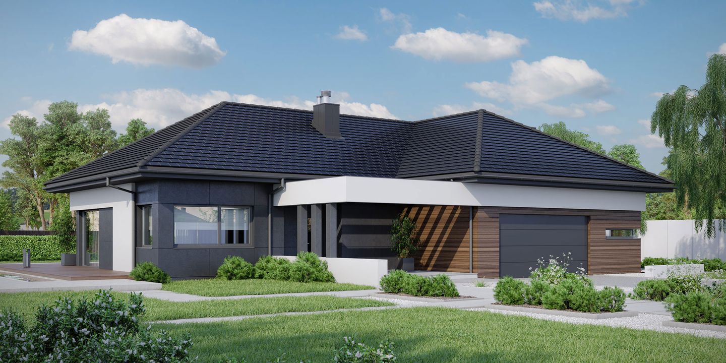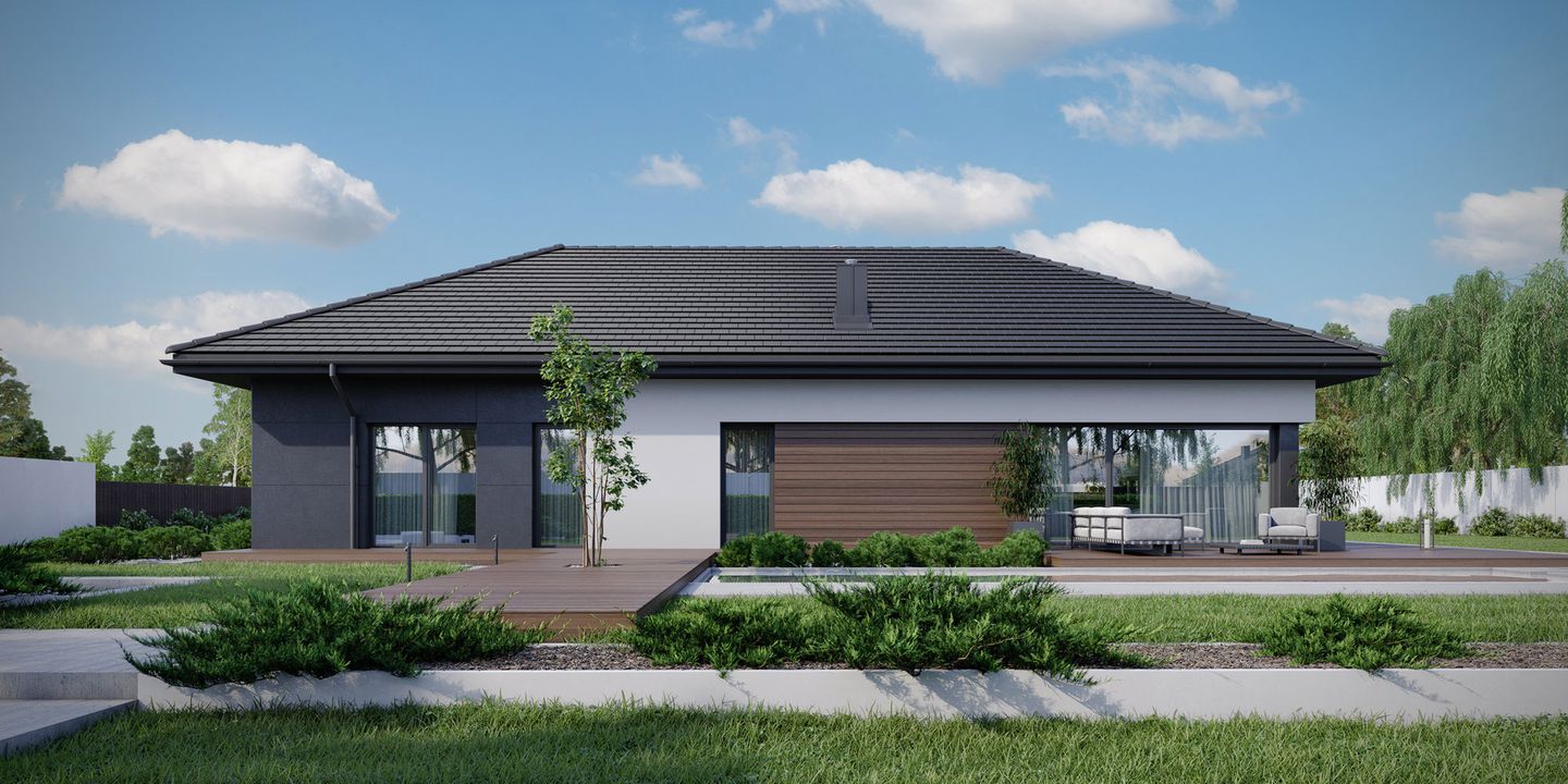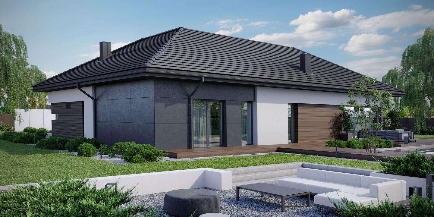 Graficzne opracowanie rzutów poglądowych widocznych na karcie projektu zostało wykonane przez Extradom.pl. Prezentowane przez Extradom.pl wizualizacje wykonane zostały przez autora projektu i należy poczytywać je jedynie za przykład i propozycję wykończenia, wizję architektoniczną autora projektu. Ostateczne wykończenie budynku może nastąpić na wiele sposobów. Szczegółowe rozwiązania zastosowane w oferowanej dokumentacji - w tym również ilość, lokalizacje i wygląd okien, drzwi, kominów - mogą w niewielkim stopniu różnić się od prezentowanej wizualizacji budynku.