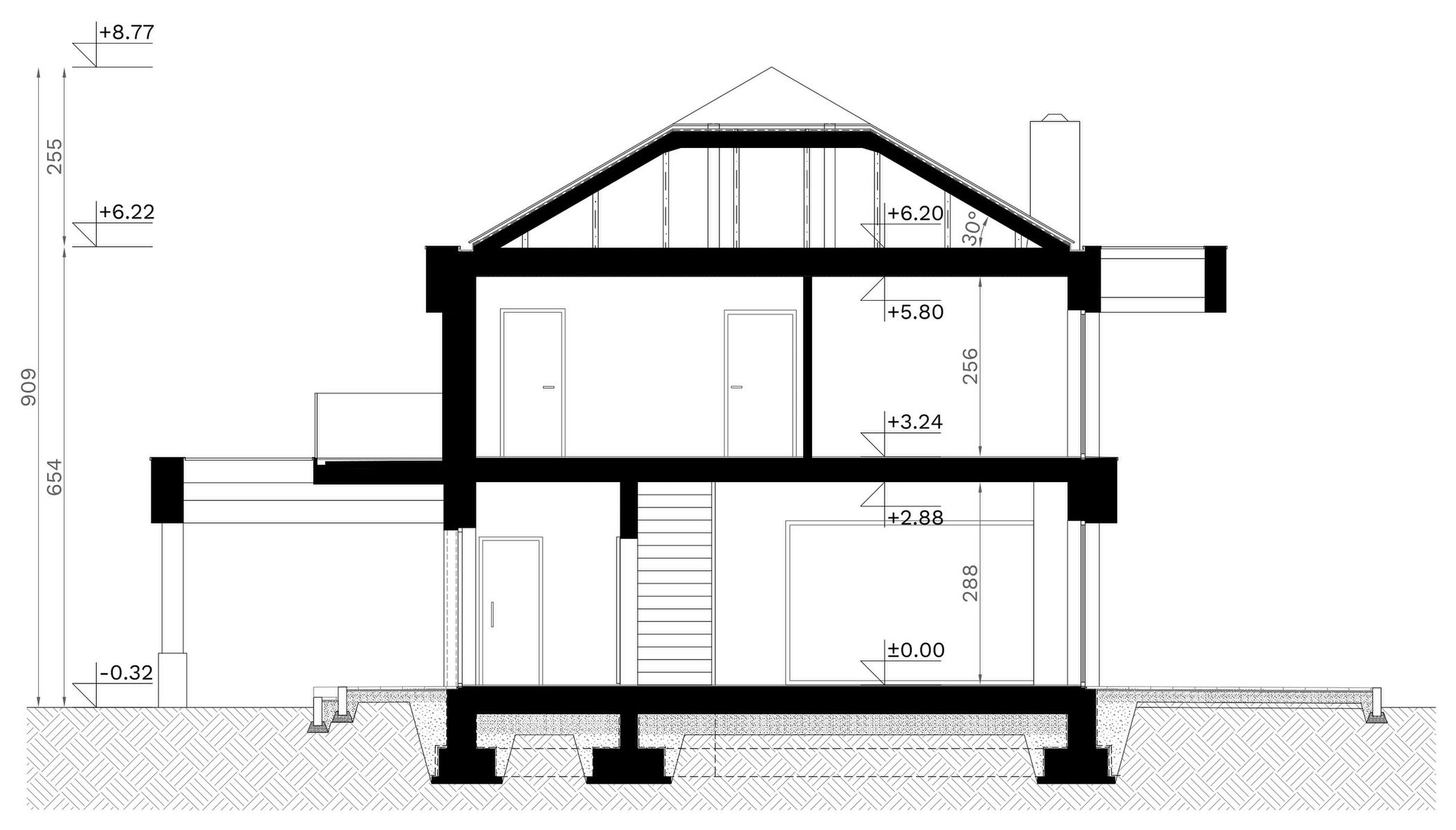 Fundamenty: tradycyjne - na ławach fundamentowych. Strop: żelbetowy wylewany. Ściany: dwuwarstwowe - pustak ceramiczny 25 cm + styropian Termo Organika 20 cm. Dach: tradycyjna więźba dachowa pokryta dachówką ceramiczną lub cementową swissporTON. Elewacja: kamień elewacyjny 22PM RAMZES firmy EL-POL Hurtownia Kamienia połączony z tynkiem. Ogrzewanie: gazowe - piec kondensacyjny oraz ogrzewanie podłogowe w salonie, kuchni, jadalni, łazienkach, garderobie, pralni, wiatrołapie i części komunikacyjnej, tradycyjne grzejniki w pozostałych pomieszczeniach. Wentylacja: mechaniczna z rekuperacją.