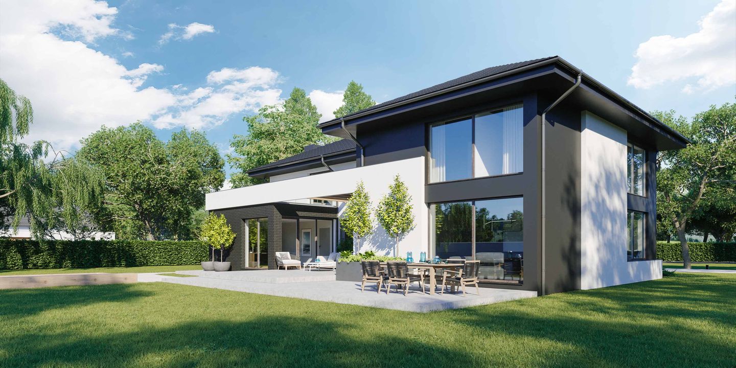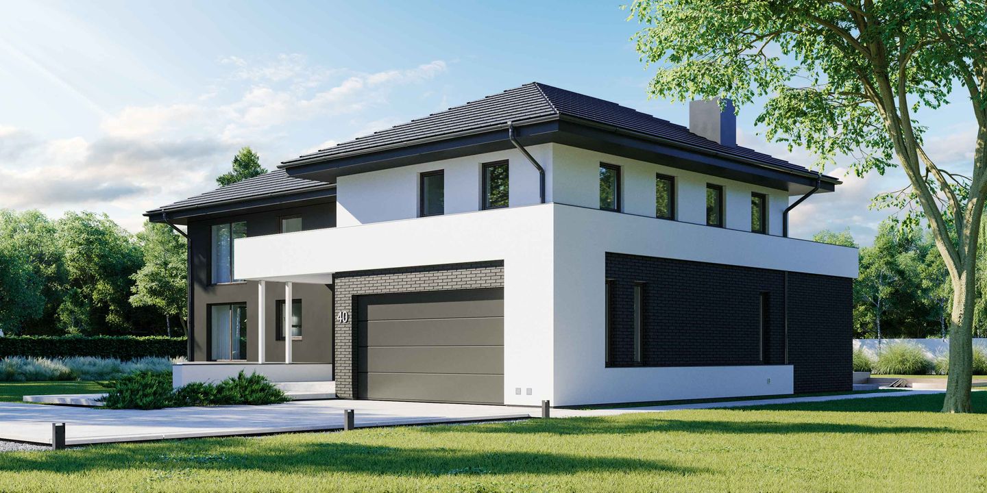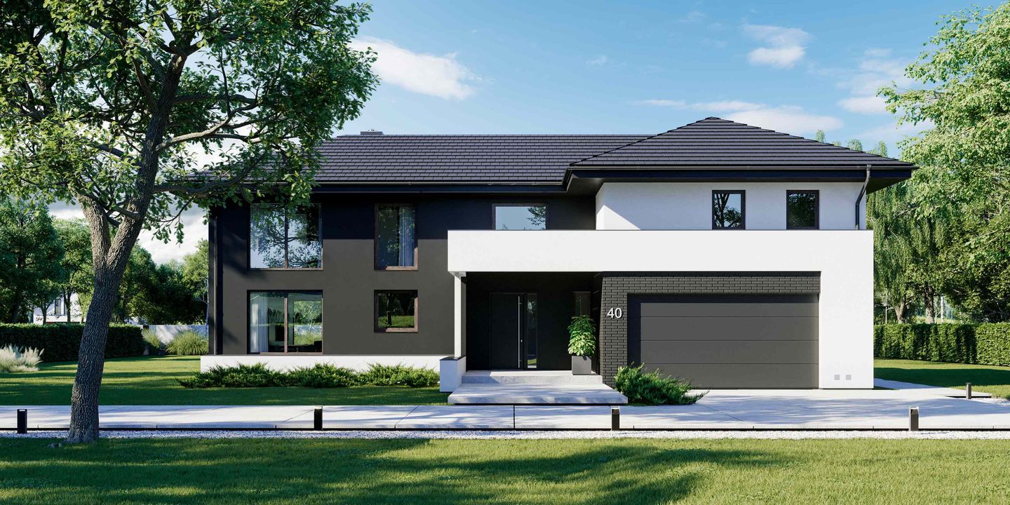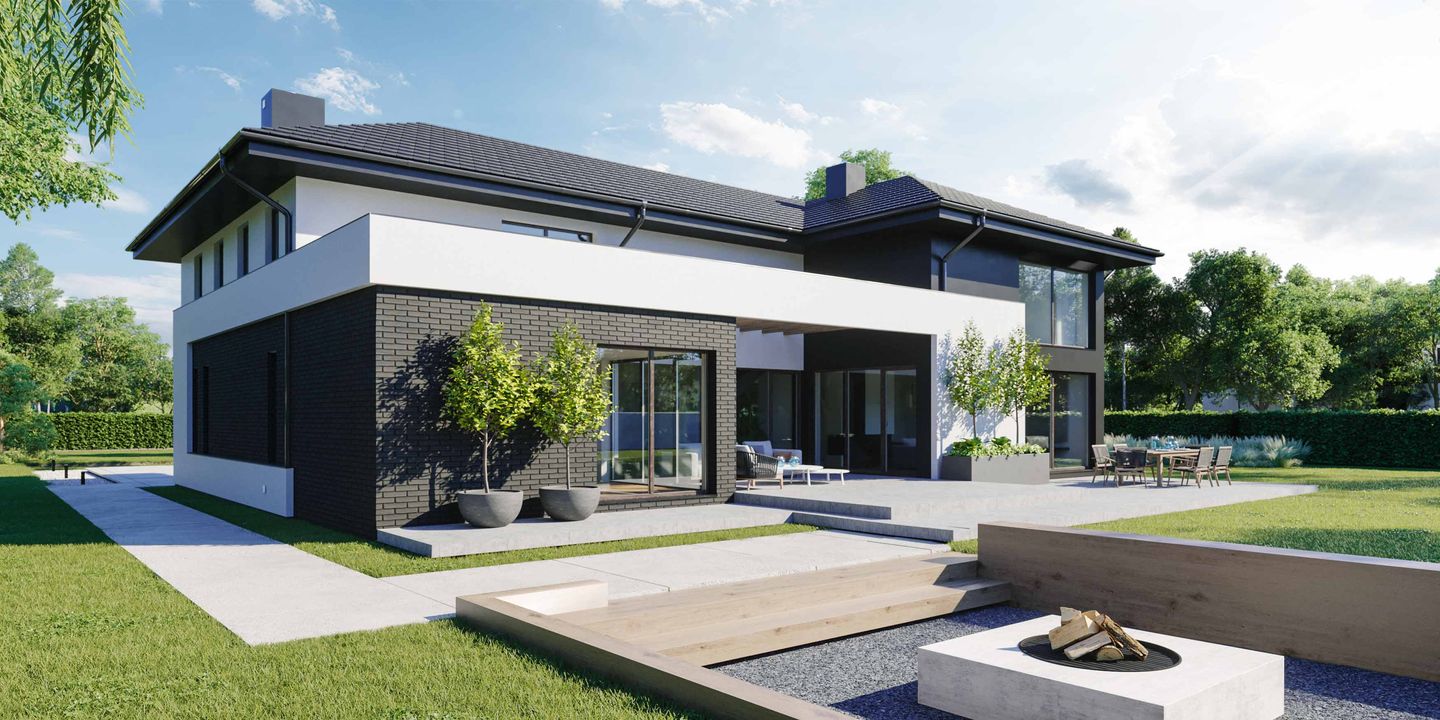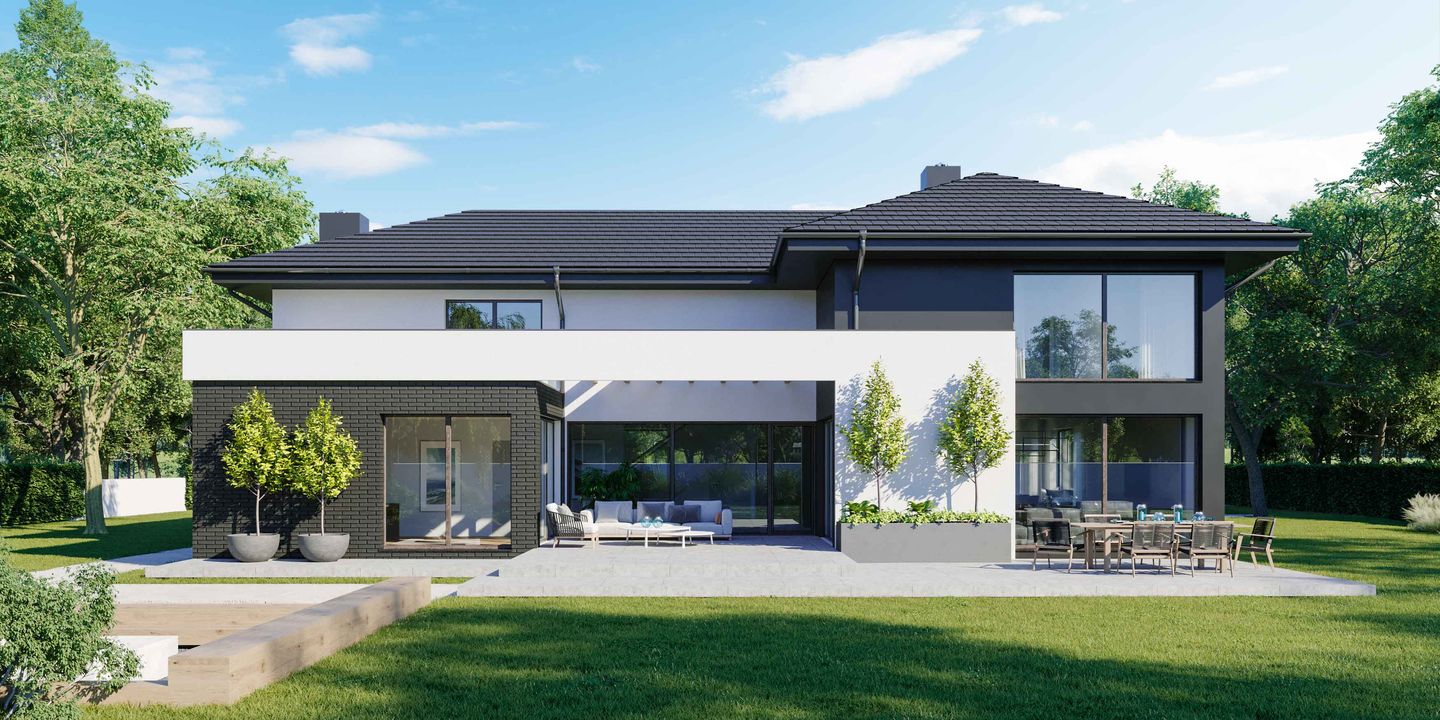 Graficzne opracowanie rzutów poglądowych widocznych na karcie projektu zostało wykonane przez Extradom.pl. Prezentowane przez Extradom.pl wizualizacje wykonane zostały przez autora projektu i należy poczytywać je jedynie za przykład i propozycję wykończenia, wizję architektoniczną autora projektu. Ostateczne wykończenie budynku może nastąpić na wiele sposobów. Szczegółowe rozwiązania zastosowane w oferowanej dokumentacji - w tym również ilość, lokalizacje i wygląd okien, drzwi, kominów - mogą w niewielkim stopniu różnić się od prezentowanej wizualizacji budynku.