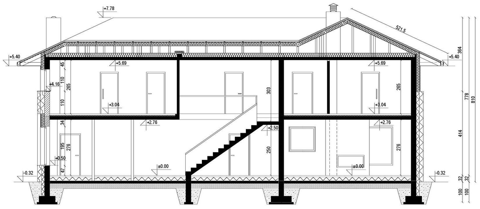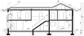 Fundamenty: tradycyjne - na ławach fundamentowych. Ściany: dwuwarstwowe - pustak ceramiczny 25 cm + styropian 20 cm. Stropy: żelbetowe wylewane dach tradycyjna więźba dachowa pokryta łupkiem dachowym schody dwubiegowe żelbetowe. Elewacja: płytka klinkierowa połączona z tynkiem silikonowym. Ogrzewanie: gazowe - piec kondensacyjn. Wentylacja mechaniczna z rekuperacją.