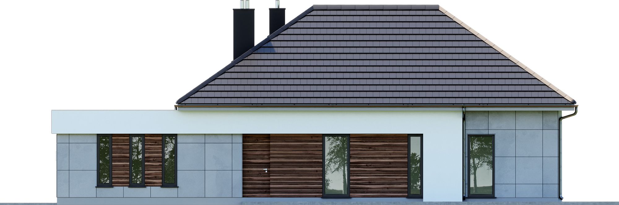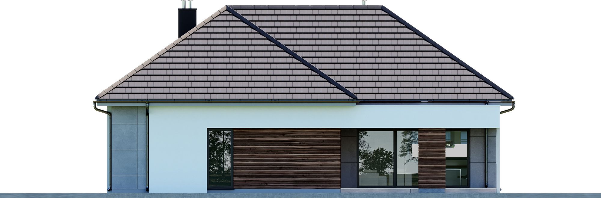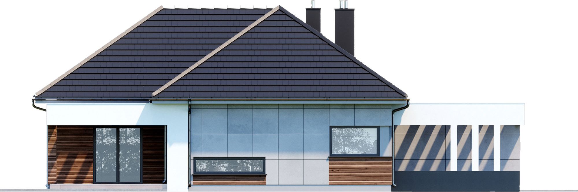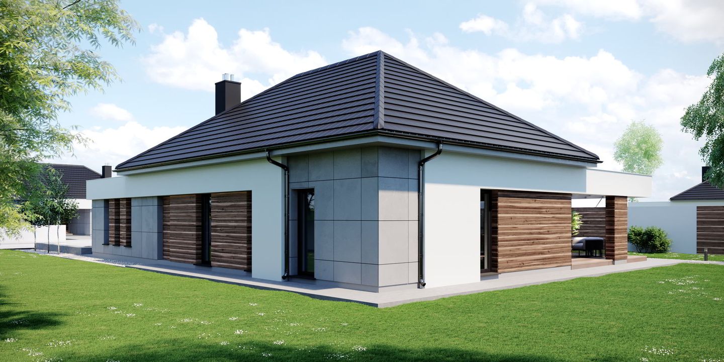 Graficzne opracowanie rzutów poglądowych widocznych na karcie projektu zostało wykonane przez Extradom.pl. Prezentowane przez Extradom.pl wizualizacje wykonane zostały przez autora projektu i należy poczytywać je jedynie za przykład i propozycję wykończenia, wizję architektoniczną autora projektu. Ostateczne wykończenie budynku może nastąpić na wiele sposobów. Szczegółowe rozwiązania zastosowane w oferowanej dokumentacji - w tym również ilość, lokalizacje i wygląd okien, drzwi, kominów - mogą w niewielkim stopniu różnić się od prezentowanej wizualizacji budynku.