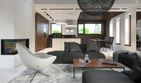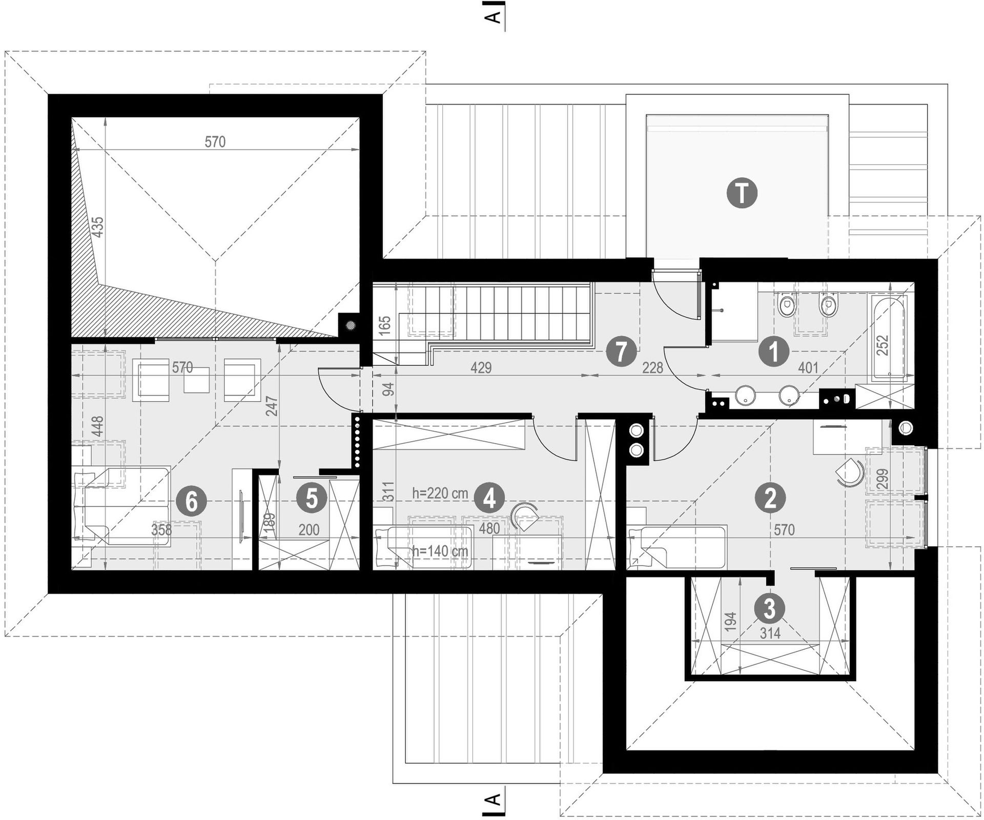 Fundamenty: tradycyjne - na ławach fundamentowych. Strop: żelbetowy wylewany. Ściany: dwuwarstwowe - pustak ceramiczny 25 cm + styropian Termo Organika 20 cm/wełna mineralna 18 cm. Dach: tradycyjna więźba dachowa pokryta dachówką ceramiczną lub cementową CREATON, okna dachowe FAKRO, stropodach kryty membraną EPDM. Elewacja: kamień elewacyjny 2PO firmy EL-POL Hurtownia Kamienia lub łupek kamienny w połączeniu z tynkiem silikonowym i drewnem elewacyjnym . Ogrzewanie: gazowe - piec kondensacyjny oraz ogrzewanie podłogowe w salonie, jadalni, kuchni, łazienkach, toalecie, pralni, garderobach, wiatrołapie i części komunikacyjnej, tradycyjne grzejniki w pozostałych pomieszczeniach. Wentylacja: mechaniczna z rekuperacją.