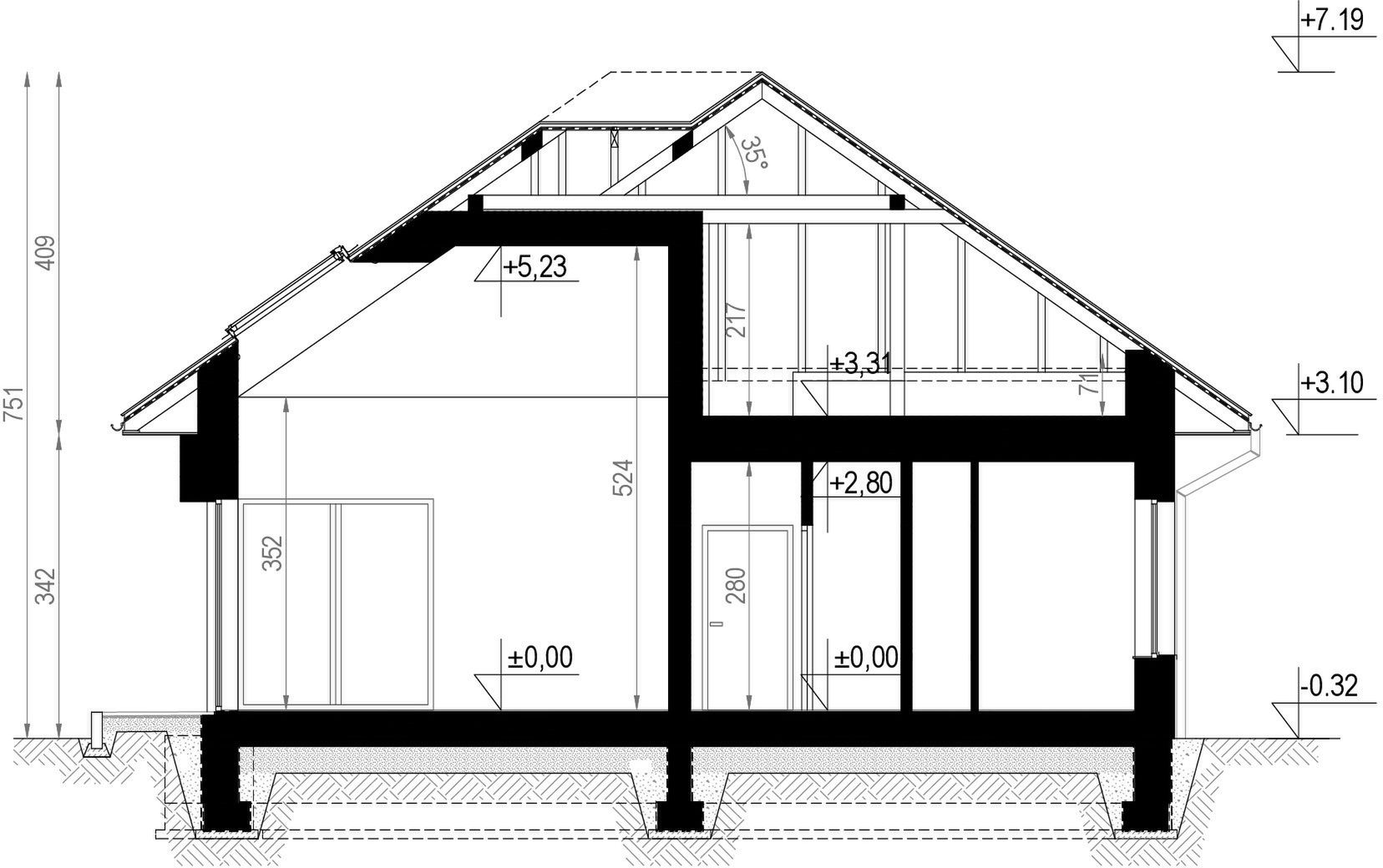 Fundamenty: tradycyjne - na ławach fundamentowych. Strop: żelbetowy wylewany. Ściany: dwuwarstwowe - pustak ceramiczny 25 cm + styropian Termo Organika 20 cm/wełna mineralna 18 cm. Dach: tradycyjna więźba dachowa pokryta dachówką ceramiczną lub cementową CREATON. Elewacja: tynk silikonowy połączony z deskami elewacyjnymi Thermory thermo sosna skandynawska firmy Komplex Market. Ogrzewanie: gazowe - piec kondensacyjny oraz ogrzewanie podłogowe w salonie, jadalni, kuchni, łazience, toalecie, garderobie, wiatrołapie i części komunikacyjnej, tradycyjne grzejniki w pozostałych pomieszczeniach. Wentylacja: mechaniczna z rekuperacją.