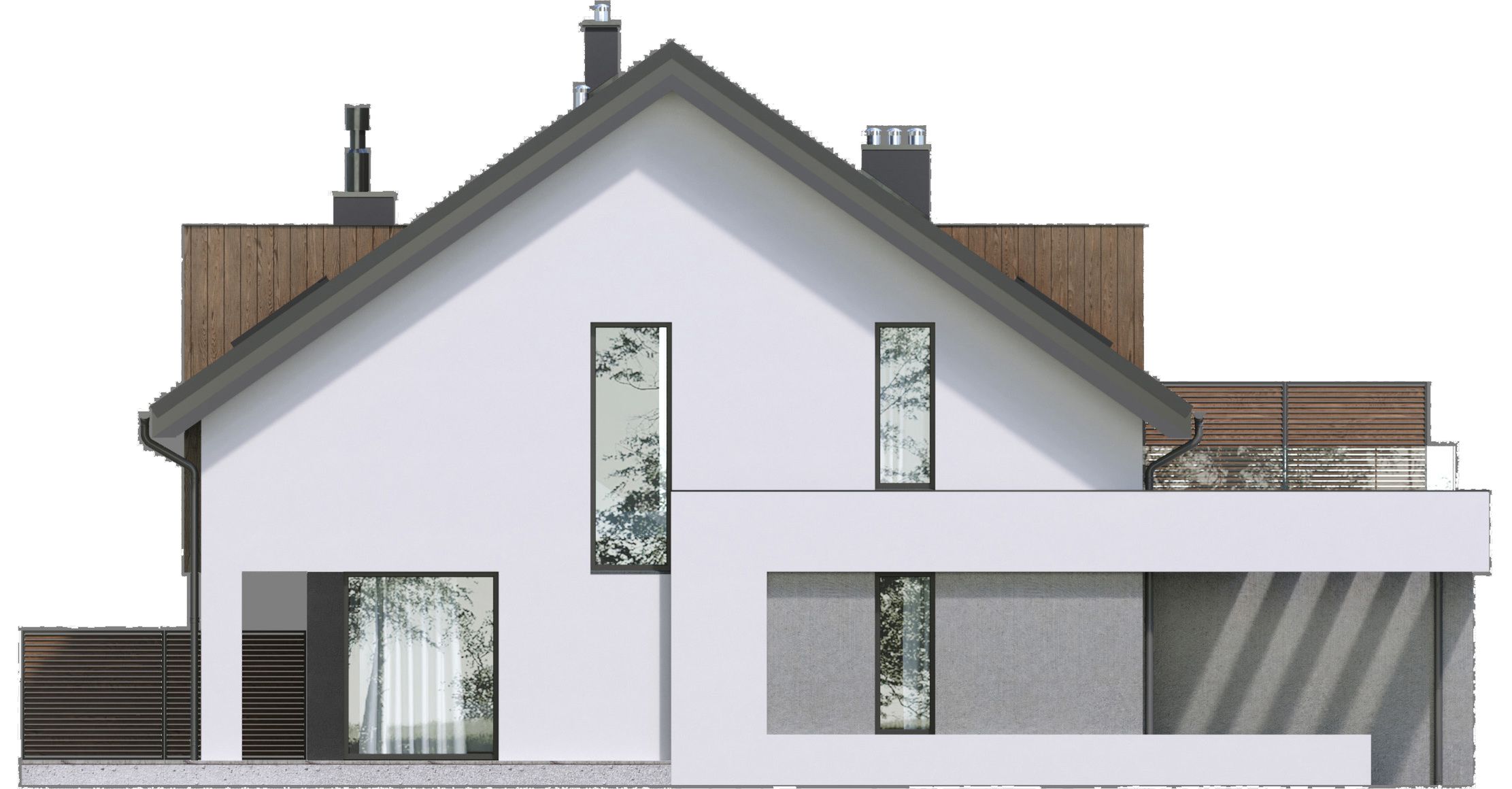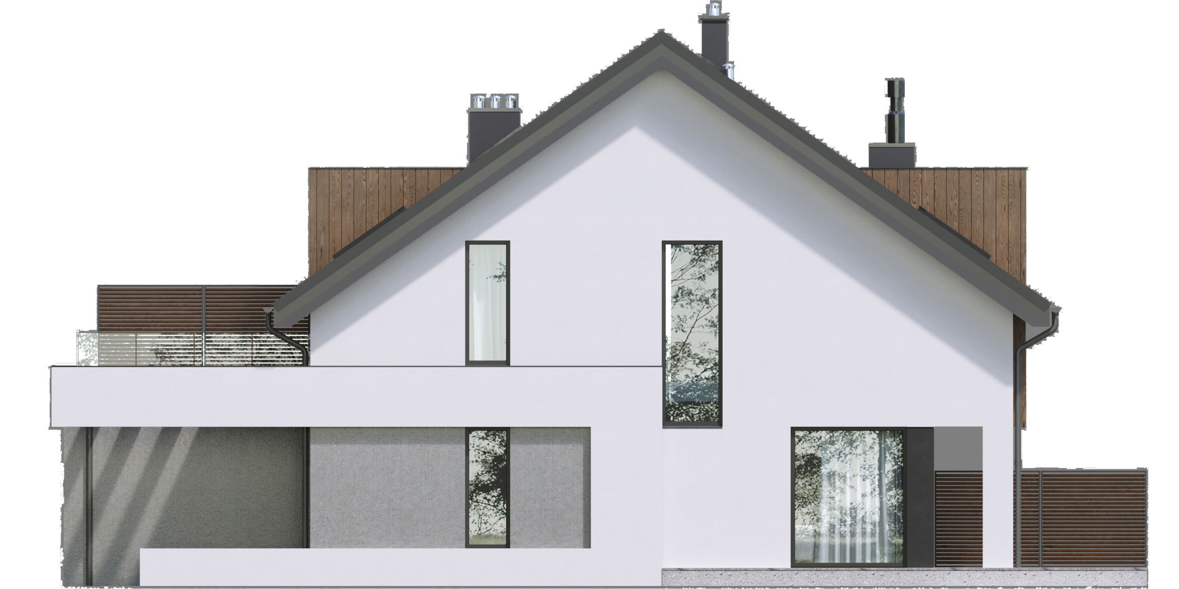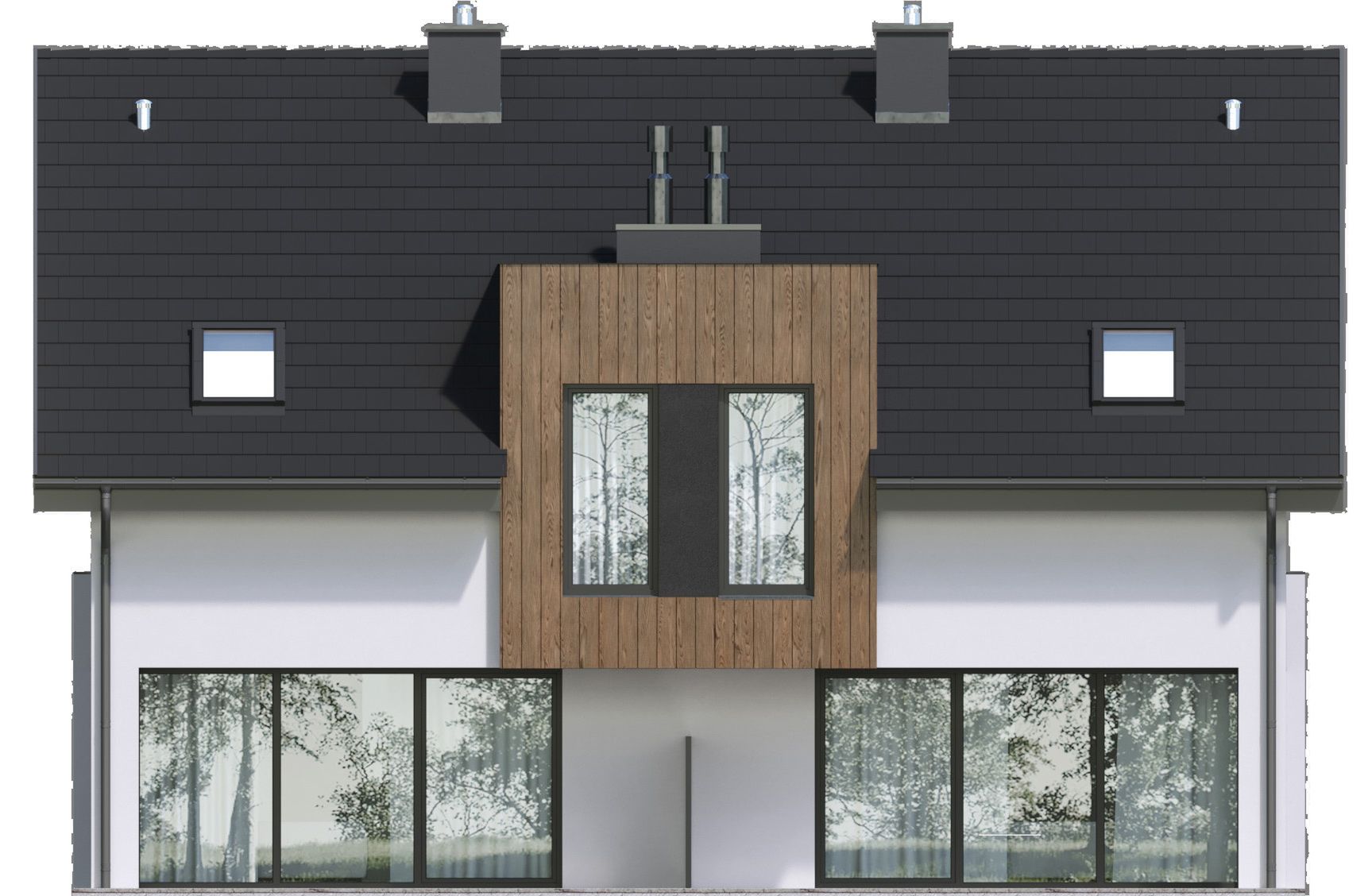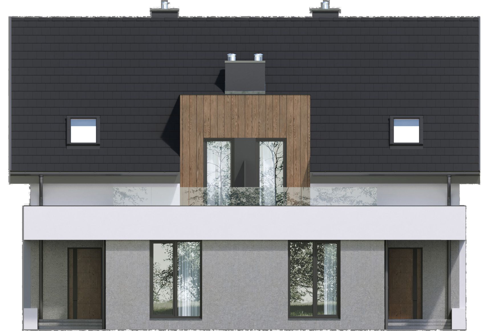 Graficzne opracowanie rzutów poglądowych widocznych na karcie projektu zostało wykonane przez Extradom.pl. Prezentowane przez Extradom.pl wizualizacje wykonane zostały przez autora projektu i należy poczytywać je jedynie za przykład i propozycję wykończenia, wizję architektoniczną autora projektu. Ostateczne wykończenie budynku może nastąpić na wiele sposobów. Szczegółowe rozwiązania zastosowane w oferowanej dokumentacji - w tym również ilość, lokalizacje i wygląd okien, drzwi, kominów - mogą w niewielkim stopniu różnić się od prezentowanej wizualizacji budynku.
