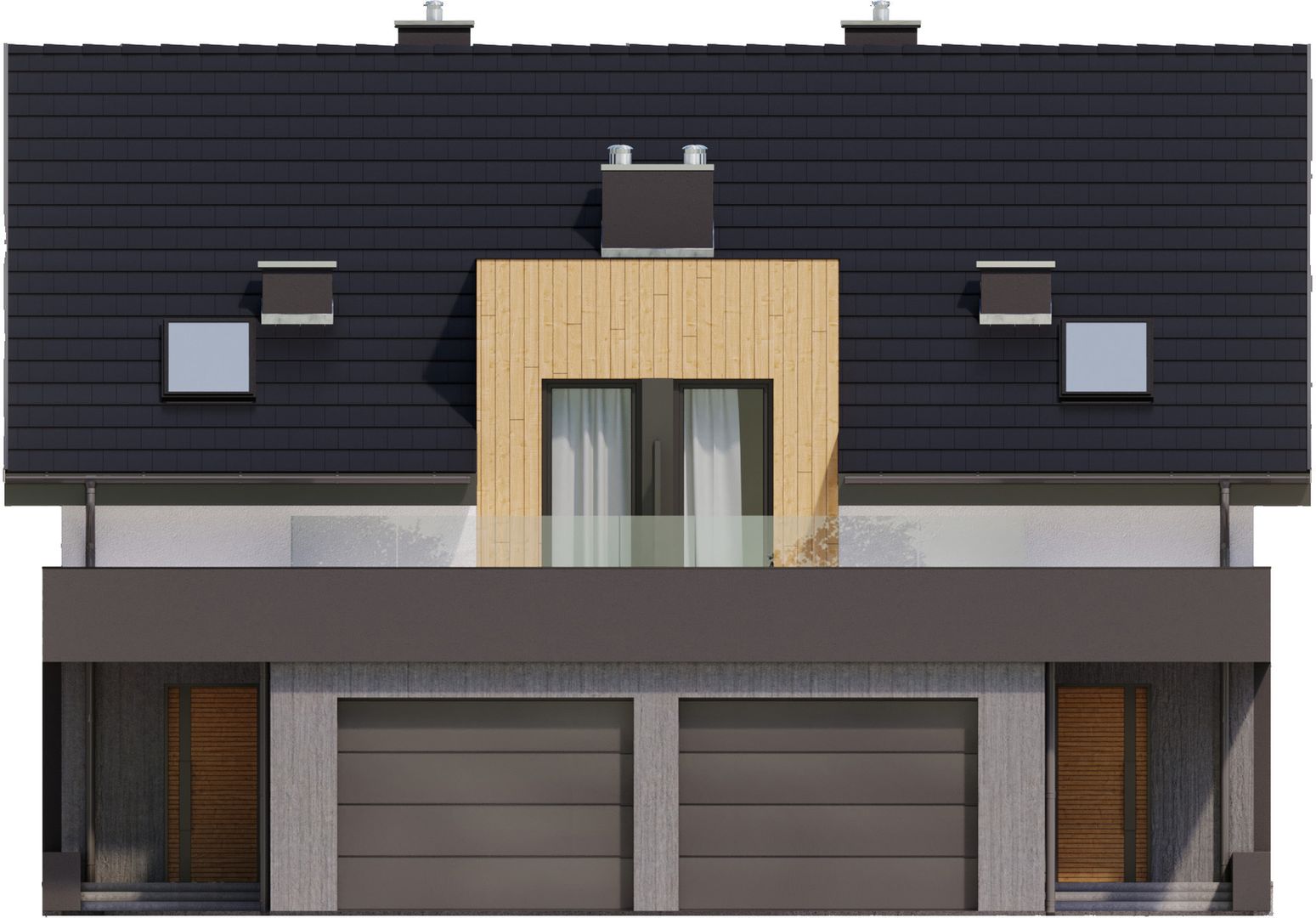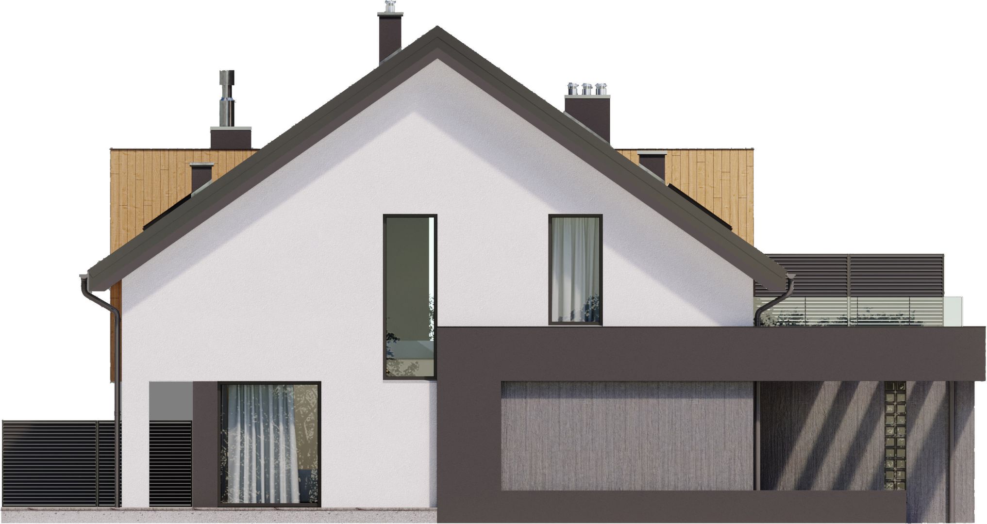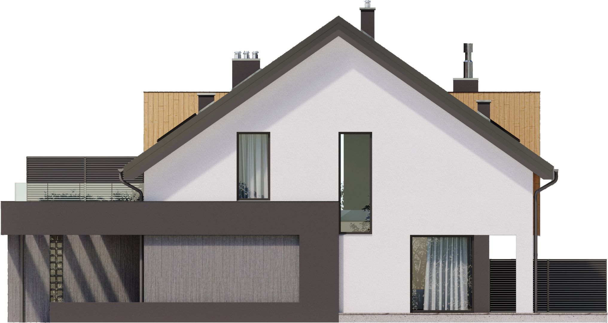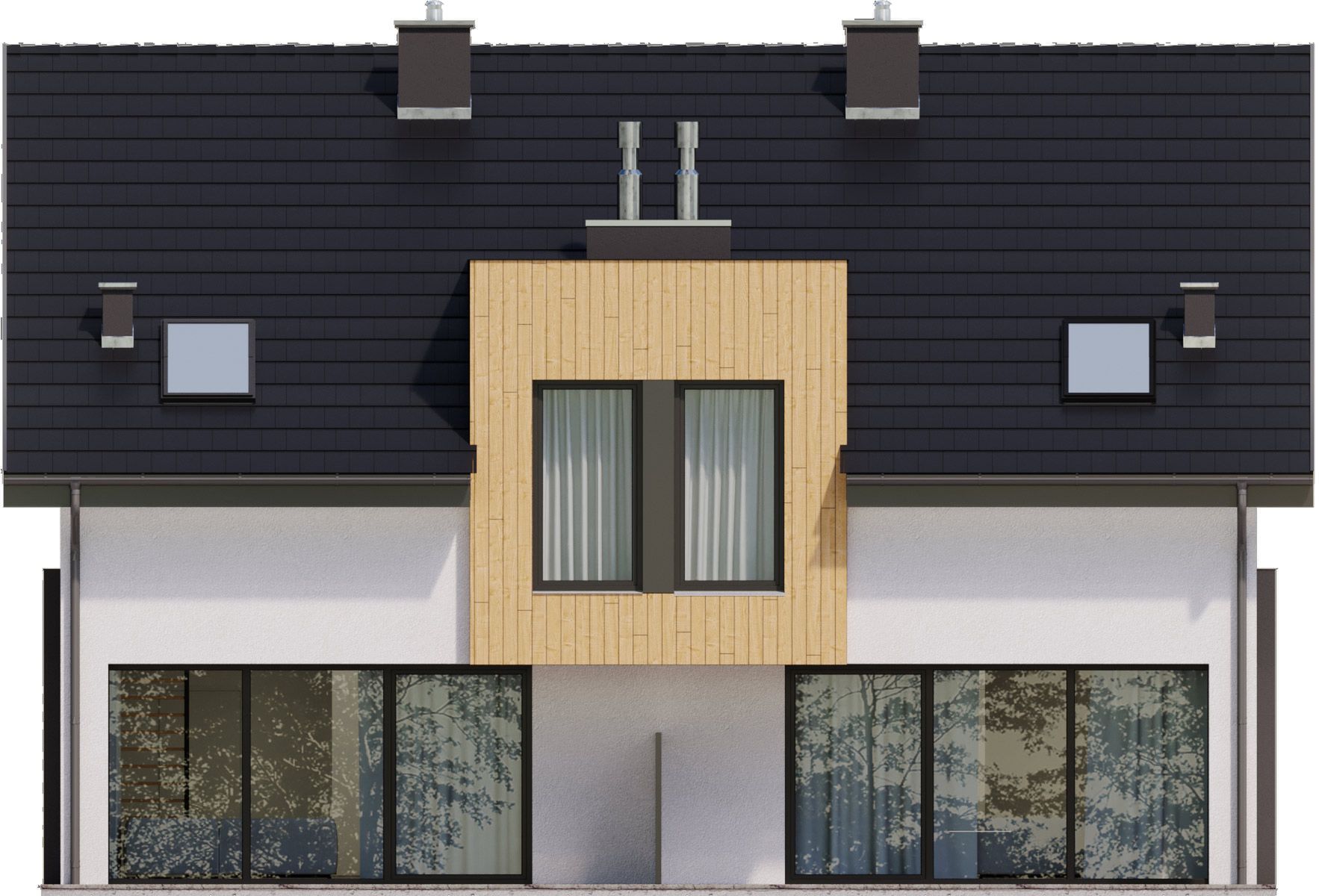 Graficzne opracowanie rzutów poglądowych widocznych na karcie projektu zostało wykonane przez Extradom.pl. Prezentowane przez Extradom.pl wizualizacje wykonane zostały przez autora projektu i należy poczytywać je jedynie za przykład i propozycję wykończenia, wizję architektoniczną autora projektu. Ostateczne wykończenie budynku może nastąpić na wiele sposobów. Szczegółowe rozwiązania zastosowane w oferowanej dokumentacji - w tym również ilość, lokalizacje i wygląd okien, drzwi, kominów - mogą w niewielkim stopniu różnić się od prezentowanej wizualizacji budynku.