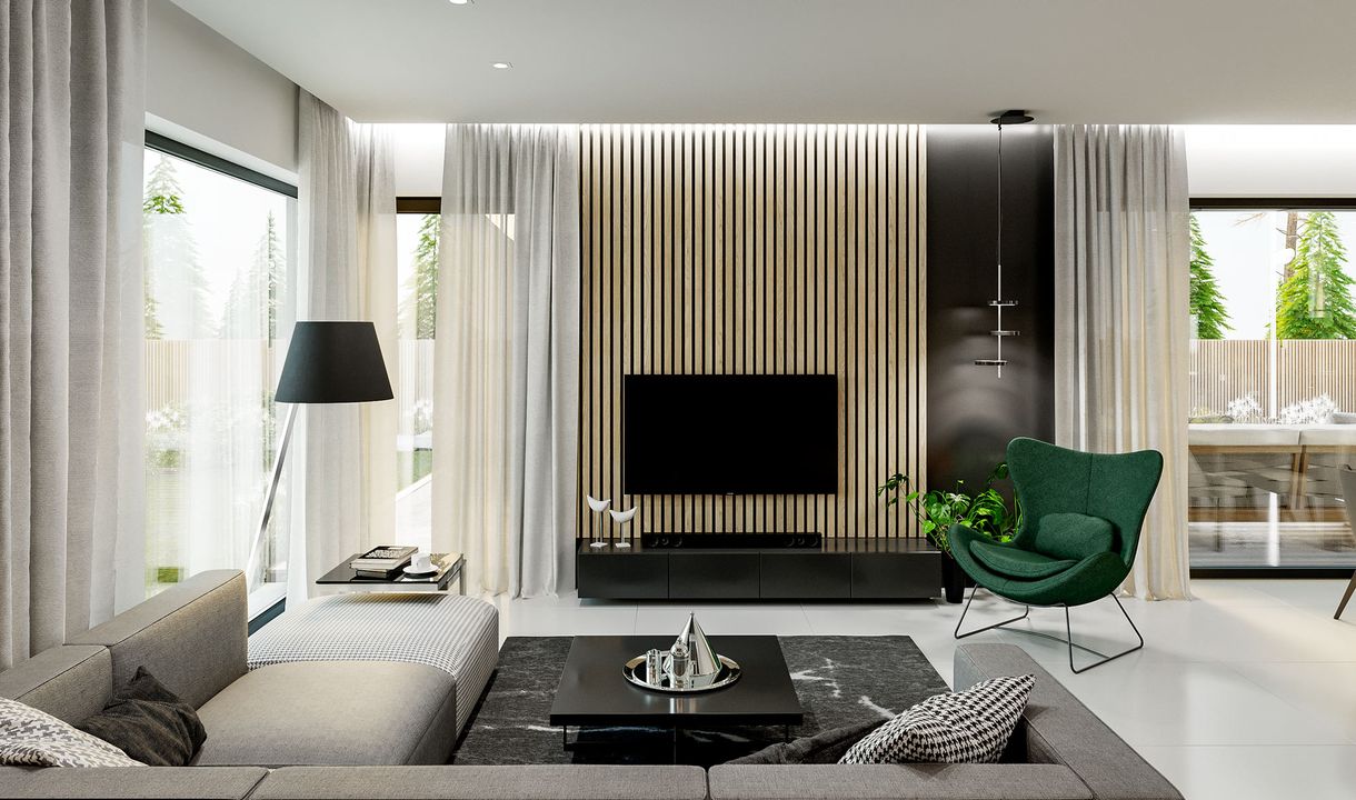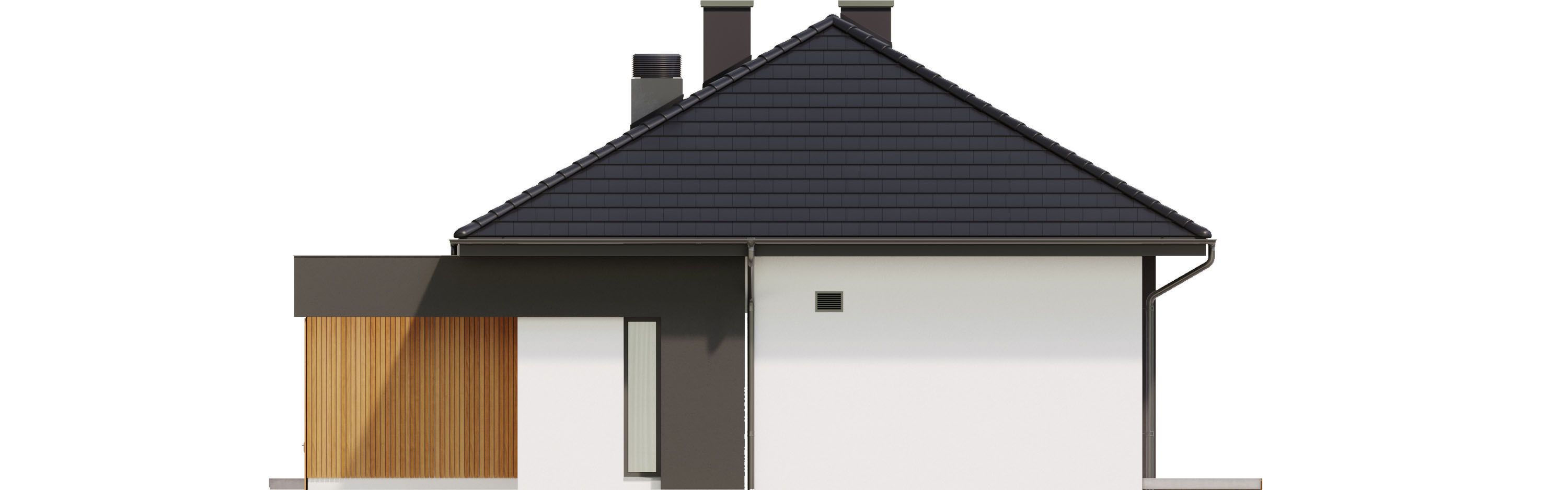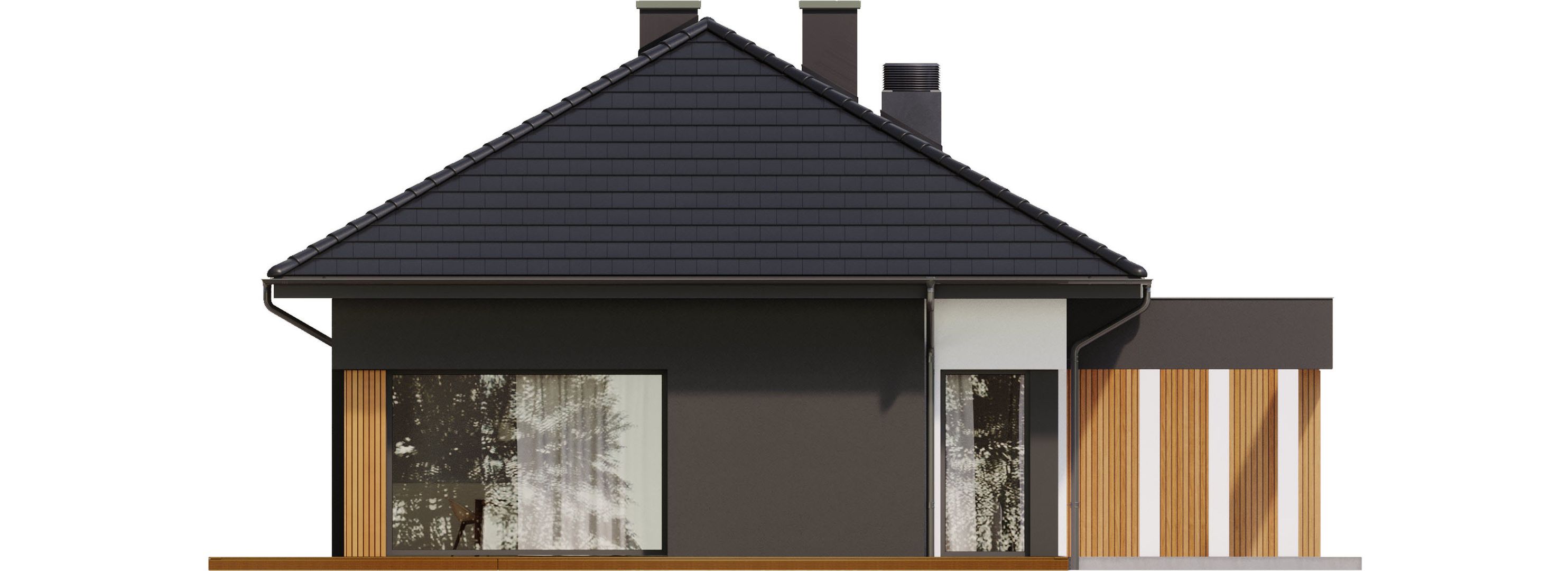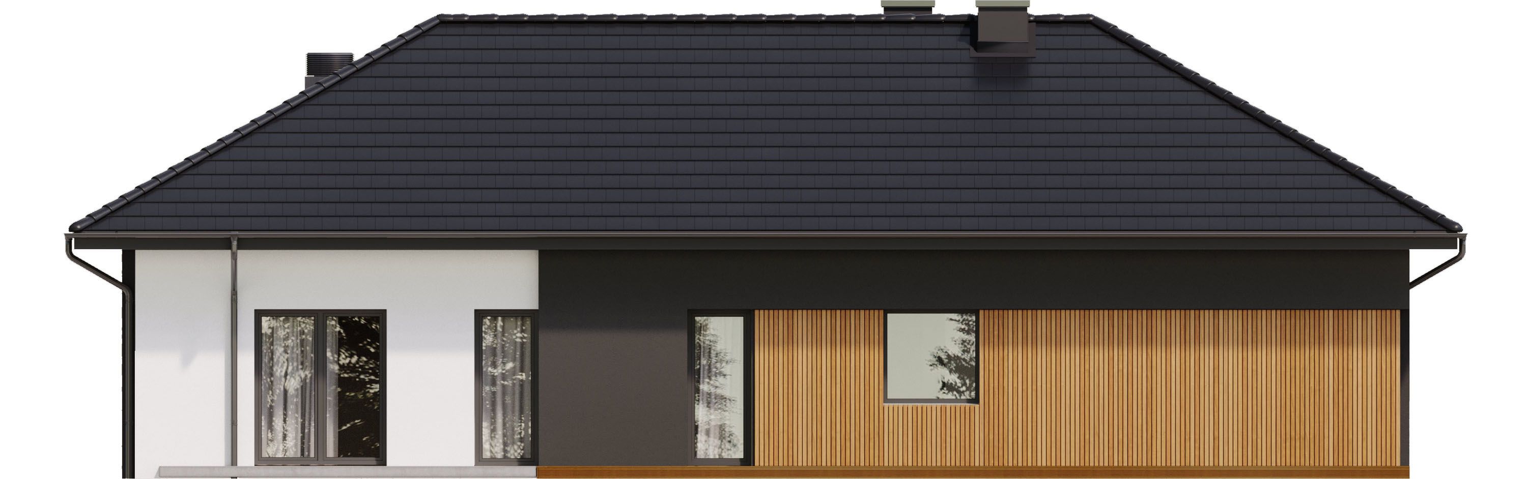 Graficzne opracowanie rzutów poglądowych widocznych na karcie projektu zostało wykonane przez Extradom.pl. Prezentowane przez Extradom.pl wizualizacje wykonane zostały przez autora projektu i należy poczytywać je jedynie za przykład i propozycję wykończenia, wizję architektoniczną autora projektu. Ostateczne wykończenie budynku może nastąpić na wiele sposobów. Szczegółowe rozwiązania zastosowane w oferowanej dokumentacji - w tym również ilość, lokalizacje i wygląd okien, drzwi, kominów - mogą w niewielkim stopniu różnić się od prezentowanej wizualizacji budynku.
