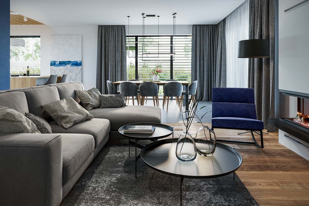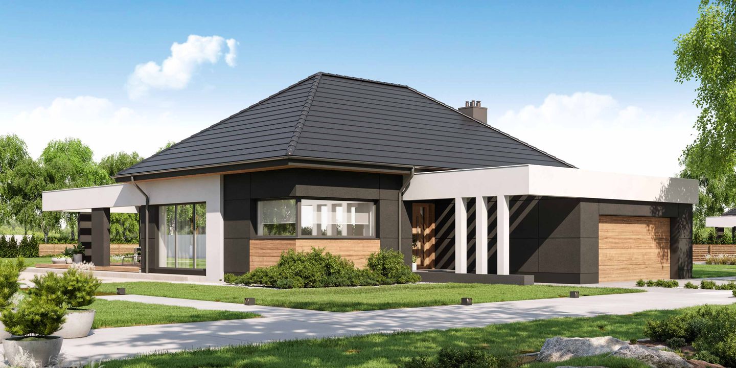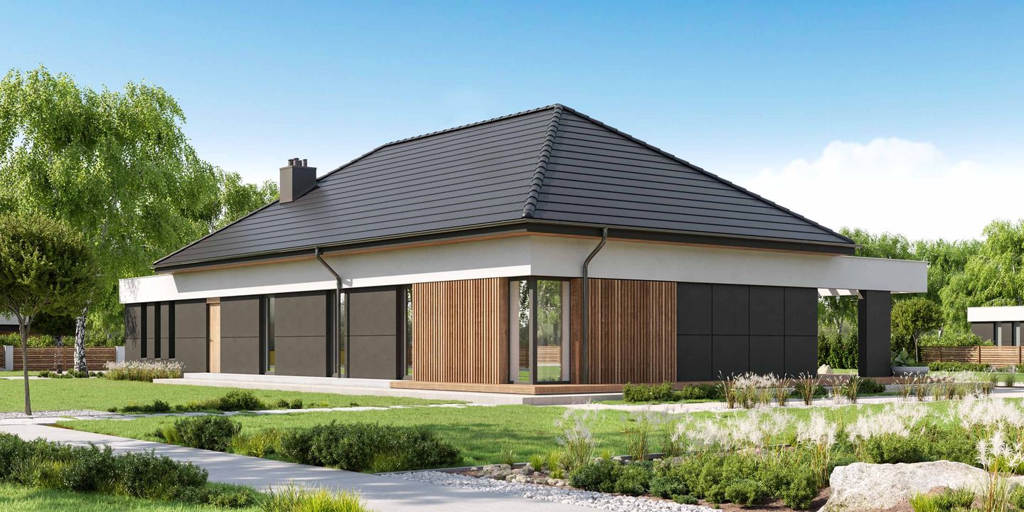 Graficzne opracowanie rzutów poglądowych widocznych na karcie projektu zostało wykonane przez Extradom.pl. Prezentowane przez Extradom.pl wizualizacje wykonane zostały przez autora projektu i należy poczytywać je jedynie za przykład i propozycję wykończenia, wizję architektoniczną autora projektu. Ostateczne wykończenie budynku może nastąpić na wiele sposobów. Szczegółowe rozwiązania zastosowane w oferowanej dokumentacji - w tym również ilość, lokalizacje i wygląd okien, drzwi, kominów - mogą w niewielkim stopniu różnić się od prezentowanej wizualizacji budynku.