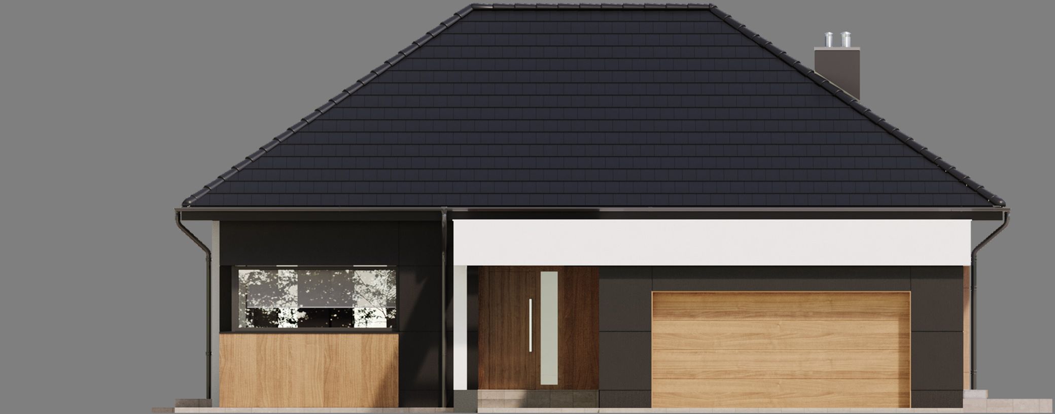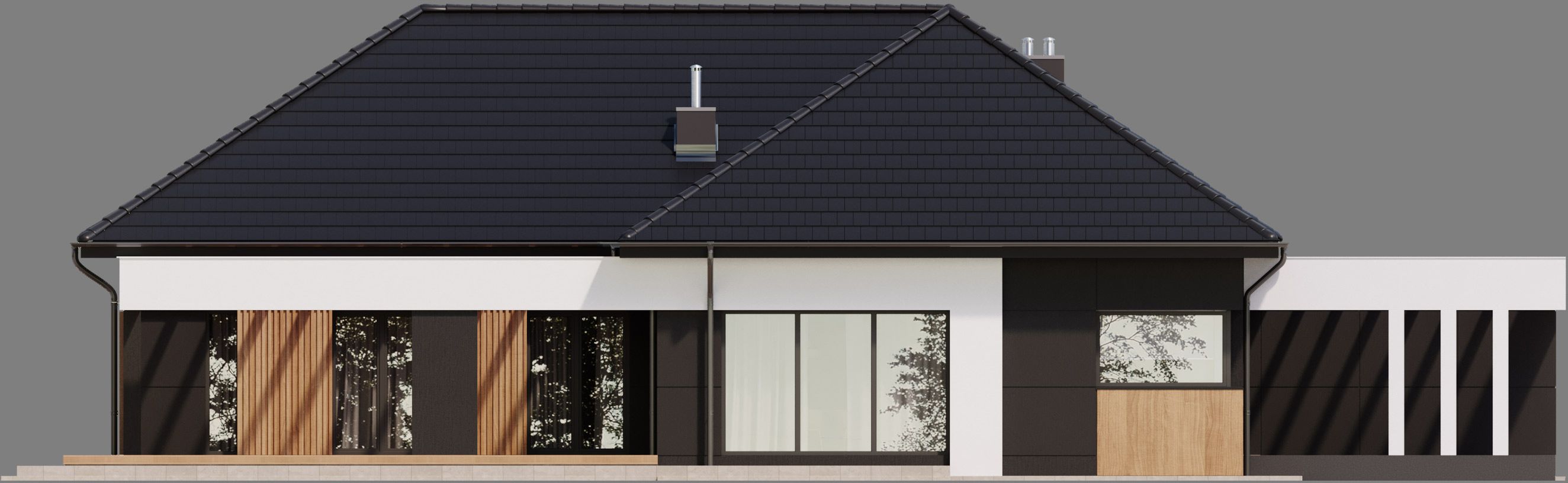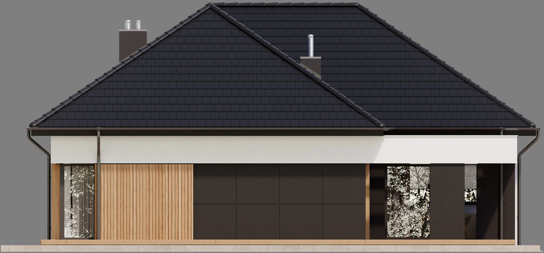Graficzne opracowanie rzutów poglądowych widocznych na karcie projektu zostało wykonane przez Extradom.pl. Prezentowane przez Extradom.pl wizualizacje wykonane zostały przez autora projektu i należy poczytywać je jedynie za przykład i propozycję wykończenia, wizję architektoniczną autora projektu. Ostateczne wykończenie budynku może nastąpić na wiele sposobów. Szczegółowe rozwiązania zastosowane w oferowanej dokumentacji - w tym również ilość, lokalizacje i wygląd okien, drzwi, kominów - mogą w niewielkim stopniu różnić się od prezentowanej wizualizacji budynku.