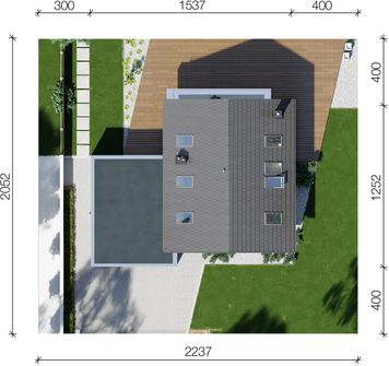Graficzne opracowanie rzutów poglądowych widocznych na karcie projektu zostało wykonane przez Extradom.pl. Prezentowane przez Extradom.pl wizualizacje wykonane zostały przez autora projektu i należy poczytywać je jedynie za przykład i propozycję wykończenia, wizję architektoniczną autora projektu. Ostateczne wykończenie budynku może nastąpić na wiele sposobów. Szczegółowe rozwiązania zastosowane w oferowanej dokumentacji - w tym również ilość, lokalizacje i wygląd okien, drzwi, kominów - mogą w niewielkim stopniu różnić się od prezentowanej wizualizacji budynku.