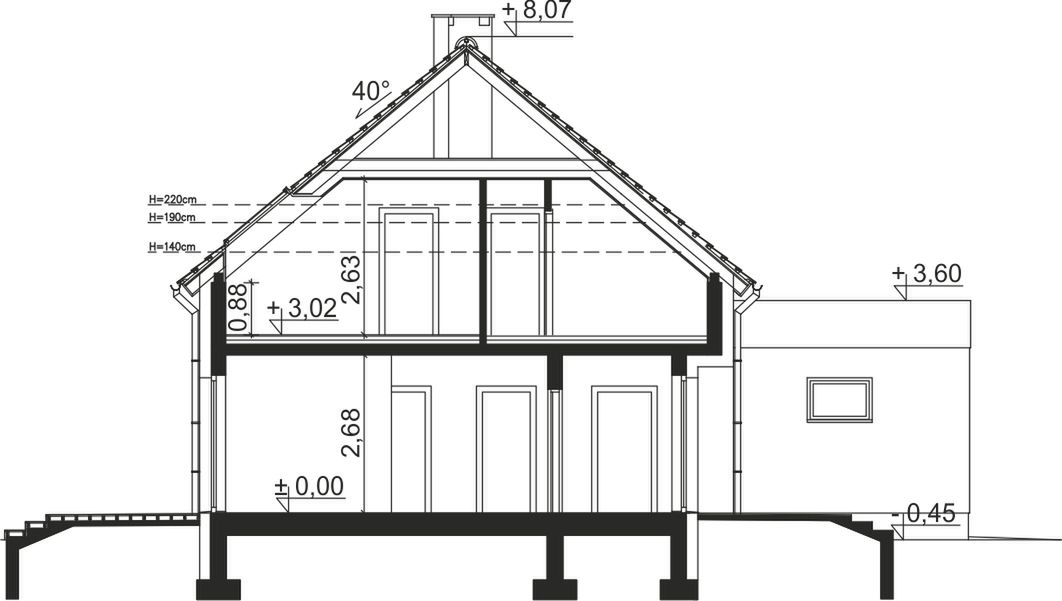 Budynek posadowiony został na fundamentach betonowych. Ściany zewnętrzne dwuwarstwowe z betonu komórkowego. Ściany wewnętrzne z betonu komórkowego jak i z płyty gipsowo-kartonowej [na ruszcie]. Strop żelbetowy-wylewany. Więźba dachowa drewniana. Pokrycie dachu - dachówka ceramiczna lub cementowa. Ogrzewanie gazowe lub na paliwo stałe. Wentylacja grawitacyjna + jako alternatywa: wentylacja mechaniczna z rekuperacją.