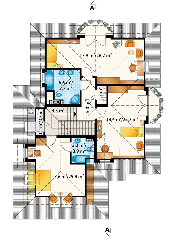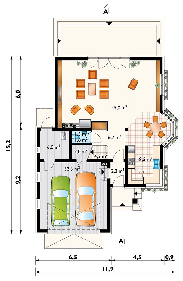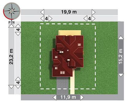 Graficzne opracowanie rzutów poglądowych widocznych na karcie projektu zostało wykonane przez Extradom.pl. Prezentowane przez Extradom.pl wizualizacje wykonane zostały przez autora projektu i należy poczytywać je jedynie za przykład i propozycję wykończenia, wizję architektoniczną autora projektu. Ostateczne wykończenie budynku może nastąpić na wiele sposobów. Szczegółowe rozwiązania zastosowane w oferowanej dokumentacji - w tym również ilość, lokalizacje i wygląd okien, drzwi, kominów - mogą w niewielkim stopniu różnić się od prezentowanej wizualizacji budynku.