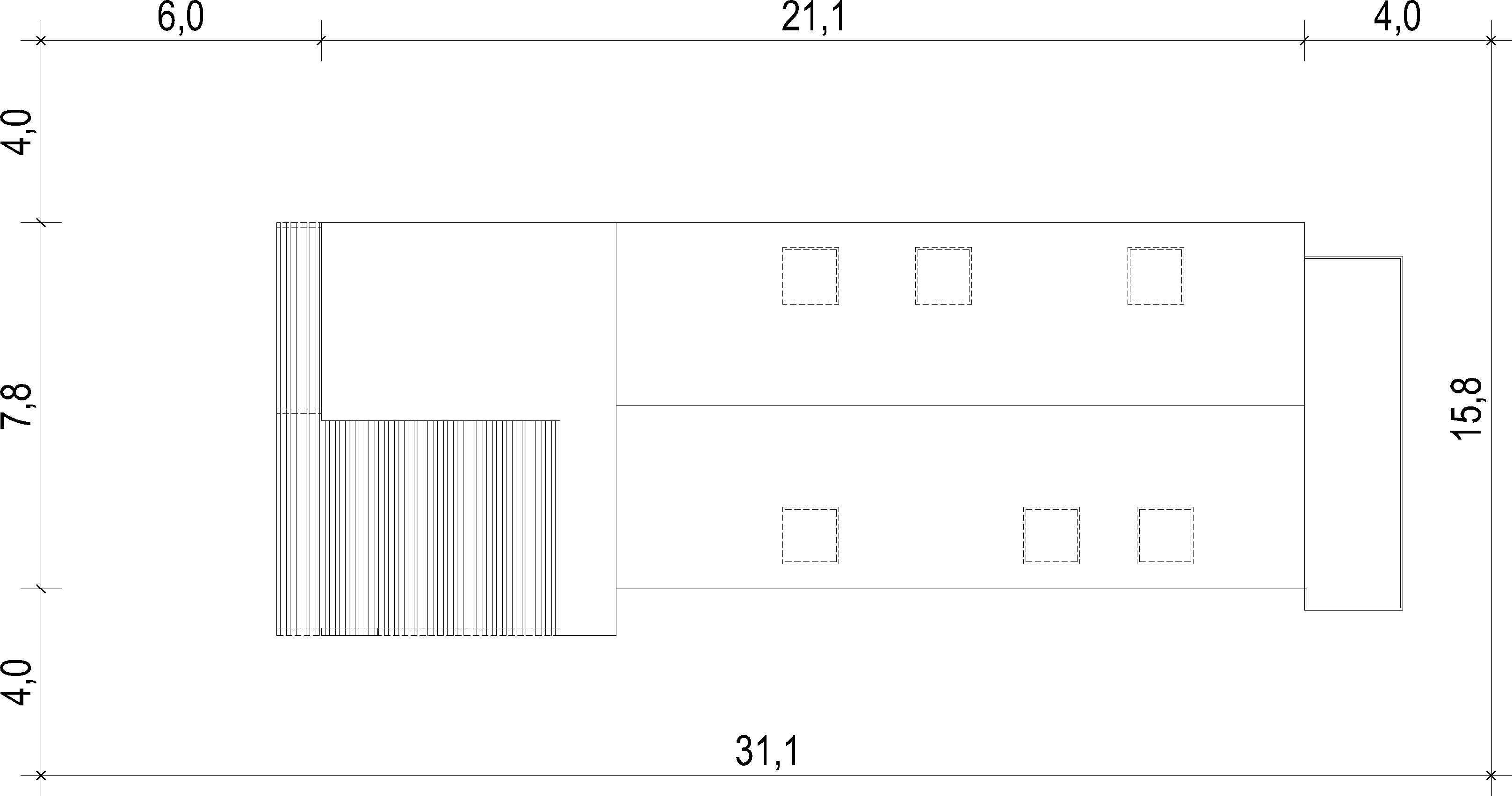 Ściany: bloczek silikatowy + izolacja termiczna 20 cm. Posadowienie: ławy fundamentowe. Stropy: żelbetowe prefabrykowane filigran. Dach: blacha cynkowo – tytanowa na rąbek stojący. Elewacje: płytka ceglana elewacyjna, tynk.