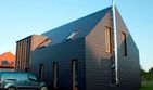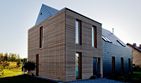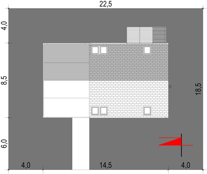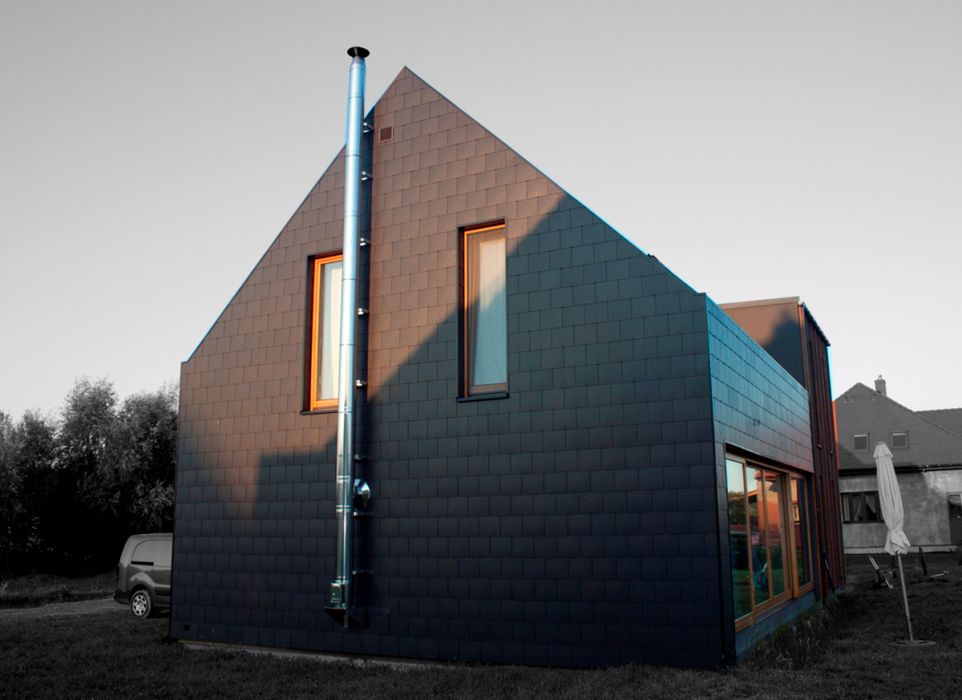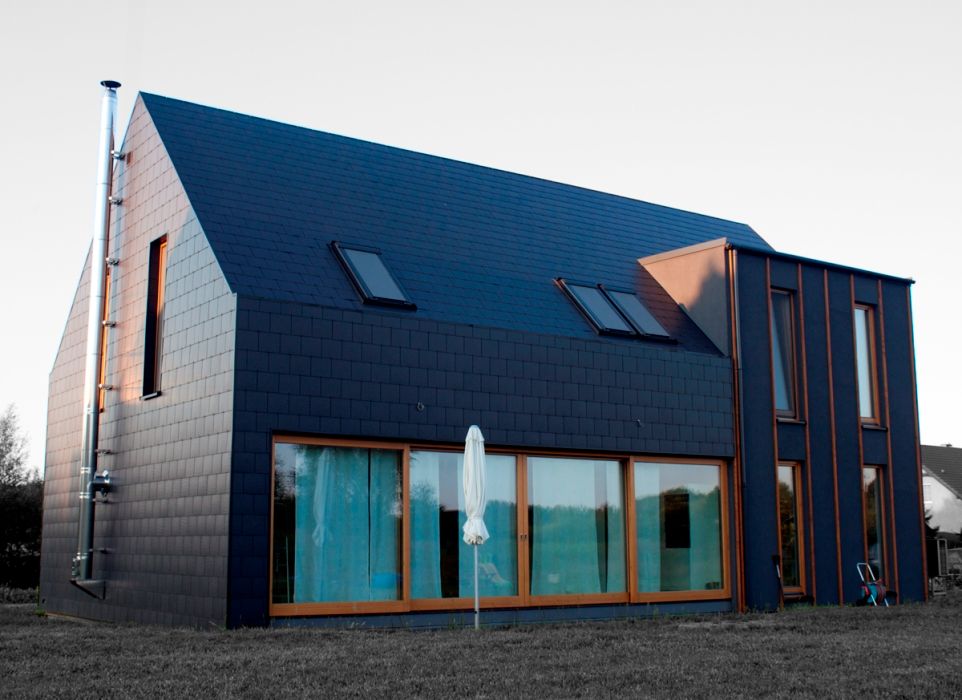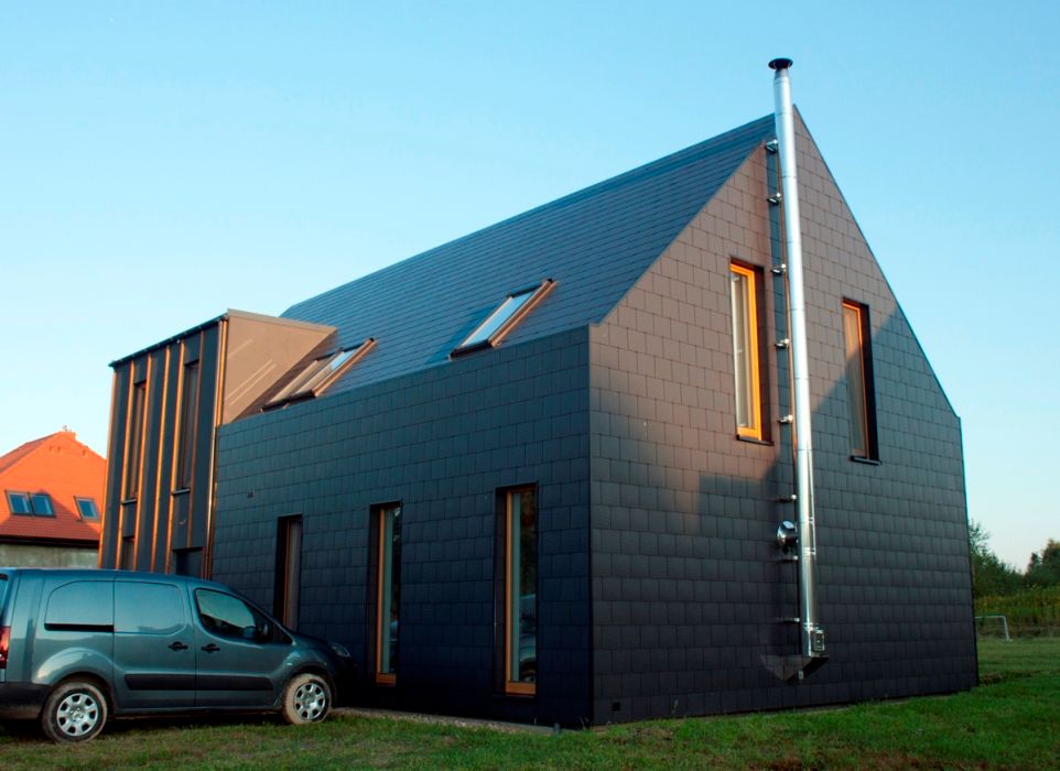 Ściany dwuwarstwowe: bloczek gazobetonowy + izolacja termiczna 20 cm. Stropy: żelbetowe płyty prefabrykowane. Dach: dwuspadowy. Pokrycie dachu: płytka włóknocementowa. Elewacje: płytka włóknocementowa, deska elewacyjna.