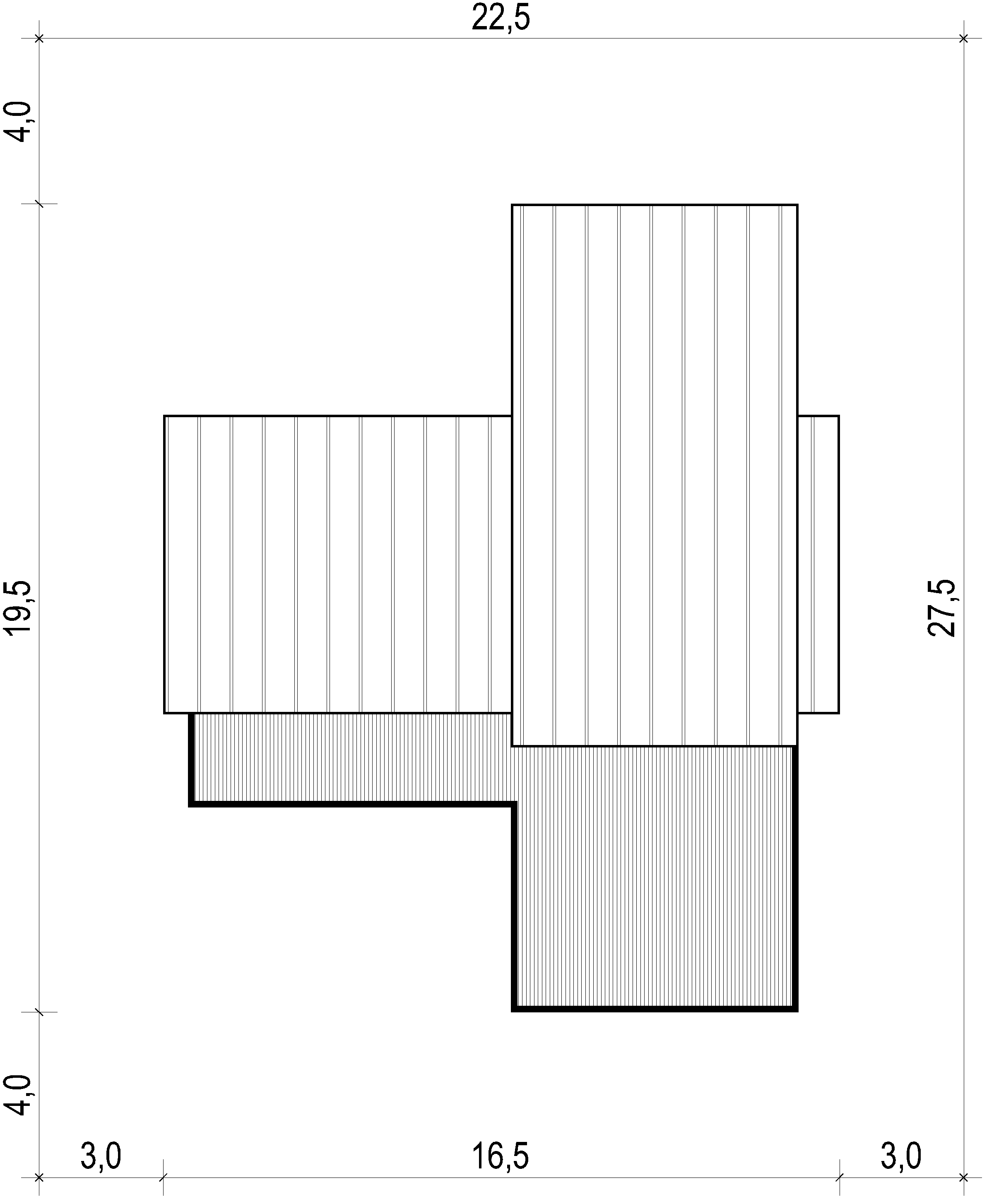 Płyta fundamentowa. Stropy: prefabrykowane płytowe. Ściany: bloczek silikatowy + izolacja termiczna 20 cm. Konstrukcja dachu: konstrukcja drewniana. Pokrycie: blacha. Elewacje włókno cementowe lub blacha. Kąty nachylenia połaci dachowych: 13 i 16 °.