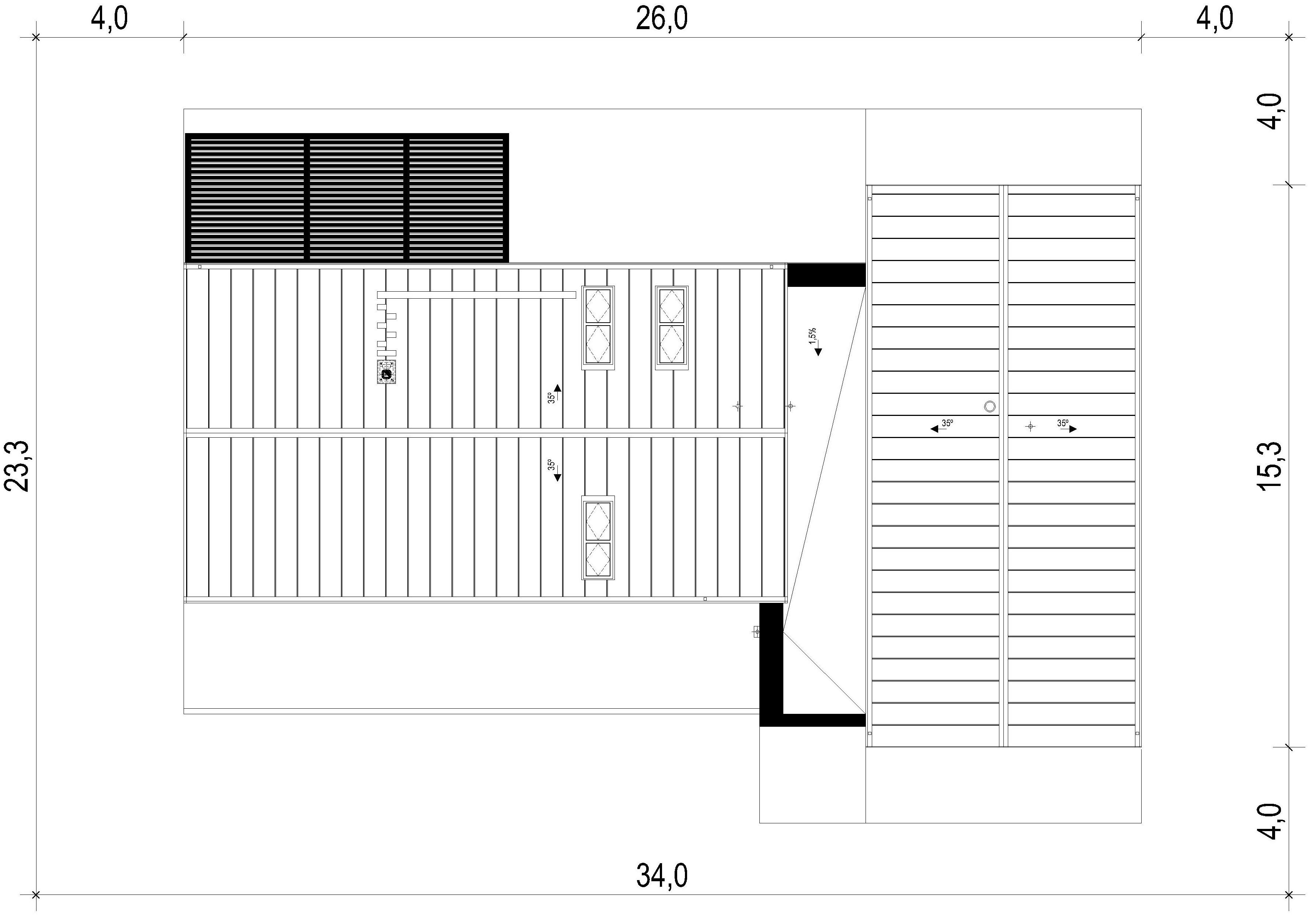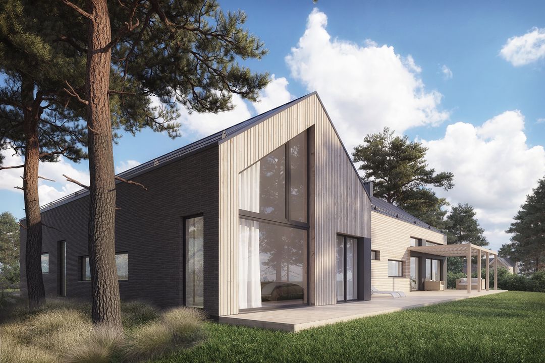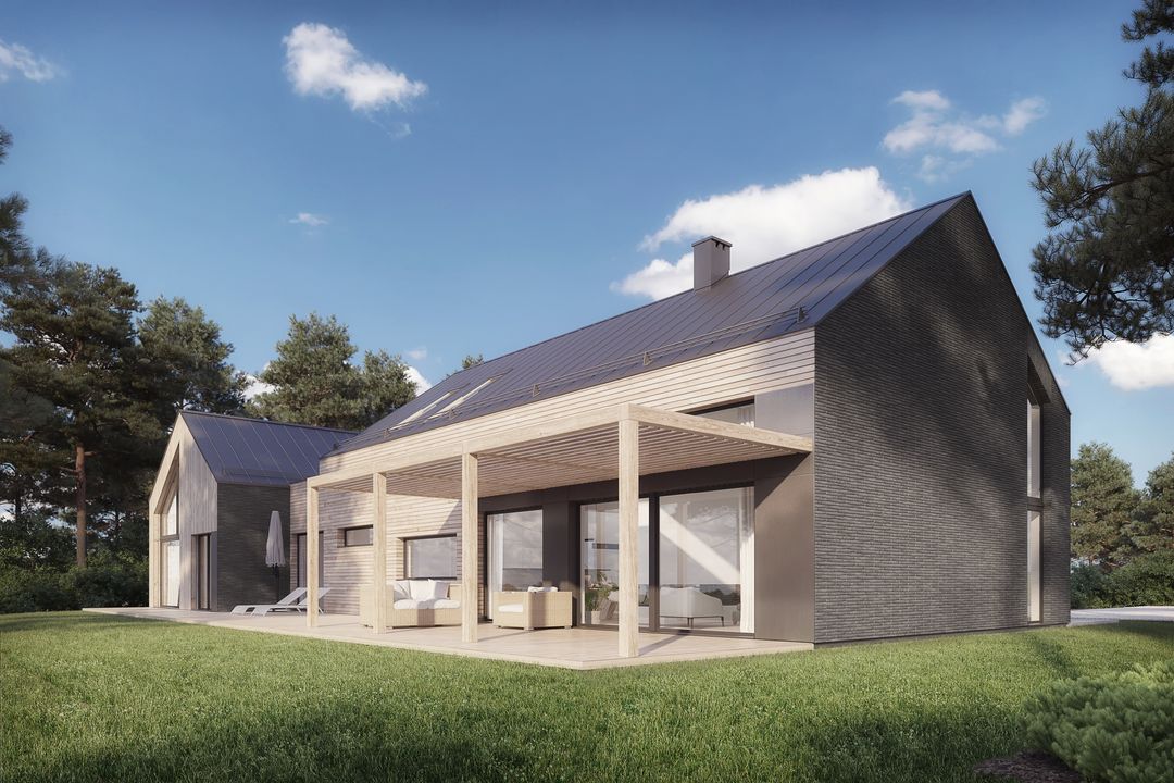 Ściany: bloczek silikatowy + izolacja termiczna 20 cm posadowienie. Ławy fundamentowe. Stropy: żelbetowe prefabrykowane filigran. Dach: blacha tytanowo-cynkowa, ułożenie na podwójny rąbek stojący. Elewacje: deska elewacyjna: modrzew syberyjski / cegła klinkierowa WIENERBERGER LONG JOHN GREY.