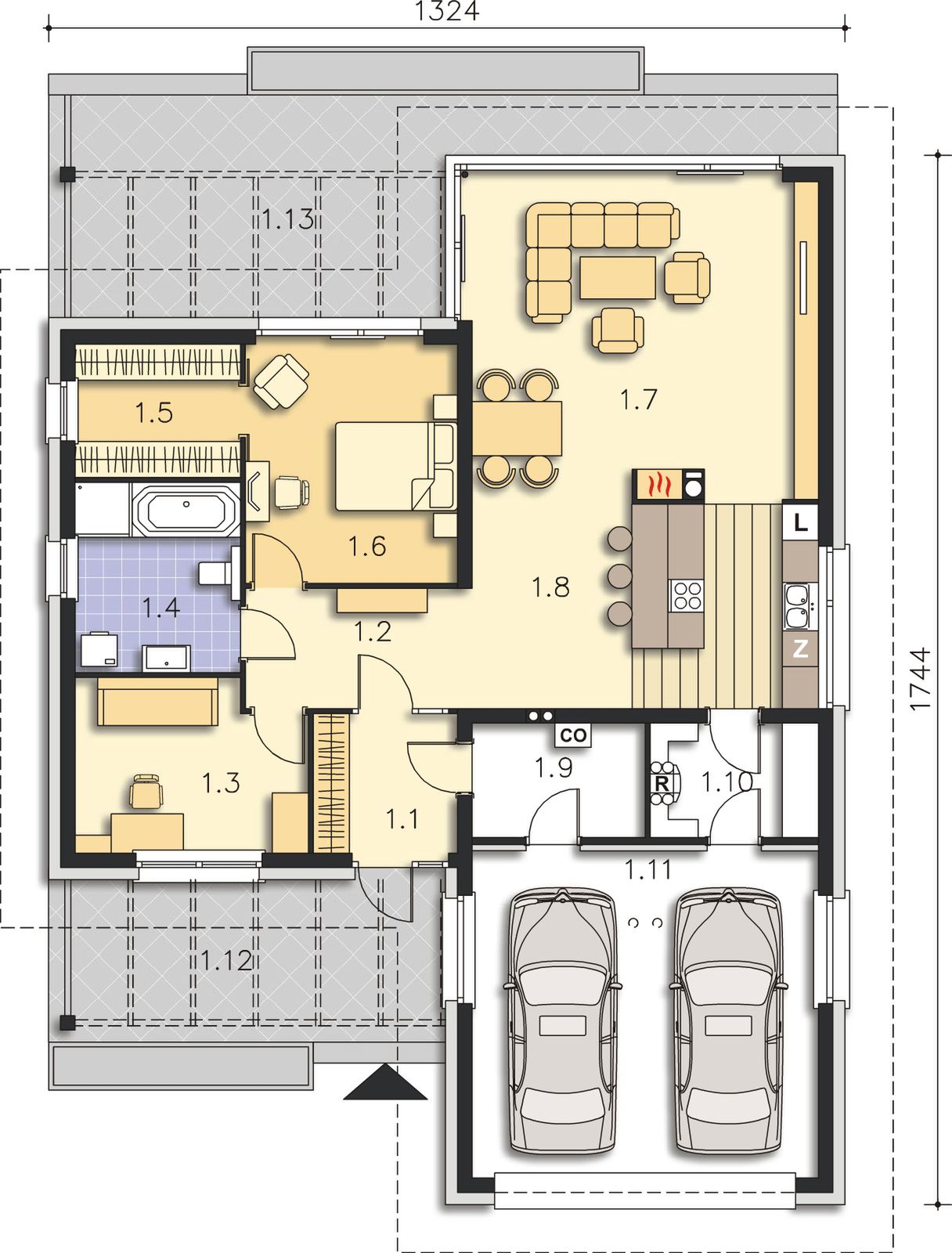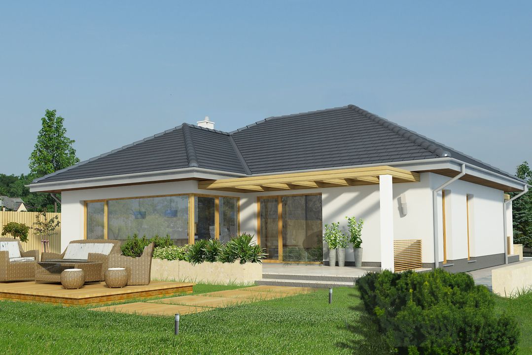 Graficzne opracowanie rzutów poglądowych widocznych na karcie projektu zostało wykonane przez Extradom.pl. Prezentowane przez Extradom.pl wizualizacje wykonane zostały przez autora projektu i należy poczytywać je jedynie za przykład i propozycję wykończenia, wizję architektoniczną autora projektu. Ostateczne wykończenie budynku może nastąpić na wiele sposobów. Szczegółowe rozwiązania zastosowane w oferowanej dokumentacji - w tym również ilość, lokalizacje i wygląd okien, drzwi, kominów - mogą w niewielkim stopniu różnić się od prezentowanej wizualizacji budynku.
