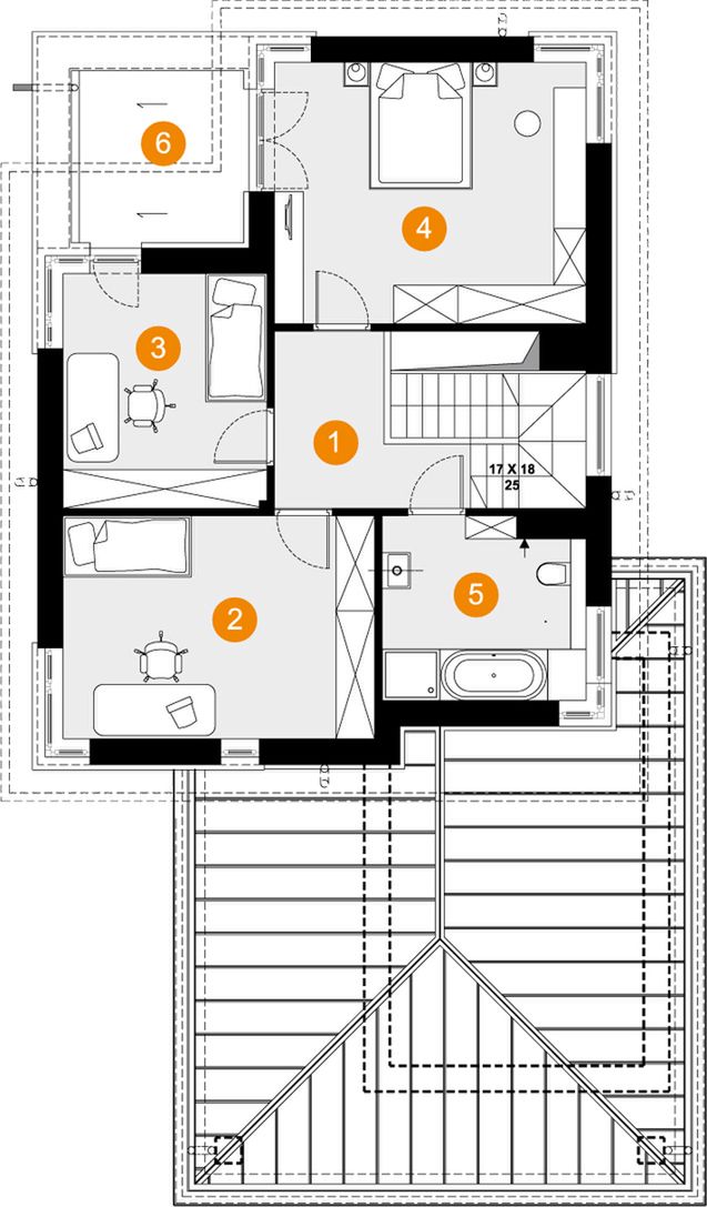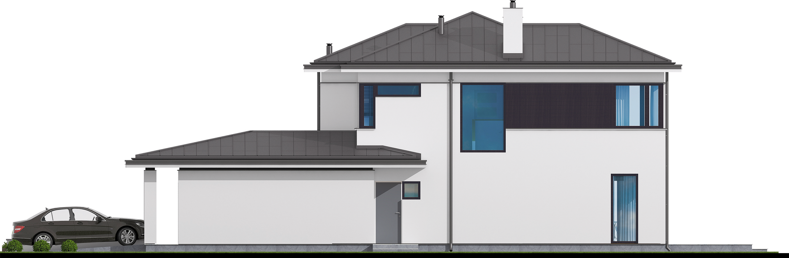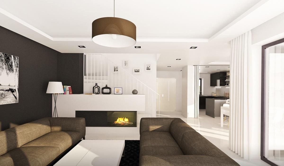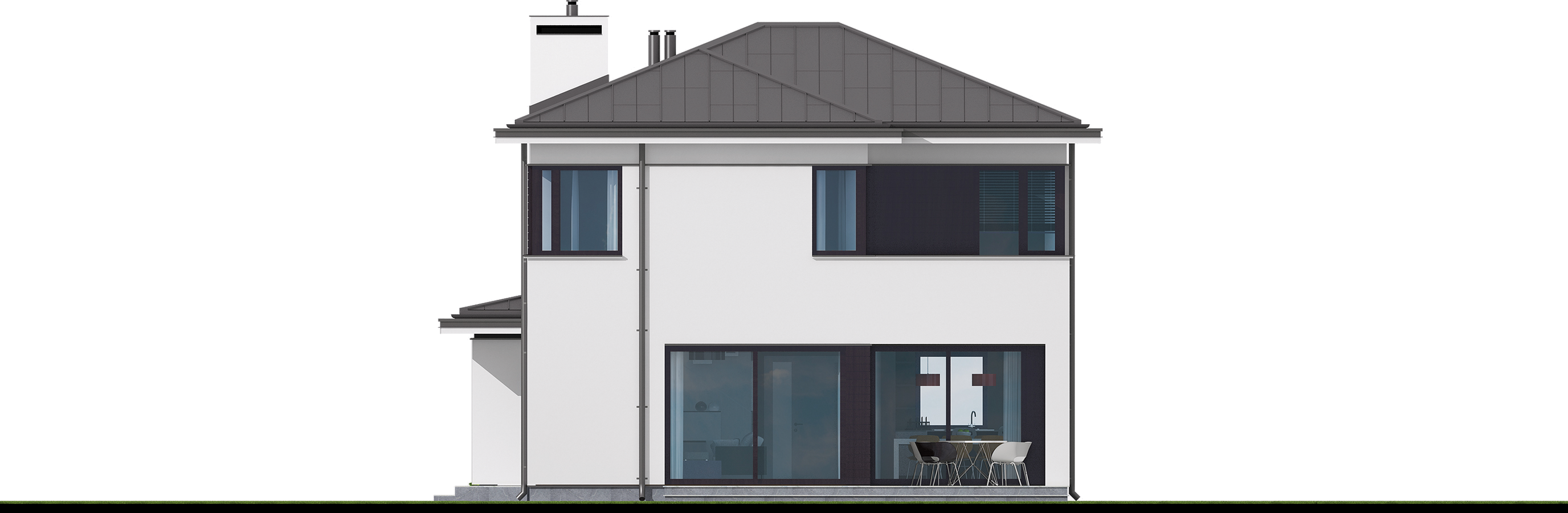 Graficzne opracowanie rzutów poglądowych widocznych na karcie projektu zostało wykonane przez Extradom.pl. Prezentowane przez Extradom.pl wizualizacje wykonane zostały przez autora projektu i należy poczytywać je jedynie za przykład i propozycję wykończenia, wizję architektoniczną autora projektu. Ostateczne wykończenie budynku może nastąpić na wiele sposobów. Szczegółowe rozwiązania zastosowane w oferowanej dokumentacji - w tym również ilość, lokalizacje i wygląd okien, drzwi, kominów - mogą w niewielkim stopniu różnić się od prezentowanej wizualizacji budynku.