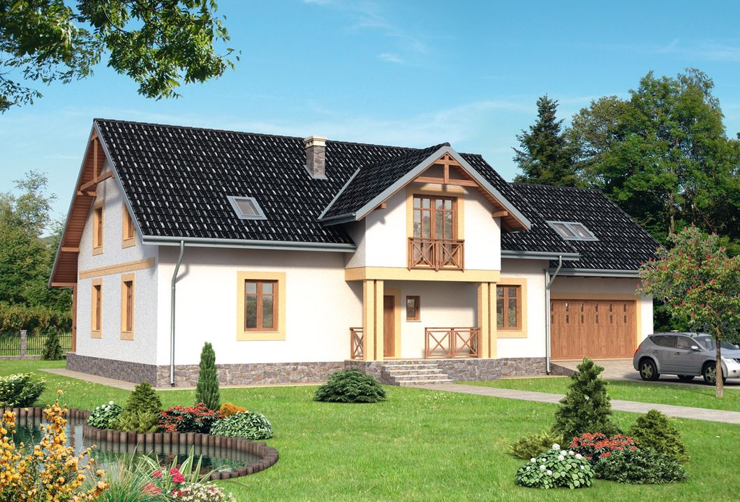 Graficzne opracowanie rzutów poglądowych widocznych na karcie projektu zostało wykonane przez Extradom.pl. Prezentowane przez Extradom.pl wizualizacje wykonane zostały przez autora projektu i należy poczytywać je jedynie za przykład i propozycję wykończenia, wizję architektoniczną autora projektu. Ostateczne wykończenie budynku może nastąpić na wiele sposobów. Szczegółowe rozwiązania zastosowane w oferowanej dokumentacji - w tym również ilość, lokalizacje i wygląd okien, drzwi, kominów - mogą w niewielkim stopniu różnić się od prezentowanej wizualizacji budynku.