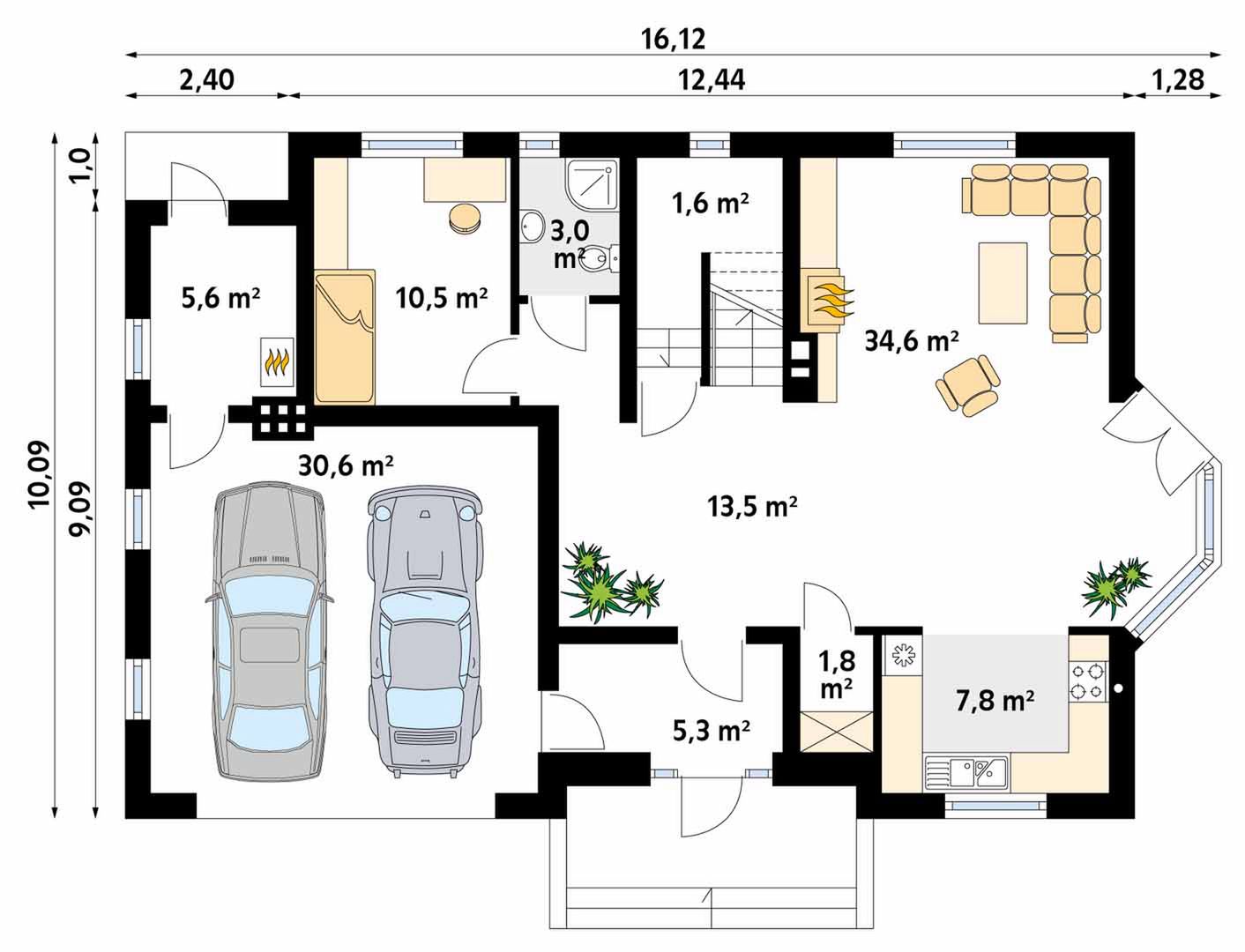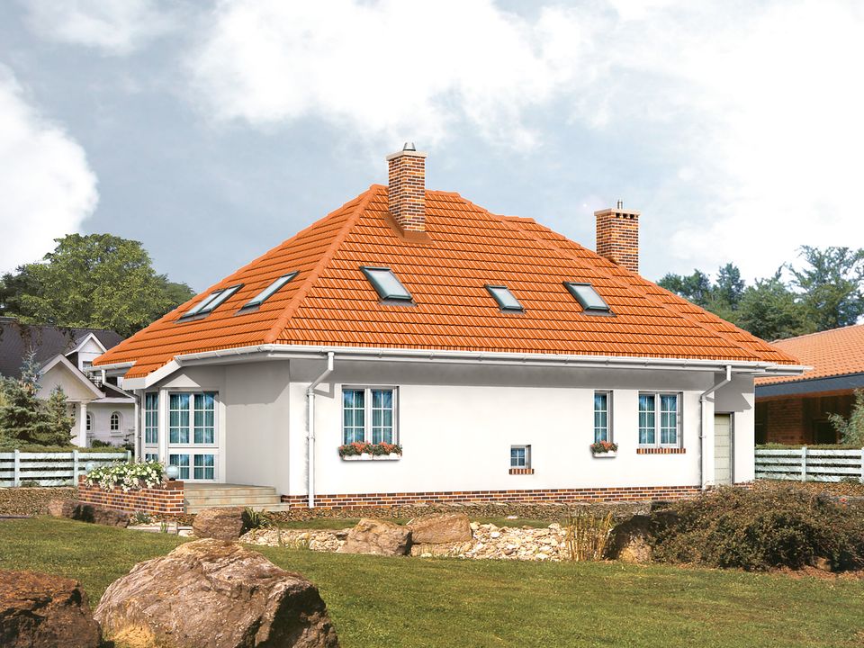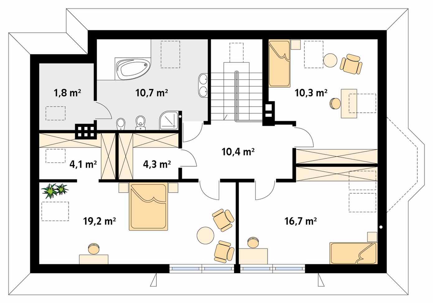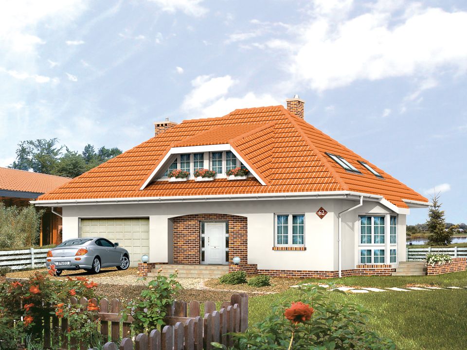 Graficzne opracowanie rzutów poglądowych widocznych na karcie projektu zostało wykonane przez Extradom.pl. Prezentowane przez Extradom.pl wizualizacje wykonane zostały przez autora projektu i należy poczytywać je jedynie za przykład i propozycję wykończenia, wizję architektoniczną autora projektu. Ostateczne wykończenie budynku może nastąpić na wiele sposobów. Szczegółowe rozwiązania zastosowane w oferowanej dokumentacji - w tym również ilość, lokalizacje i wygląd okien, drzwi, kominów - mogą w niewielkim stopniu różnić się od prezentowanej wizualizacji budynku.